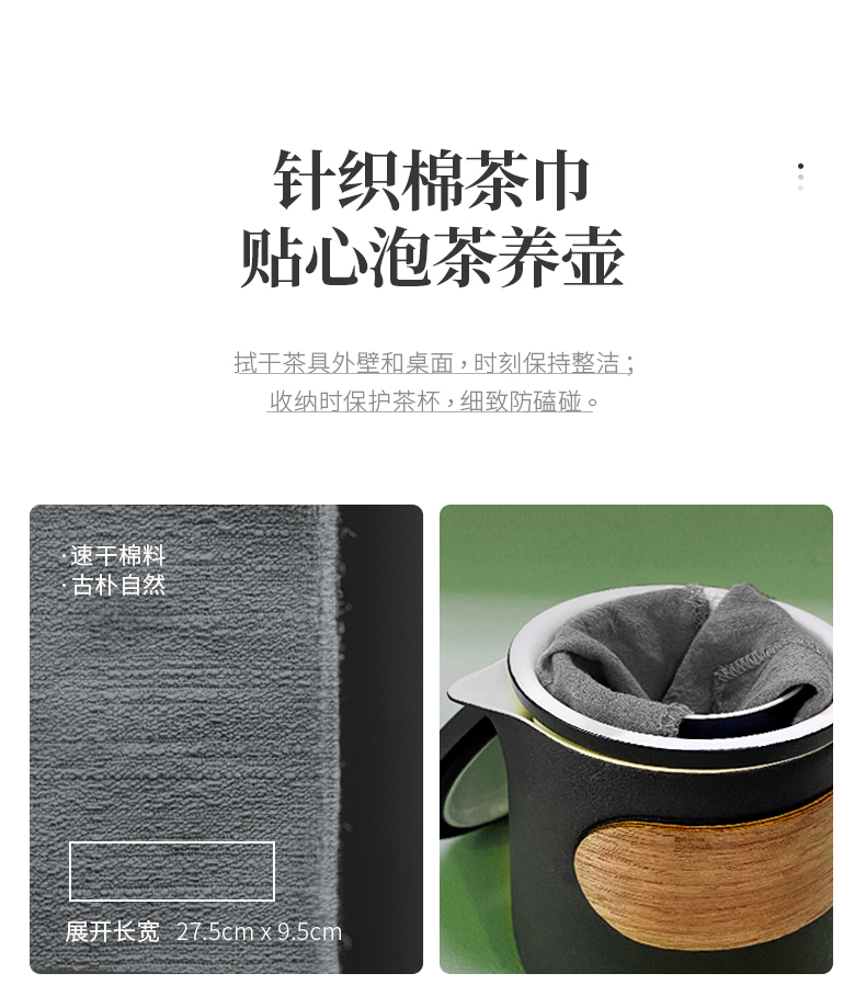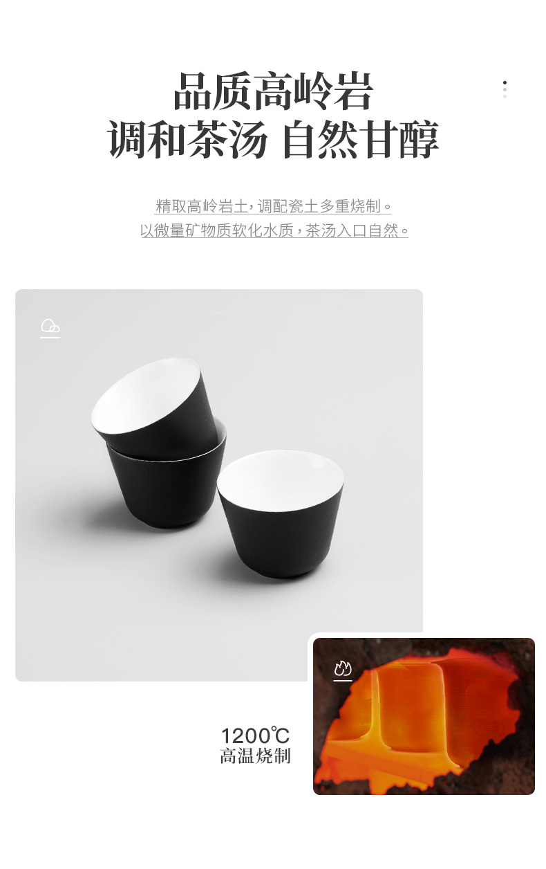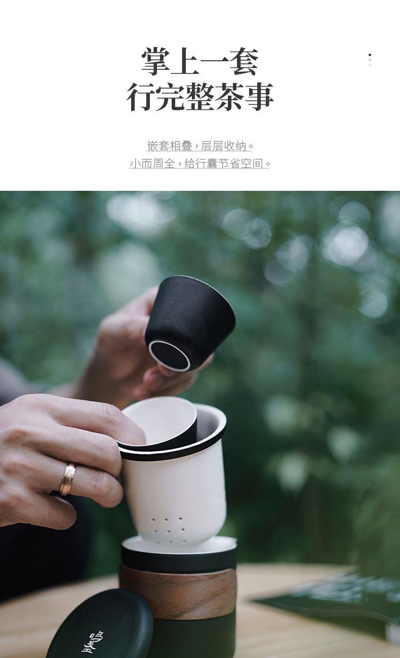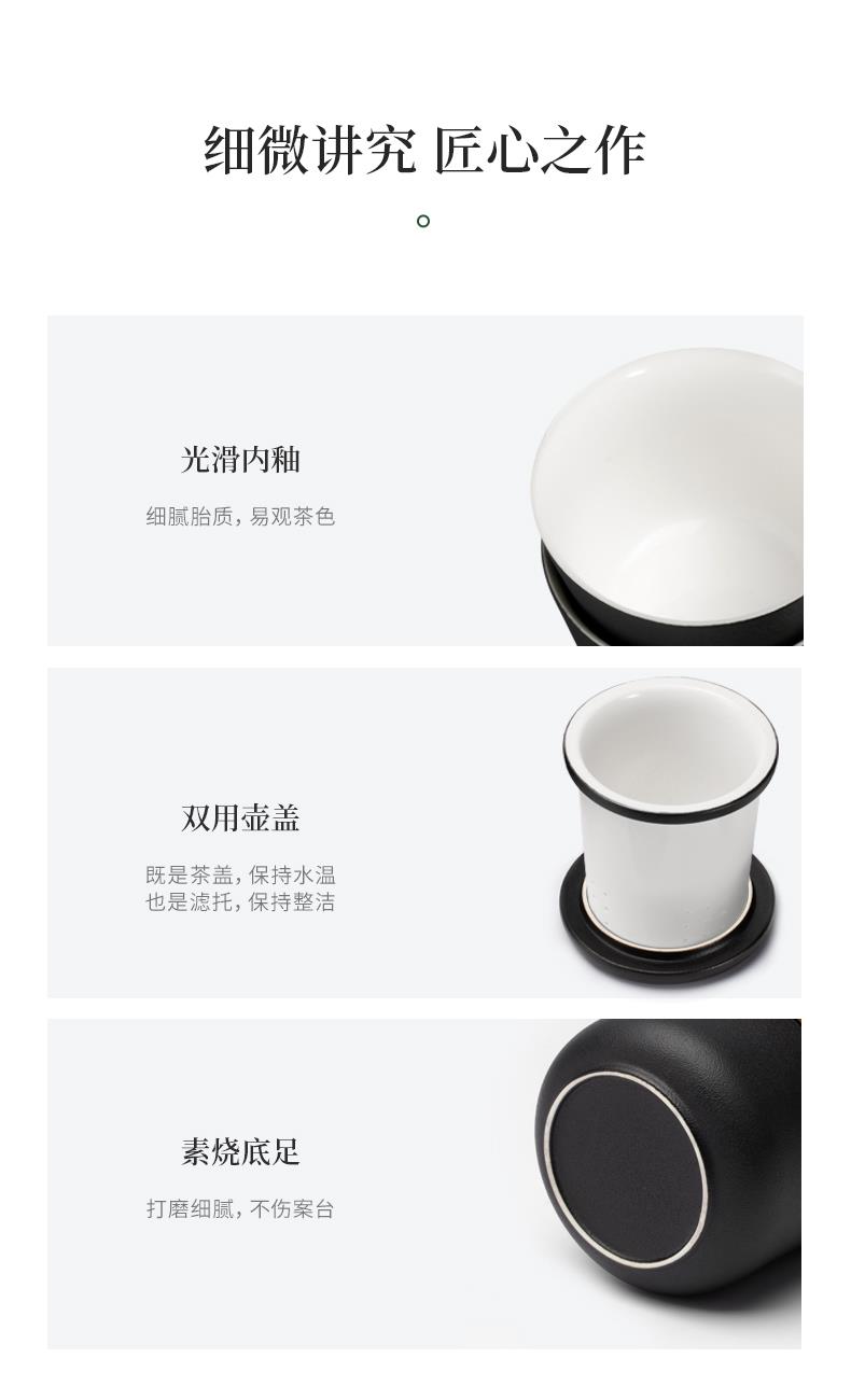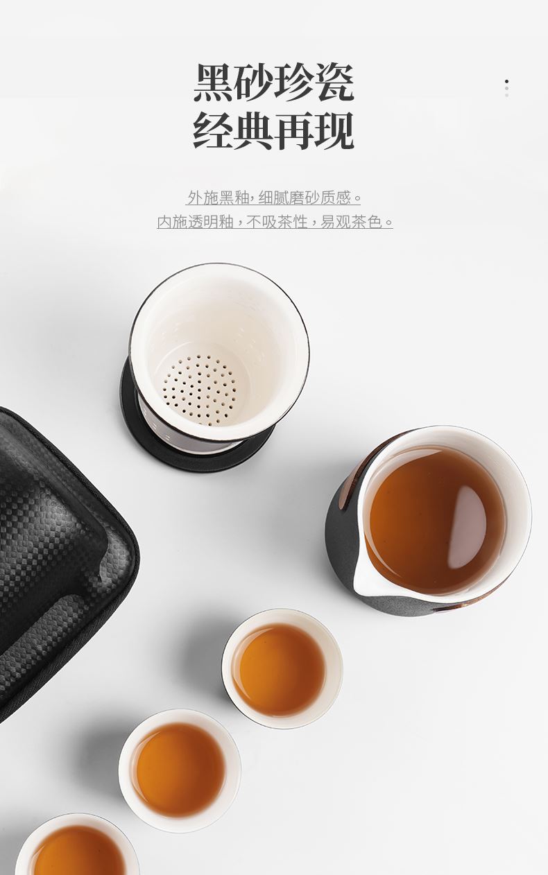 产品容量:茶海250mL/茶杯35mL 产品颜色:曜岩黑 产品尺寸:彩盒135Lx100Wx98H/邮盒200Lx140Wx156H 整体:90×80×100/茶海:90×81×87/茶漏:Φ80×82/茶盖:Φ78×12/茶杯:Φ55×42 产品重量:产品净重0.63kg/邮盒毛重0.9kg 材质:陶瓷、曲木、EVA 标准配件:茶海*1、茶漏*1、茶盖*1、茶杯*3、茶巾*1、便携包*1 为茶客出行设计的便捷品茶套装。使用嵌套式设计,一个茶壶收纳茶杯茶滤全套茶具,拎包即可出门泡茶。为保留茶席上的仪式感,茶器选用德化瓷土烧制,表面有保留磨砂黑釉的原始质感。泡茶壶上贴心加上防烫木纹饰片,并内置大容量的茶滤用于茶水分离,在户外还原茶室的专业体验。