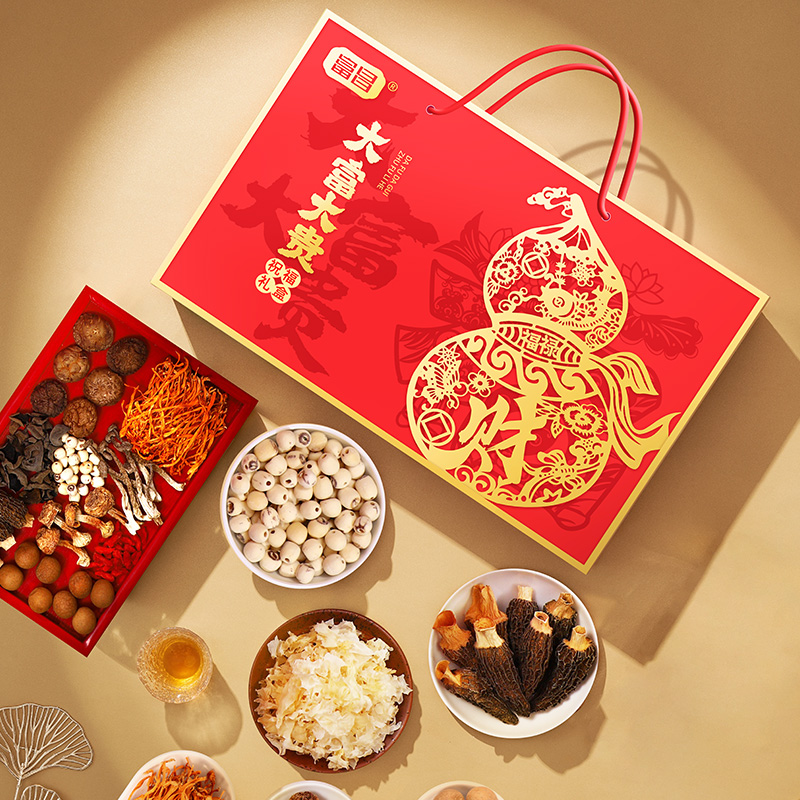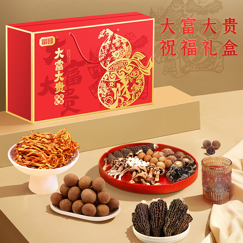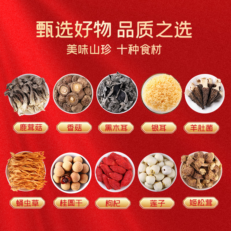 富昌鹿茸菇70g 富昌香菇50g 富昌东北黑木耳50g 富昌银耳70g 富昌羊肚菌10g 富昌桂圆干400g 富昌莲子100g 富昌枸杞100g 富昌蛹虫草50g 富昌姬松茸30g