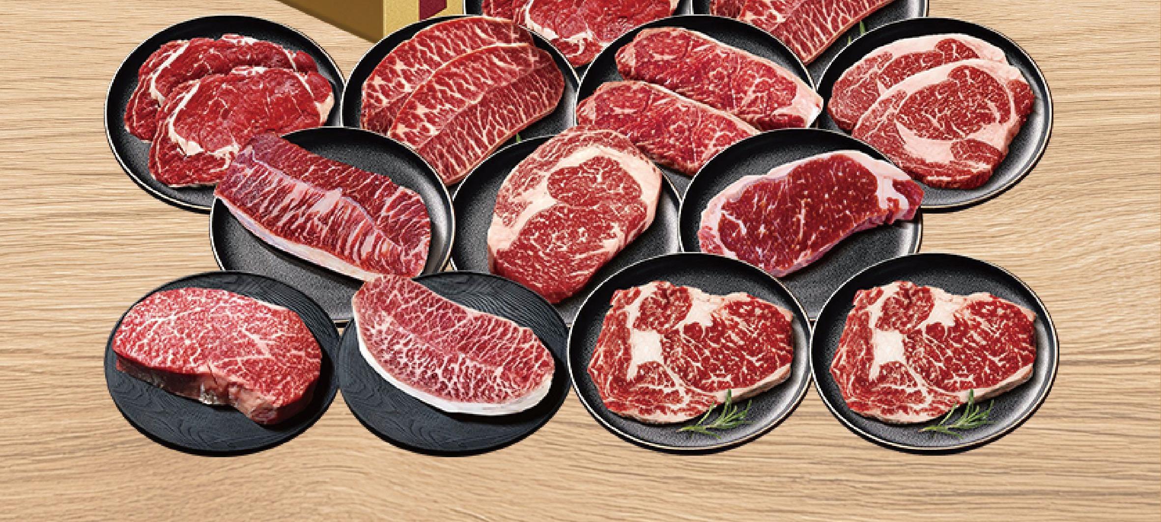 M6-7和牛雪花牛排 180gx1 盒 M6-7和牛板腱牛排 180gx1 盒 安格斯谷饲雪花牛排 180gx2 盒 安格斯谷饲眼肉牛排 180gx1 盒 安格斯谷饲西冷牛排 180gx1 盒 安格斯谷饲牡蛎牛排 180gx1 盒 安格斯谷饲薄切沙朗牛排 130gx2 盒 安格斯谷饲薄切眼肉心牛排 130gx1 盒 安格斯谷饲薄切板腱牛排 130gx2 盒 安格斯谷饲薄切西冷牛排 130gx1 盒 牛排专用黑胡椒酱 130gx2 袋 精美刀叉 x2 套 净含量:2040g