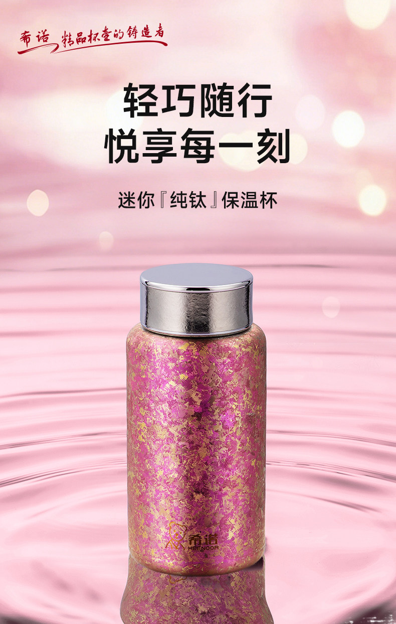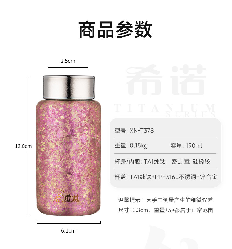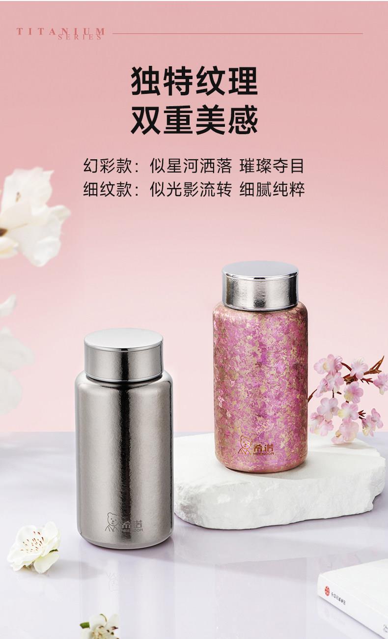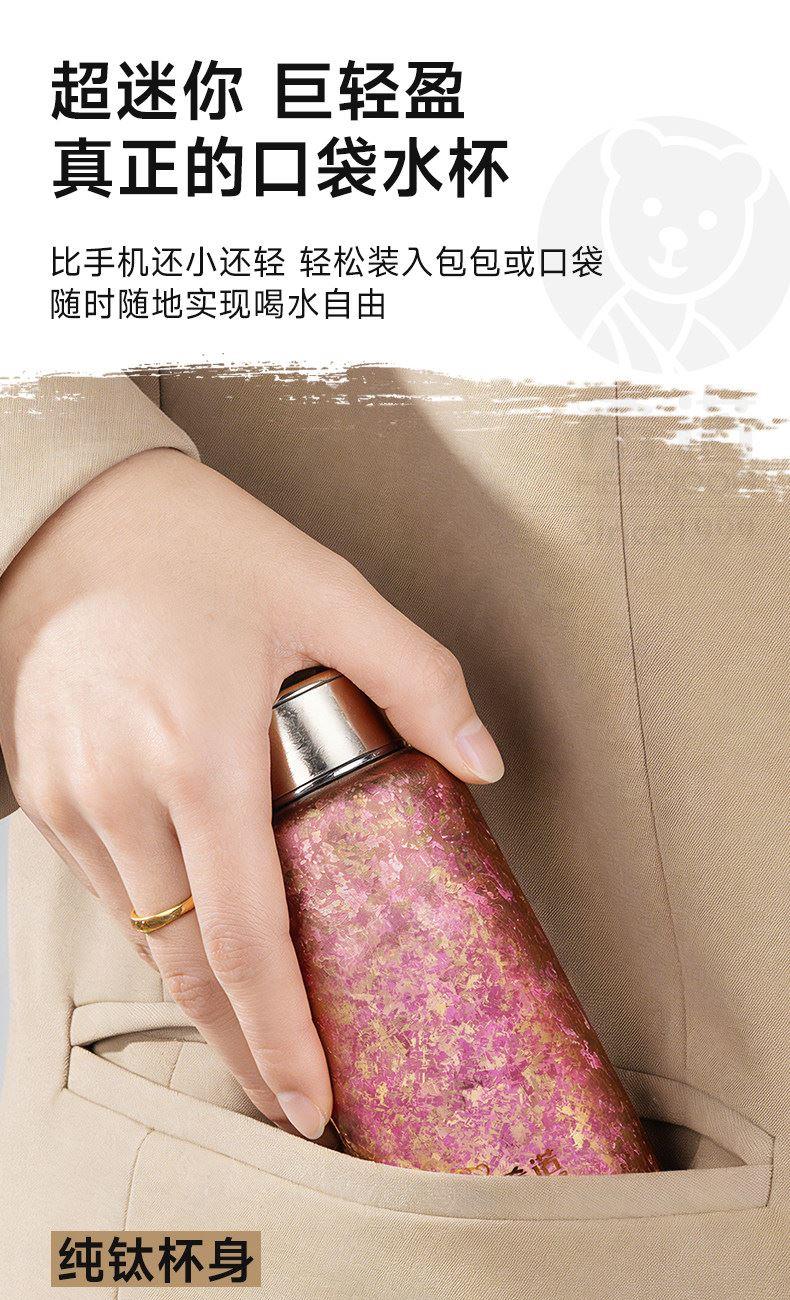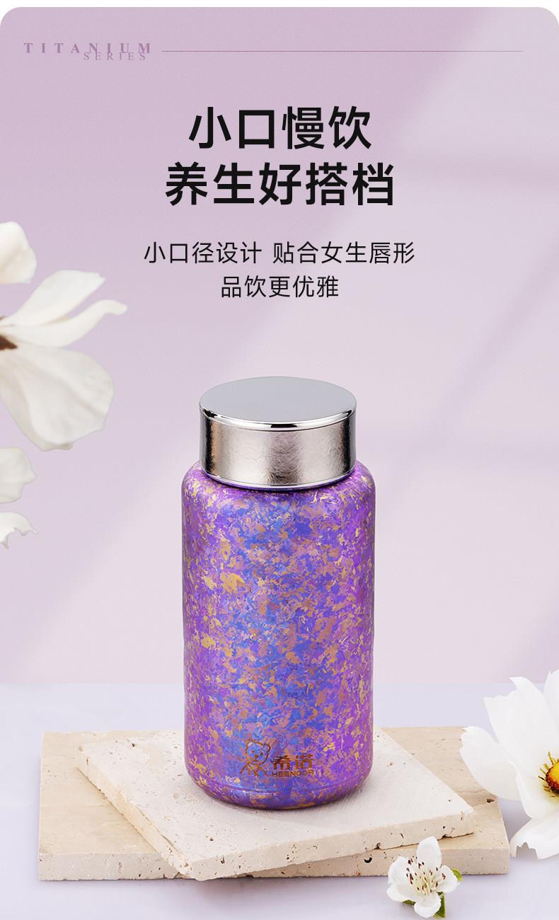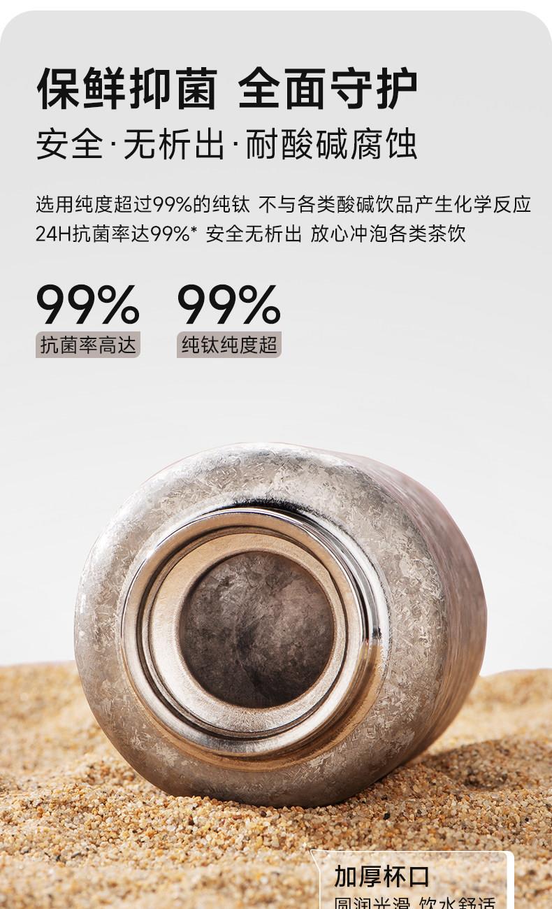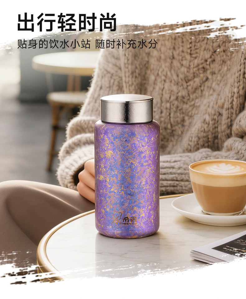 产品规格: 材质:内胆-钛/杯身-钛 密封圈:硅橡胶 颜色:银月白 、初荷粉、薰衣草紫、云海雾凇、纯净冰川 杯盖样式:旋盖 容量:190ml 产品优势: 钛金属打造,耐腐蚀 杯口圆润,饮用舒适 亲生物金属 轻量化人体工程学设计