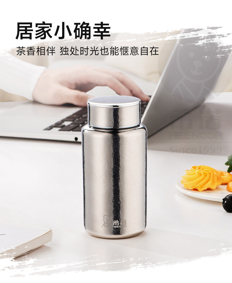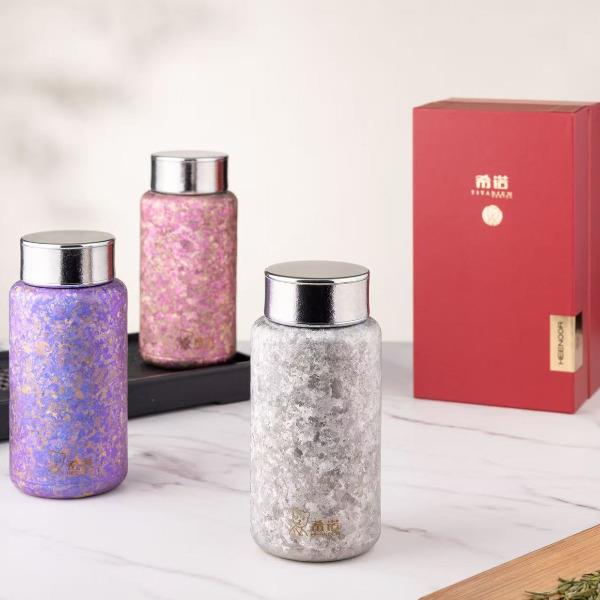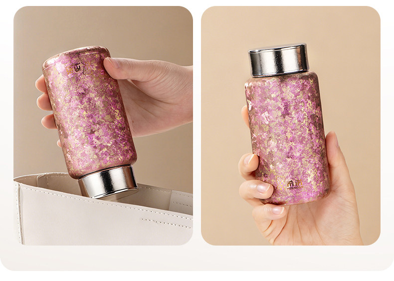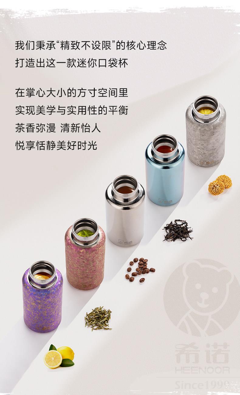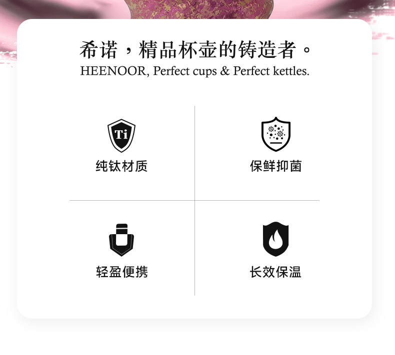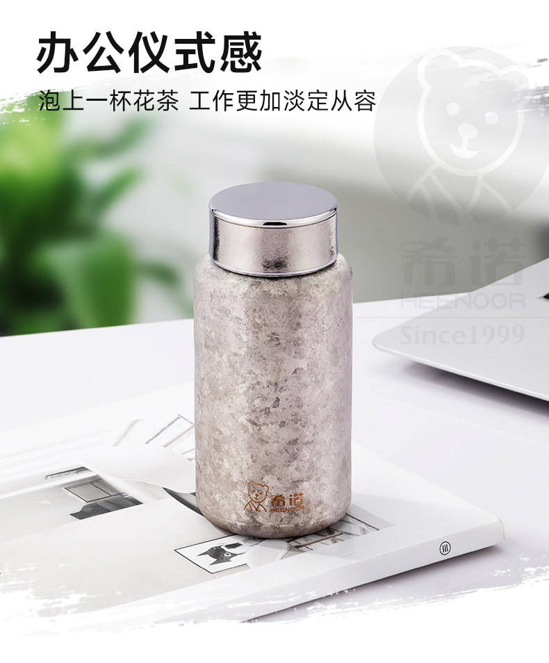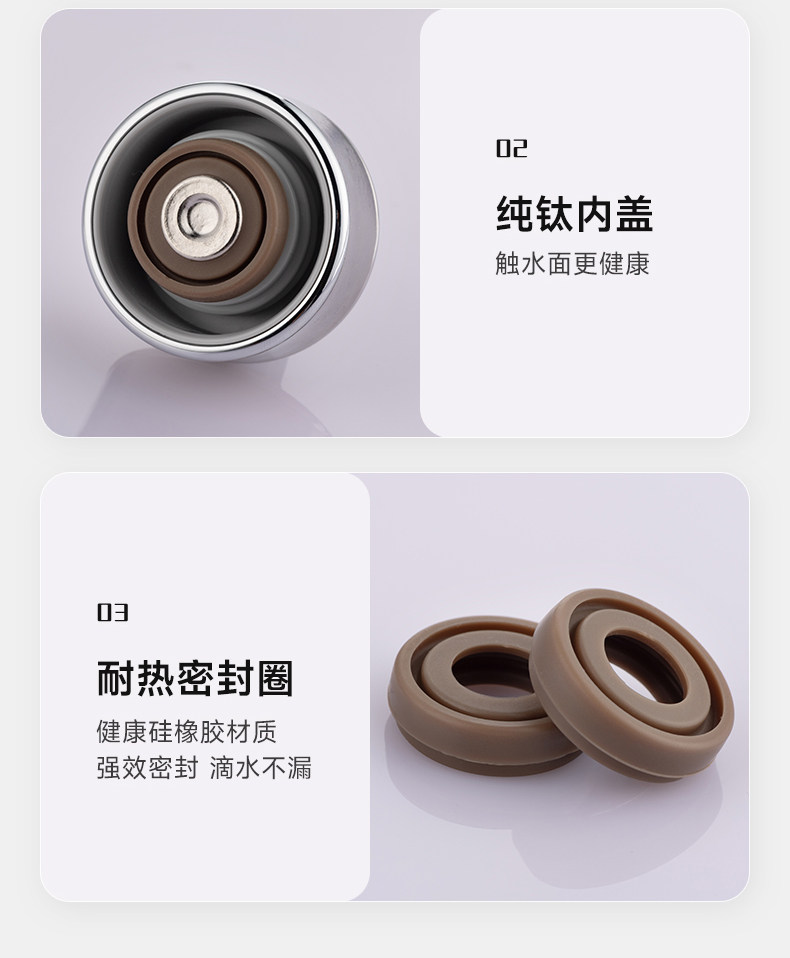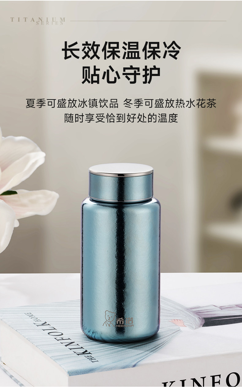 产品规格: 材质:内胆-钛/杯身-钛 密封圈:硅橡胶 颜色:银月白 、初荷粉、薰衣草紫、云海雾凇、纯净冰川 杯盖样式:旋盖 容量:190ml 产品优势: 钛金属打造,耐腐蚀 杯口圆润,饮用舒适 亲生物金属 轻量化人体工程学设计