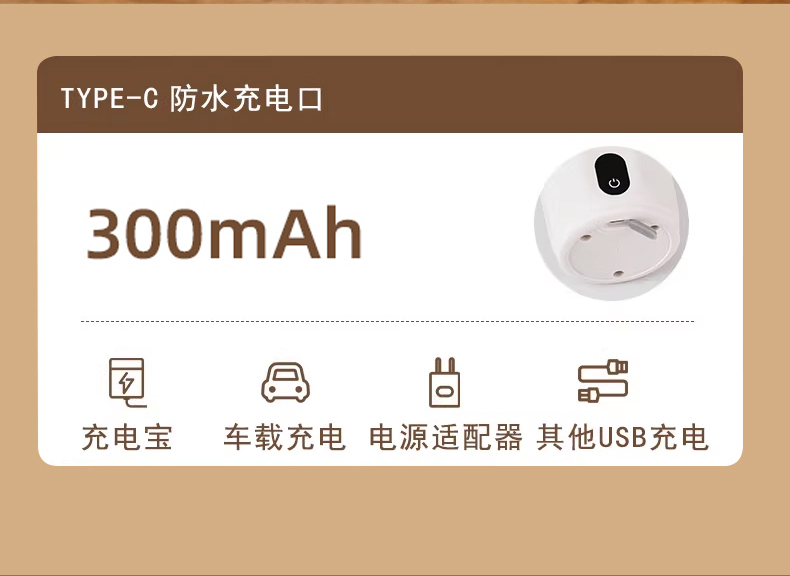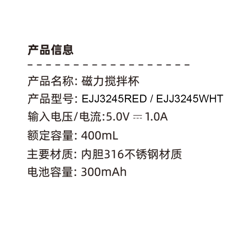 功率:0.15W 电压:5V/1A 容量:400mL 毛重:0.3Kg 材质:PP+316不锈钢+AS 颜色:白色,红色 彩盒包装尺寸:100*100*152mm 外箱包装尺寸:520*430*333mm 推荐理由: 1、AS安全材质,内胆316安全材质 2、Type-C充电接口,充电方便 3、高速磁力搅拌刀头,快速均匀搅拌 4、温度显示,不烫口