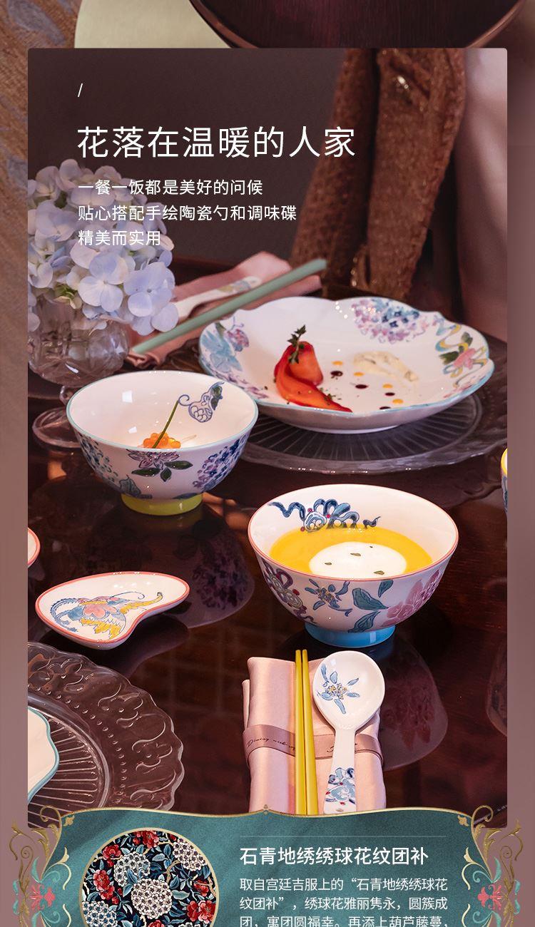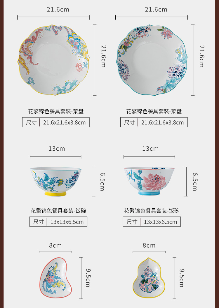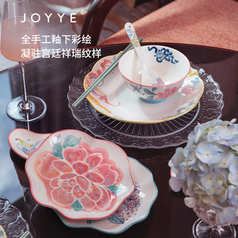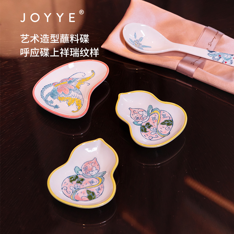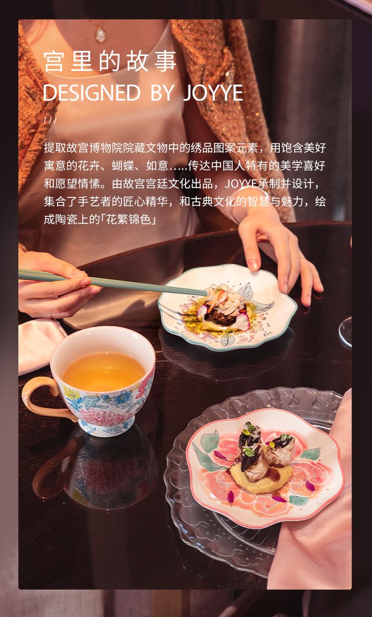 颜色:混色 产品尺寸:饭碗*4:13x13x6.5cm 菜盘 *4:21.6x21.6x3.8cm 蘸料碟 *4:9.5x8x1.8cm 小吃盘 *2:17.8x17.8x2.5cm 勺子*4:9x7.2x1.8cm 筷子 *4:24.8cm 产品材质:新骨瓷 产品工艺:釉下手绘 包装方式:礼盒装(含手提袋) 产品卖点: 1. 故宫宫廷文化出品,JOYYE承制并设计 2. 釉下手绘勾勒出锦簇繁花,翩翩戏蝶,线条灵动,色彩鲜活,花面丰富 3. 陶瓷碗内壁分别绘有如意和葫芦,整体画面感更强 4. 调味碟外形和花面呼应又可当筷子架,贴心实用 5. 甄选定制礼盒包装,送礼、自用两相宜