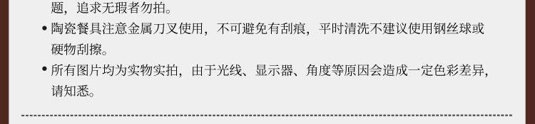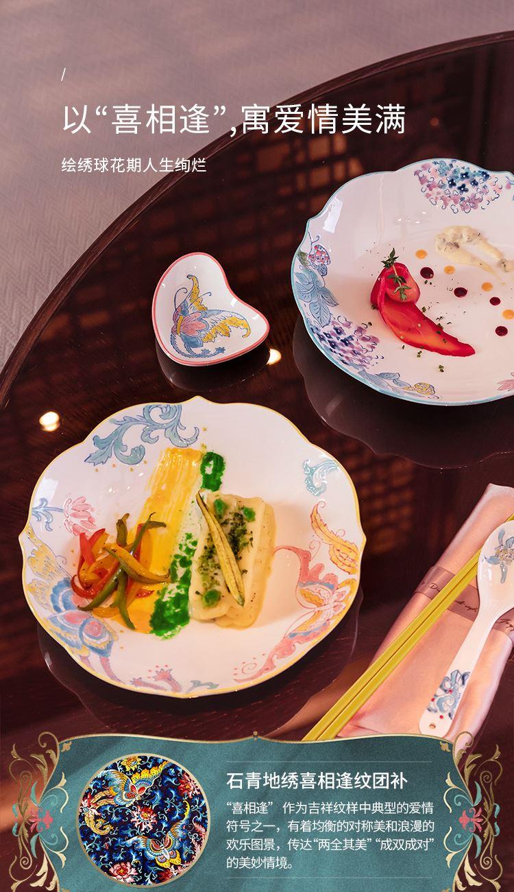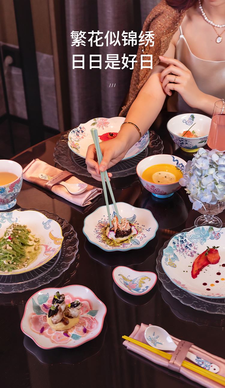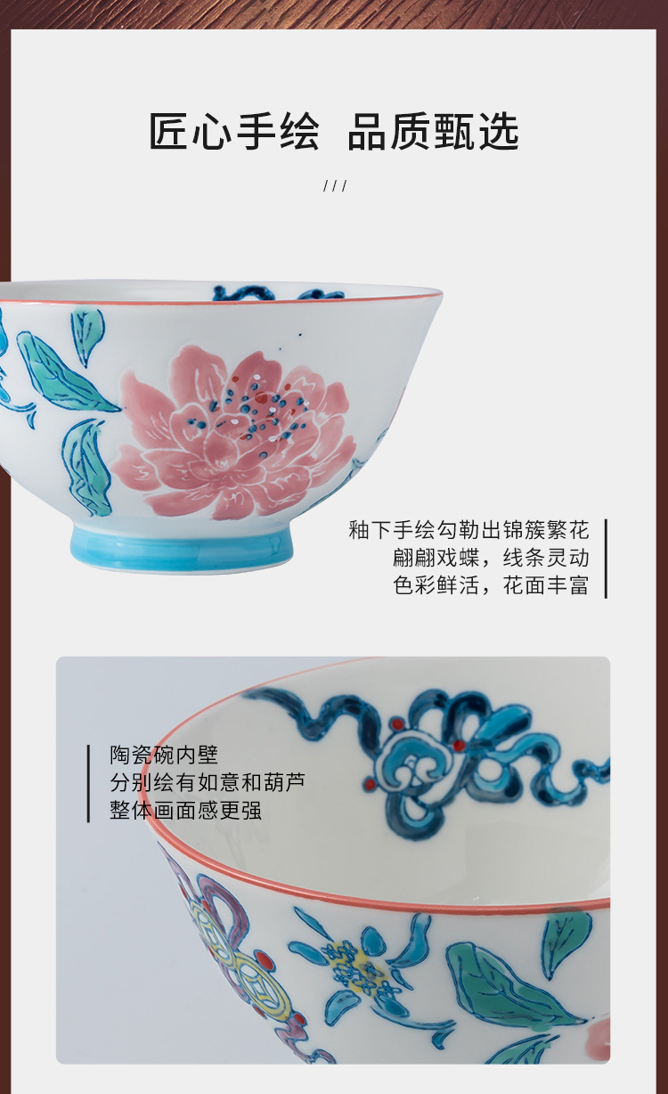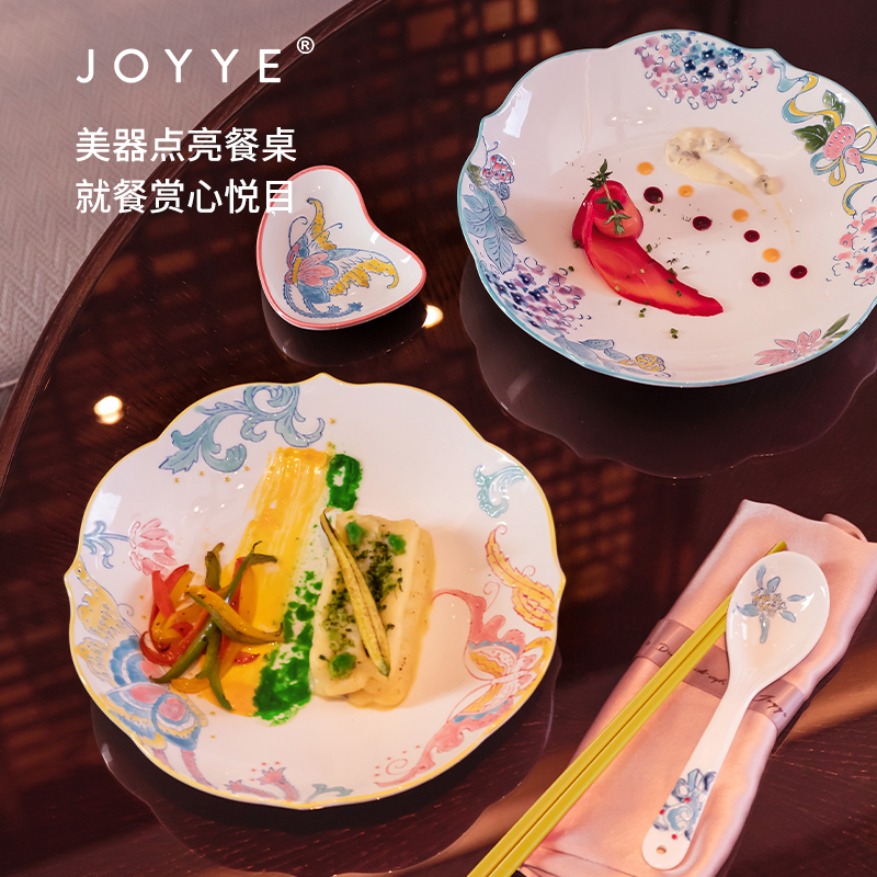 颜色:混色 产品尺寸:饭碗*4:13x13x6.5cm 菜盘 *4:21.6x21.6x3.8cm 蘸料碟 *4:9.5x8x1.8cm 小吃盘 *2:17.8x17.8x2.5cm 勺子*4:9x7.2x1.8cm 筷子 *4:24.8cm 产品材质:新骨瓷 产品工艺:釉下手绘 包装方式:礼盒装(含手提袋) 产品卖点: 1. 故宫宫廷文化出品,JOYYE承制并设计 2. 釉下手绘勾勒出锦簇繁花,翩翩戏蝶,线条灵动,色彩鲜活,花面丰富 3. 陶瓷碗内壁分别绘有如意和葫芦,整体画面感更强 4. 调味碟外形和花面呼应又可当筷子架,贴心实用 5. 甄选定制礼盒包装,送礼、自用两相宜