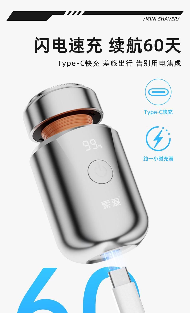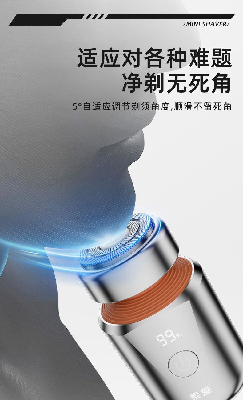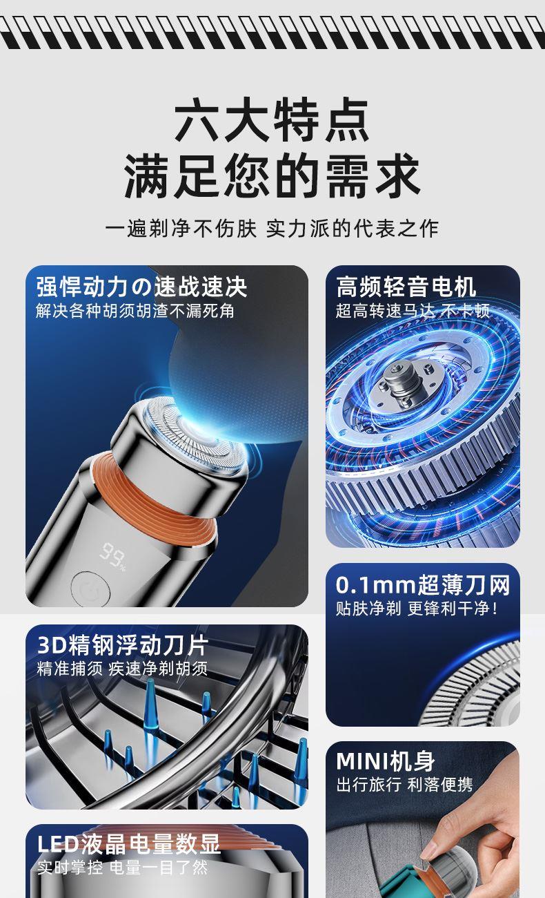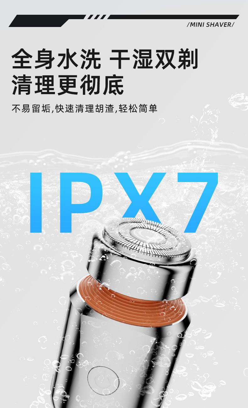 悬浮式刀头/迷你便捷一手掌控 高能续航锂电池/Type-C快充/小巧便携/惊艳小尺寸 功率:5V1A/IPX-7级防水 时尚经典设计/潮流便携高性能剃须刀 打造掌心尺寸随心剃须刀 全身水洗/7200转高速强力电机 充电一小时可持续使用3个月 IPX7防水/整机可水洗随心所“浴”