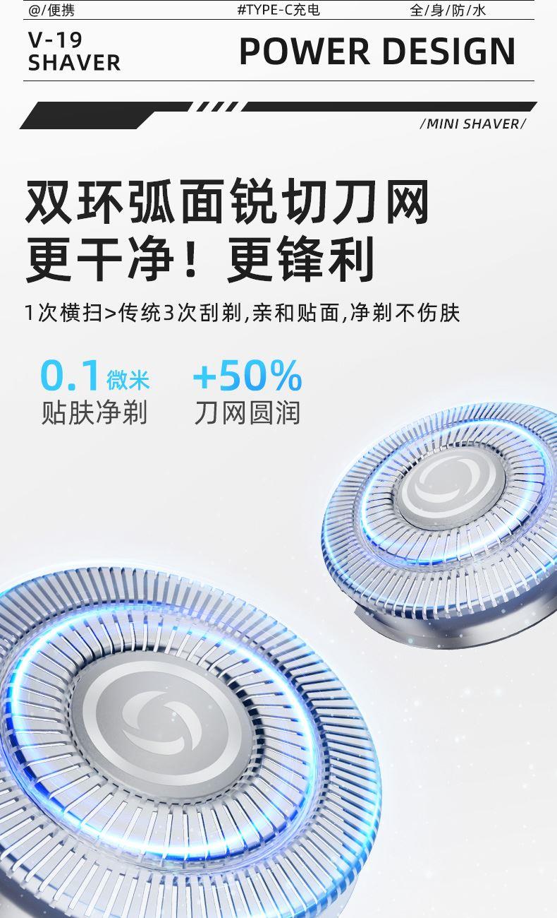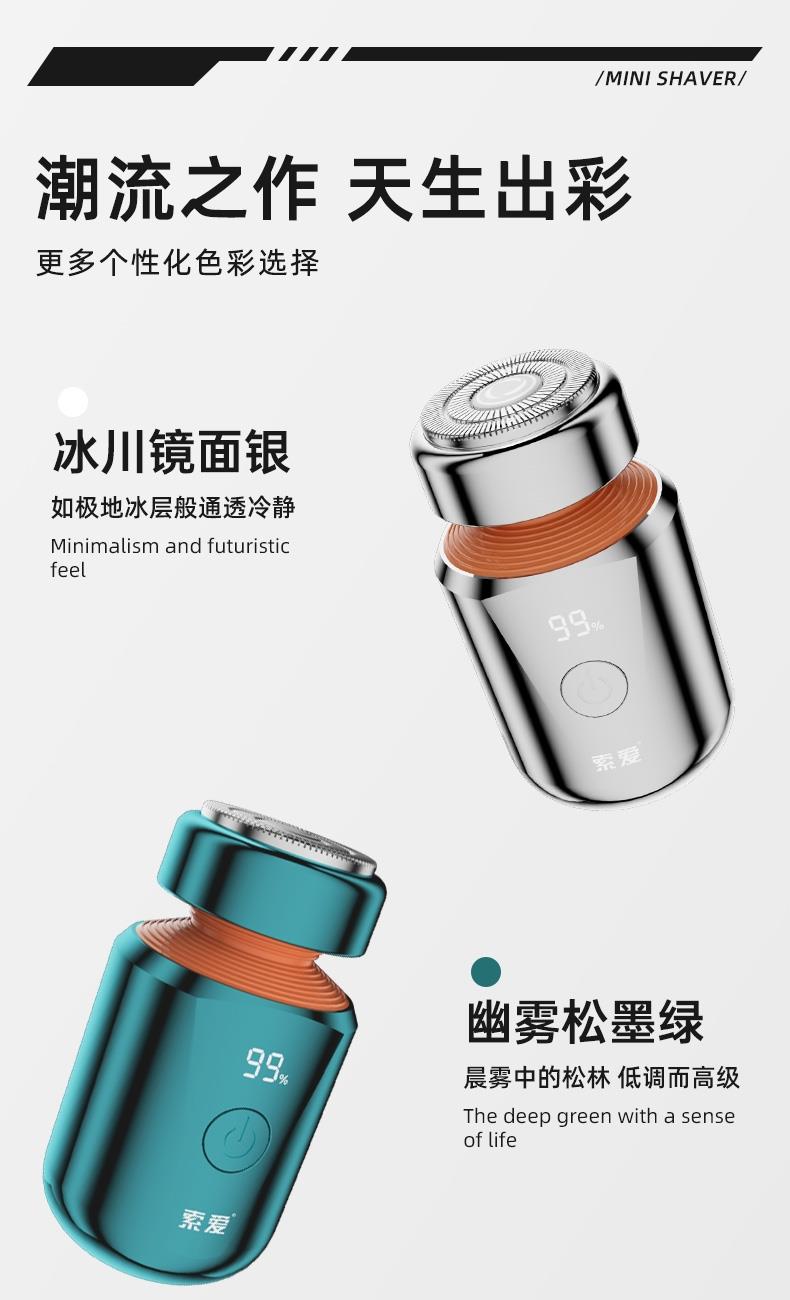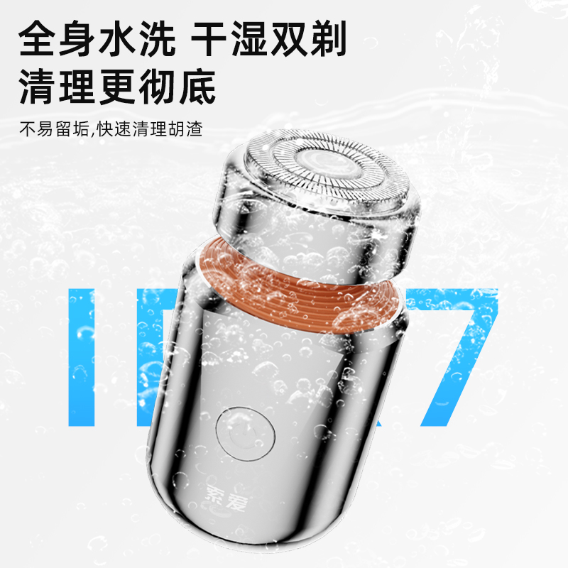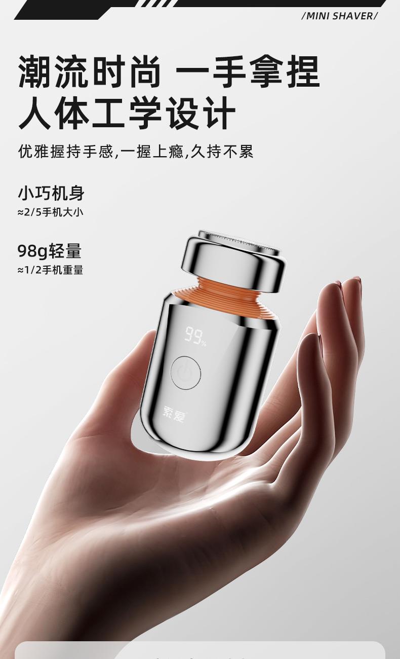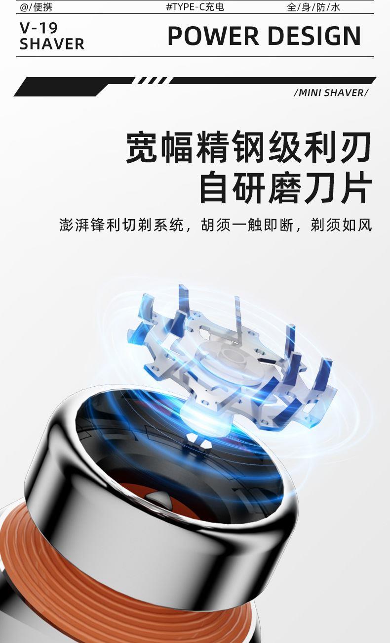 悬浮式刀头/迷你便捷一手掌控 高能续航锂电池/Type-C快充/小巧便携/惊艳小尺寸 功率:5V1A/IPX-7级防水 时尚经典设计/潮流便携高性能剃须刀 打造掌心尺寸随心剃须刀 全身水洗/7200转高速强力电机 充电一小时可持续使用3个月 IPX7防水/整机可水洗随心所“浴”