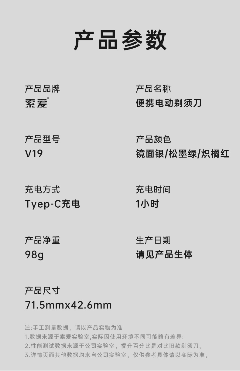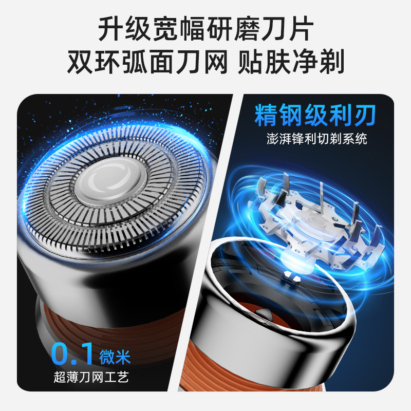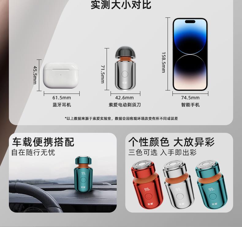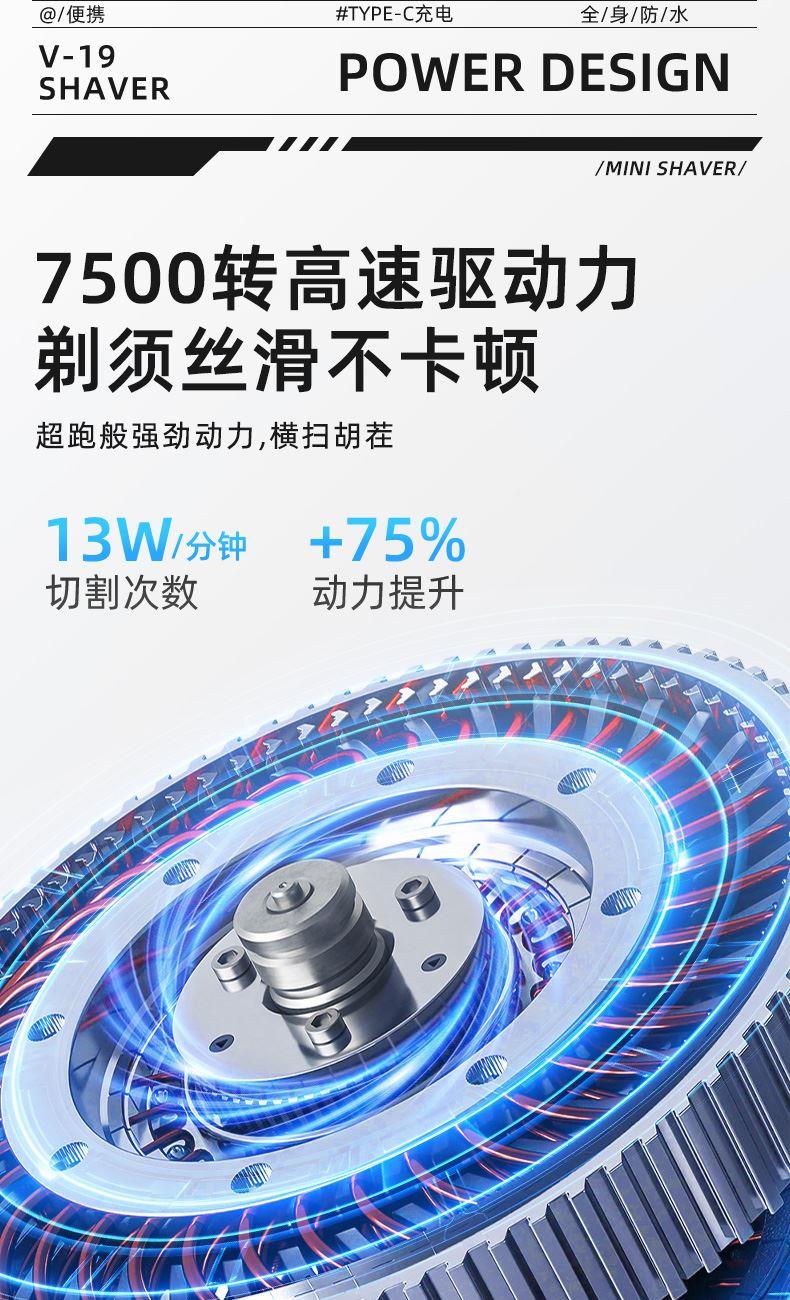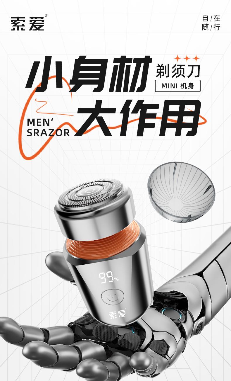 悬浮式刀头/迷你便捷一手掌控 高能续航锂电池/Type-C快充/小巧便携/惊艳小尺寸 功率:5V1A/IPX-7级防水 时尚经典设计/潮流便携高性能剃须刀 打造掌心尺寸随心剃须刀 全身水洗/7200转高速强力电机 充电一小时可持续使用3个月 IPX7防水/整机可水洗随心所“浴”