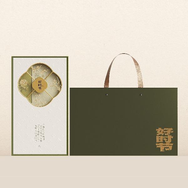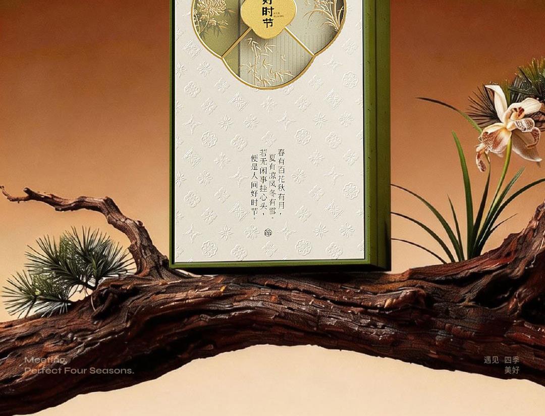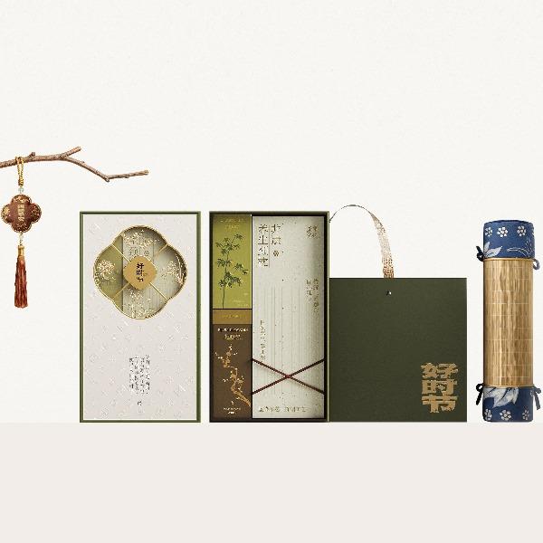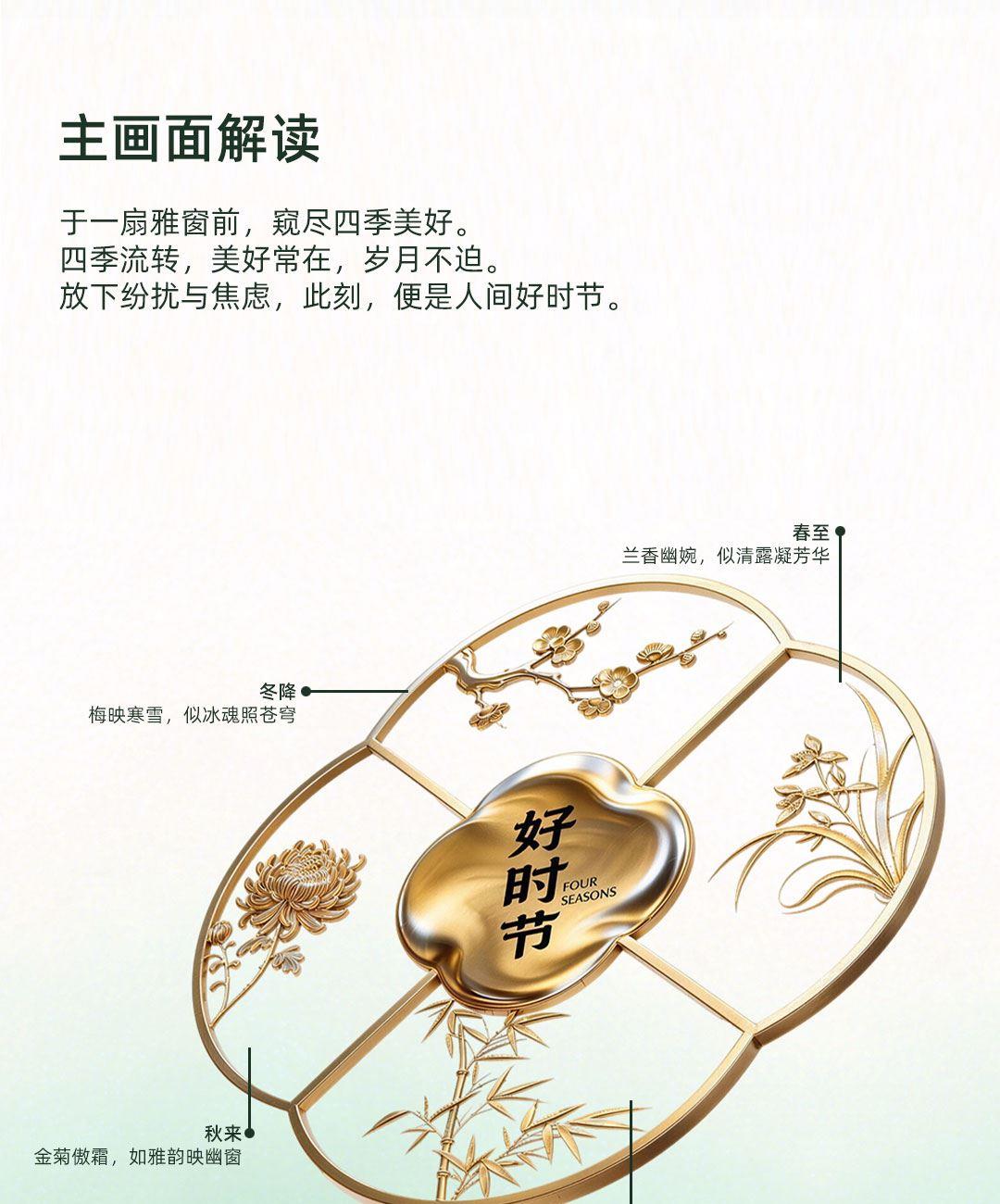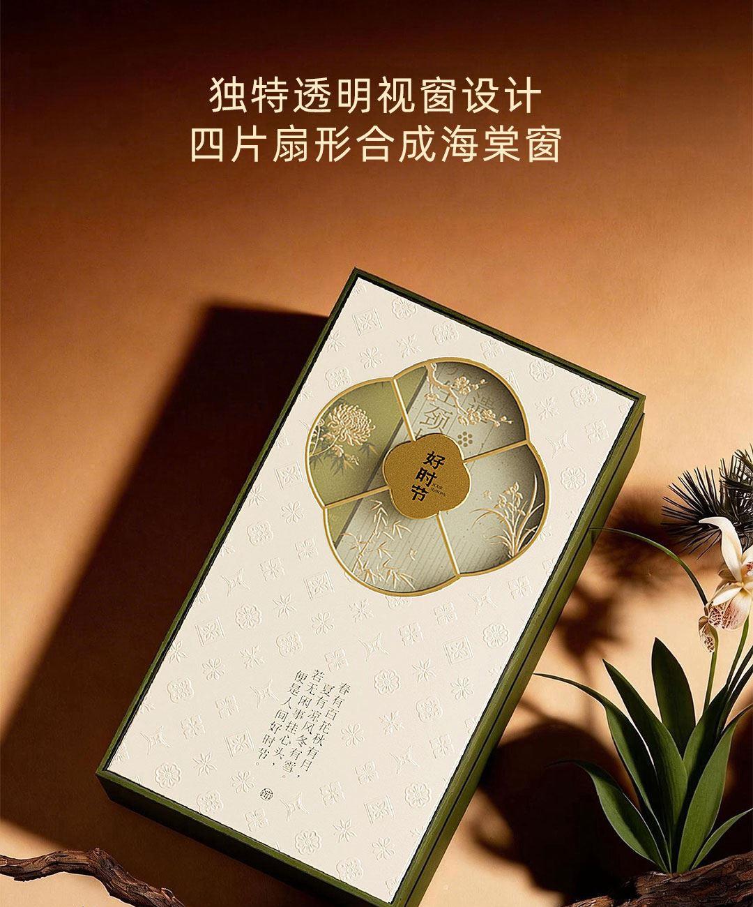 卖点:透明海棠窗,烫金四君子纹样,配套同系手提袋,深墨烫金,尽显雅致质感。