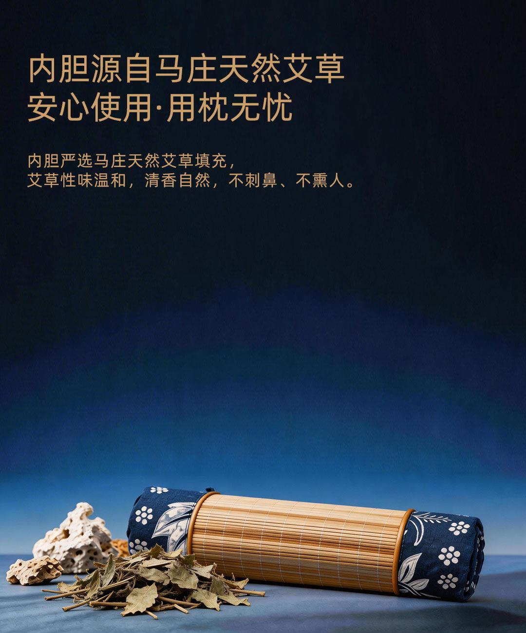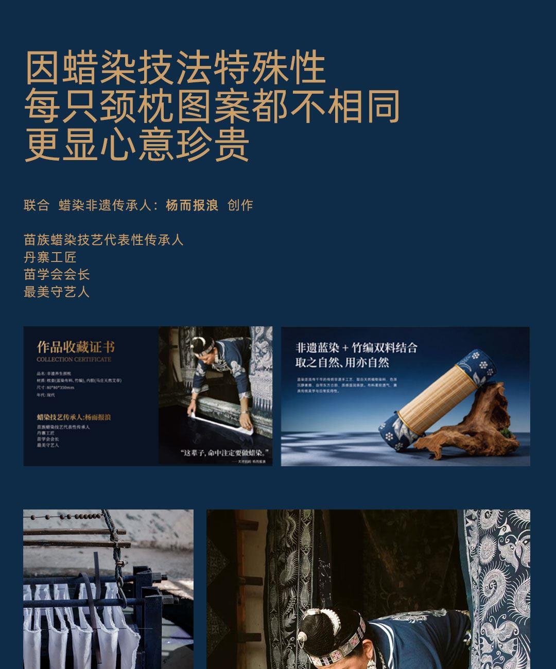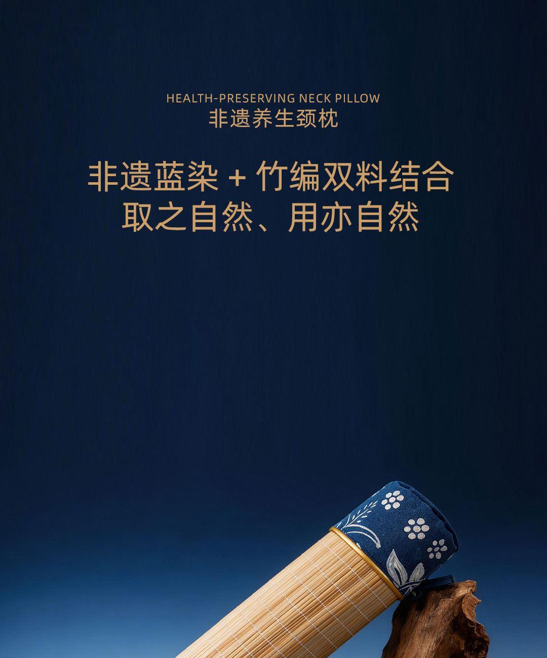 卖点:蜡染非遗人监制,非遗蓝染 + 竹编双料结合,取自天然植物染料,质感温润亲肤,减轻颈椎压力,帮助恢复颈椎生理曲度,让睡眠更安稳,科学护颈。