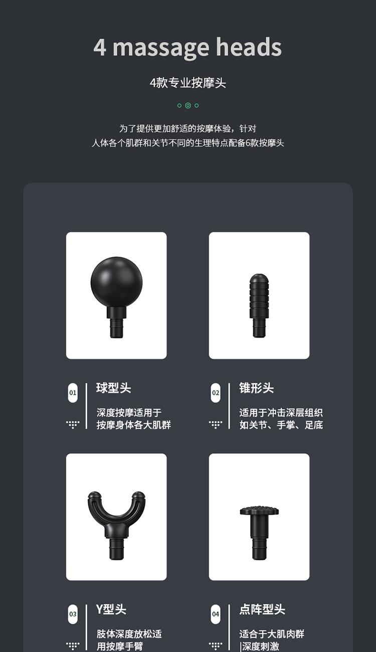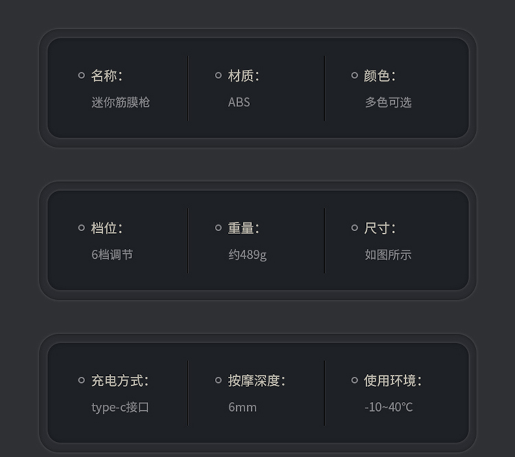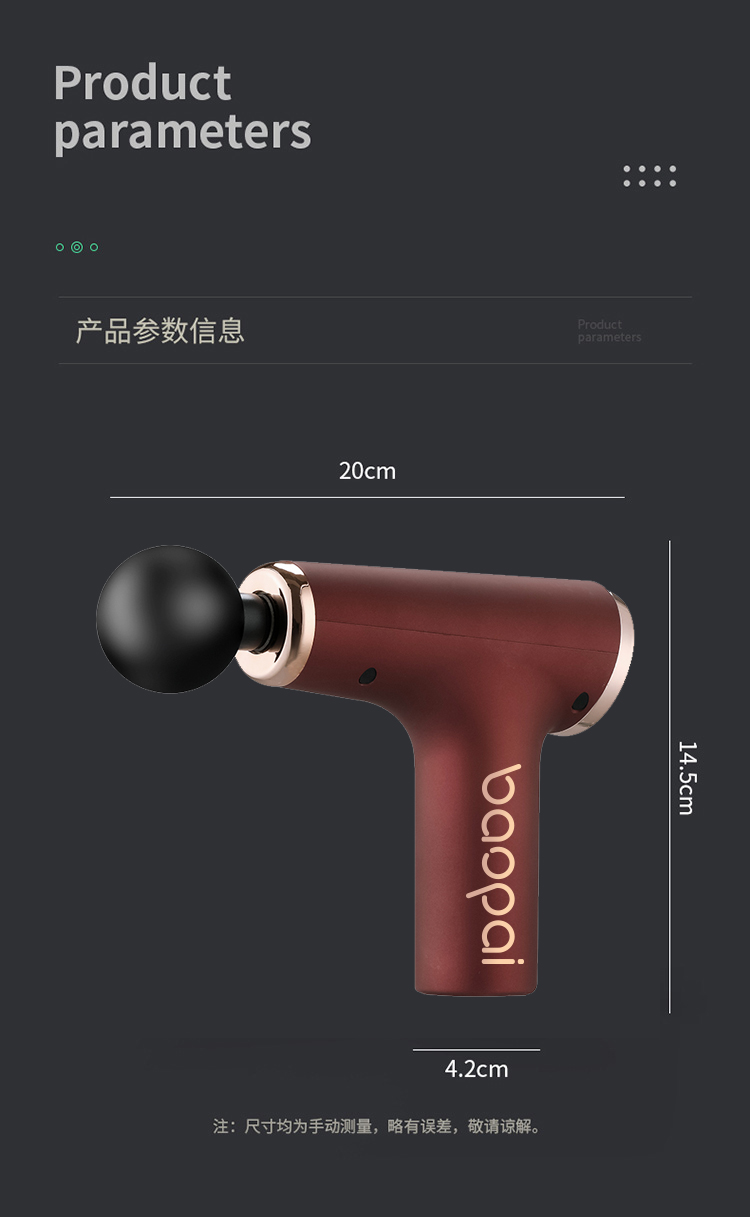 迷你筋膜枪 产品尺寸:200*42*145mm 手提袋尺寸:260*215*75mm 外箱尺寸:440*350*430mm 整箱重量:14kg 精致小巧,随身携带 六档调节,满足不同力度需求 球型头、U型头、空气头、子弹头,专业多头配置 1200mAh容量锂电池 额定电压: 5V 额定功率: 25W 4大按摩头:球型头、U型头、空气头、子弹头 档位:六档调节 使用时间:约40-50分钟 充电时间:约2-3个小时 充电接口:Type-C 产品尺寸:200*42*145mm 产品净重: 约680克