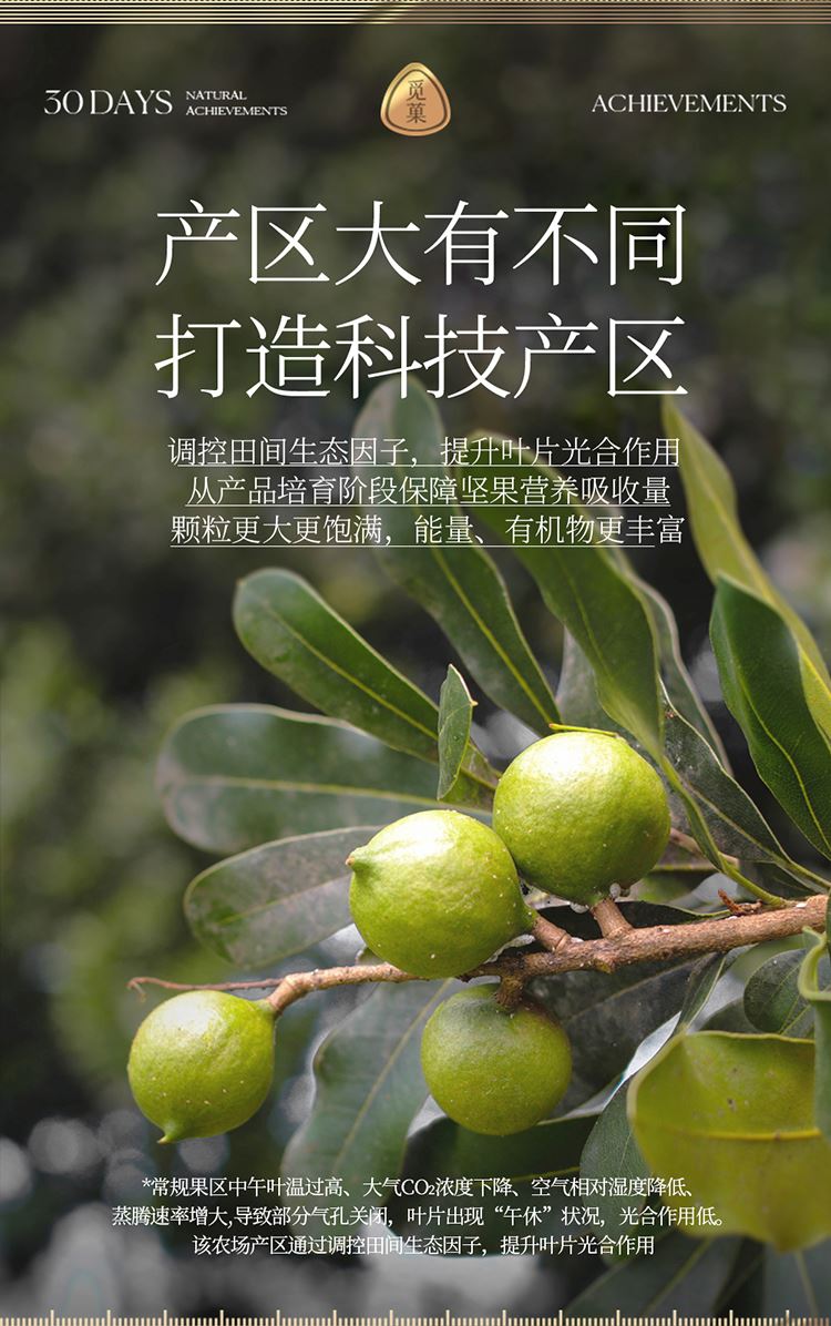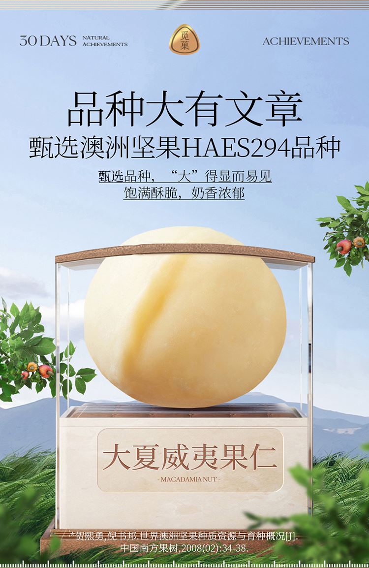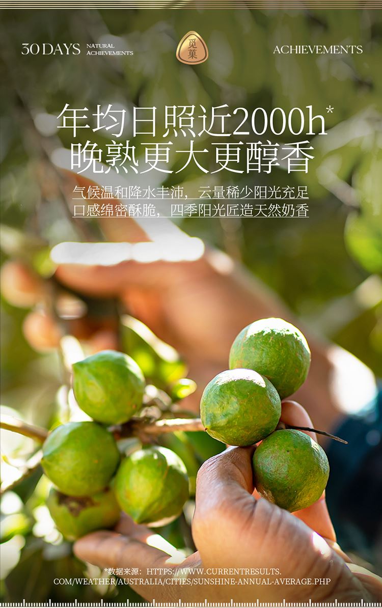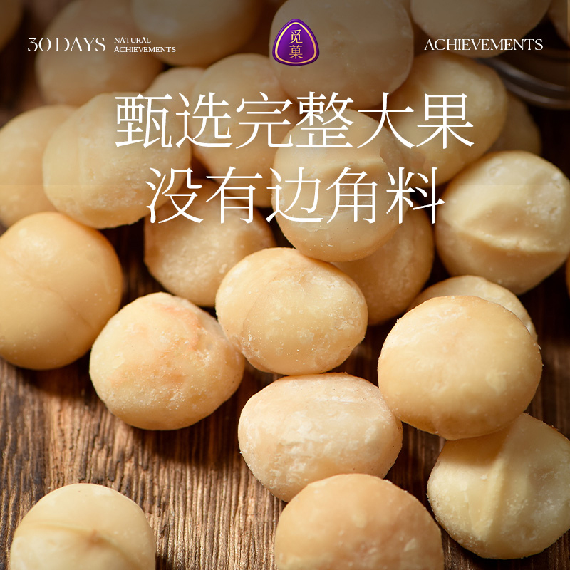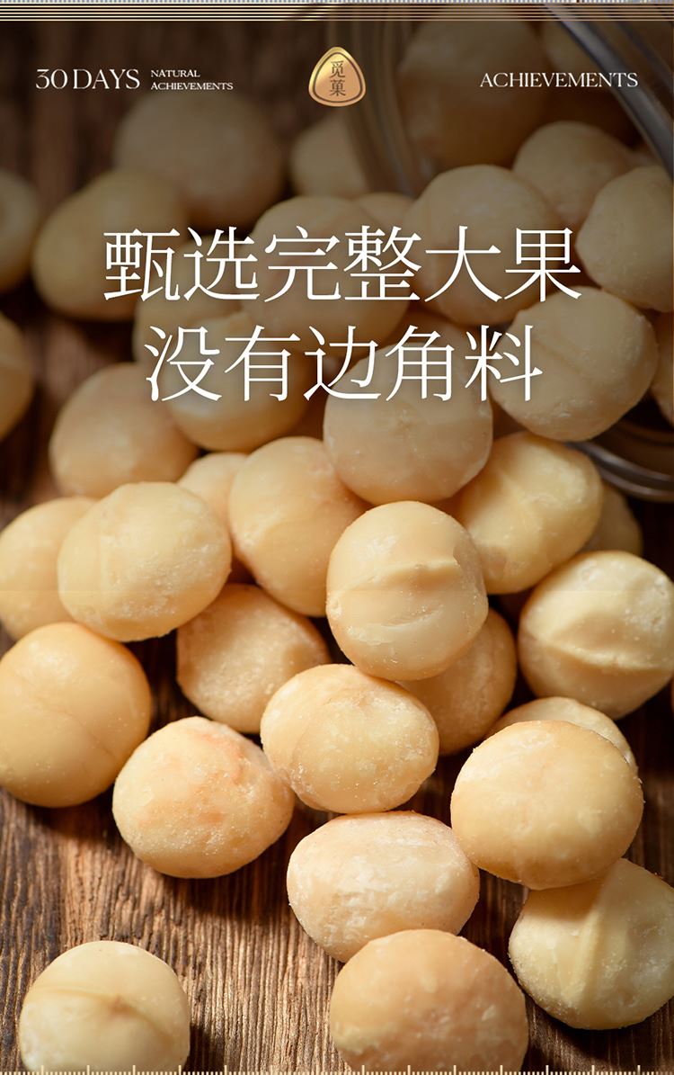 奶香浓郁 原产于澳大利亚 全年阳光充足气候变化小 果实自带奶香, 自然浓郁 甄选大果 好坚果 高标准 只选用17--20mm大果 锁鲜科技 一口尝尽新鲜 当季熟果 ,6层技术锁鲜 留住酥脆口感