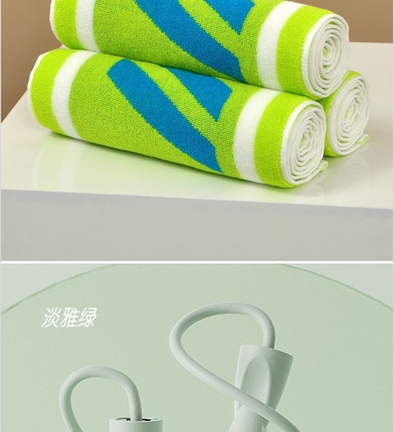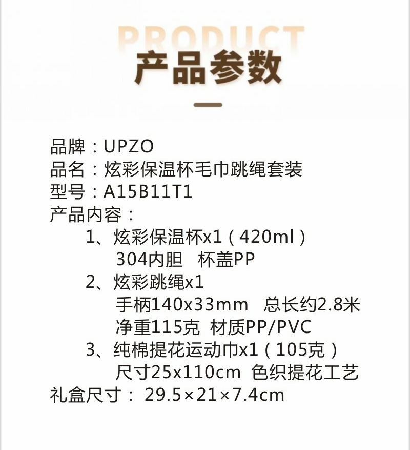 型号: A15B11T1 产品内容 1、 炫彩跳绳×1 (跳绳总长:约2.8米) 产品净重:115克 产品材质:PP/PVC 2、 靓彩保温杯×1 304内胆 PP杯盖 420毫升容量 3、 纯棉提花运动巾×1 105克 25*110CM 精梳棉色织提花工艺 外盒: 29.5×21×7.4cm 纯棉运动巾 时尚外观设计 靓丽配色 提花工艺体现运动与清凉视觉感受 优质精梳棉 适合运动的克重与规格设置 靓彩保温杯融入祝福元素和时尚设计理念,给与保温杯常规功能外更多的靓丽色彩 内胆采用304材质 杯盖优质PP 炫彩跳绳双层手柄设计 体感更好 设计清爽 材质优异