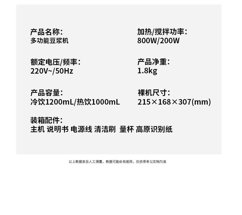 产品颜色:月光白 额定电压:220V~ 加热功率:800W 搅拌功率:200W 额定容量:1.2L 单台净重:1.8kg 单台毛重:2.2kg 产品材质:PP+ABS+高硼硅玻璃杯 产品尺寸:215*168*307mm 内箱尺寸:230*230*345mm 外箱尺寸:480*480*715mm 产品清单:主机*1/电源线*1/说明书*1 一键操作,一键完成,无需繁琐操作 12叶精钢刀头,快速搅碎,食材粉碎无渣保留营养 高硼硅玻璃内胆,骤冷骤热,不易爆裂,静音罩,低噪音 智能预约,睡前放入食材,到点预约启动工作 一机多用,可以代替豆浆机,辅食机,汁机,料理机等 安全性,开盖保护,开盖即停止工作 发热盘防糊底涂层,清洗更方便