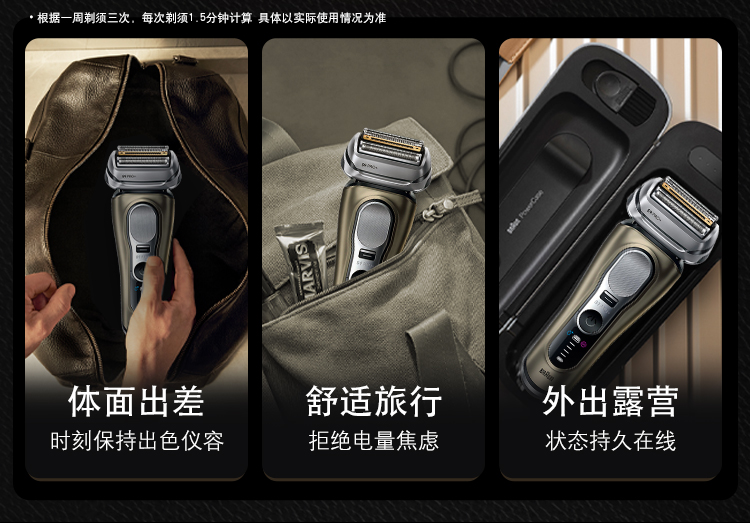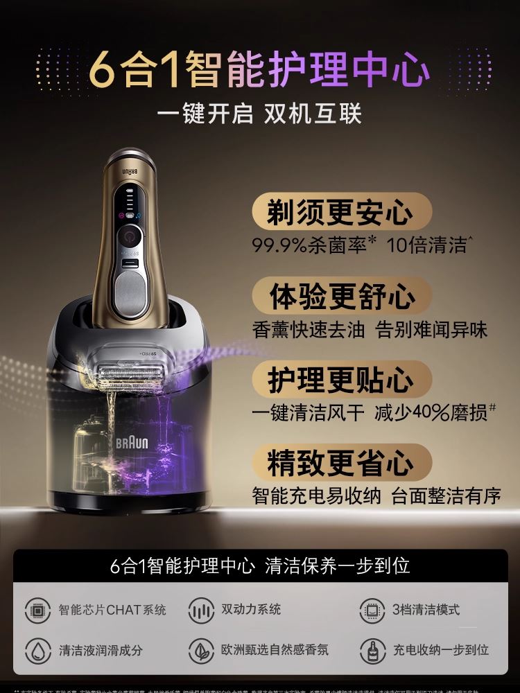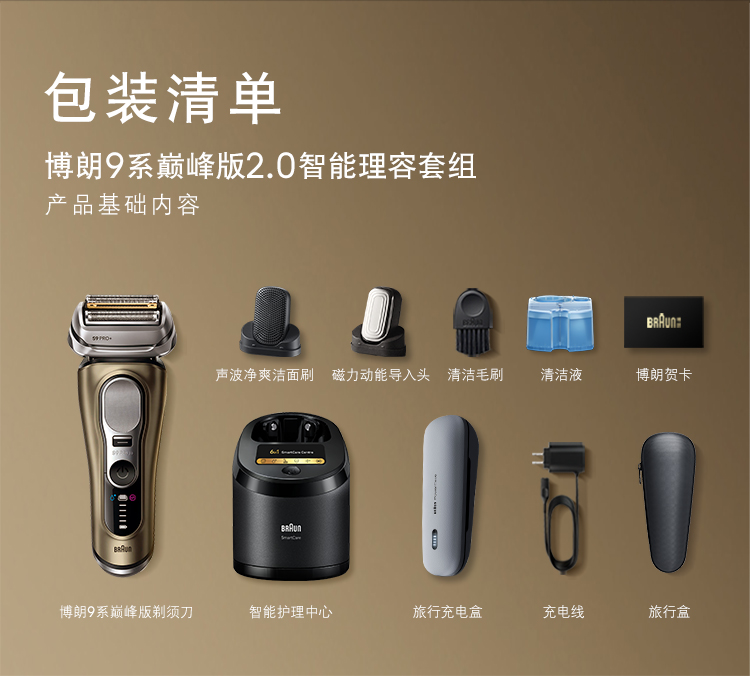 商品产地:德国 彩盒尺寸:36.6*29*21.1cm 重量:7.66kg 续航时间:45-60分钟 充电时间:1小时快充 包装清单:剃须刀*1、手动剃须刀*1、刀头*2、声波劲爽洁面刷、磁力动能导入头、清洁毛刷、清洁液、博朗贺卡、智能护理中心、旅行充电盒、充电线、