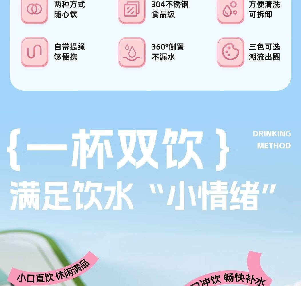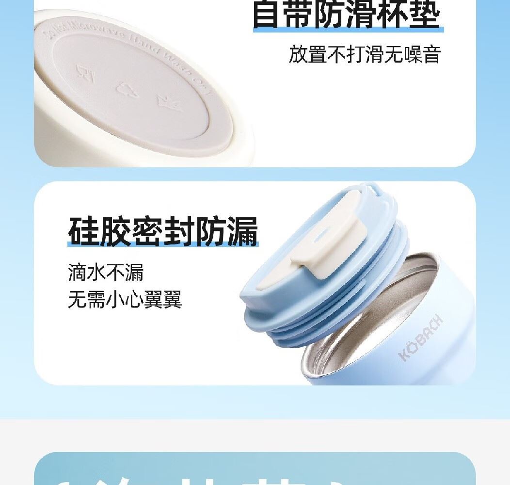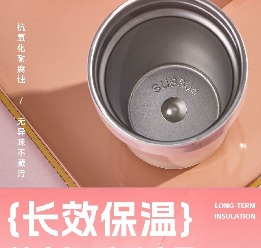 规格:330ML蜜桃粉/苹果绿/海盐蓝 克重:0.27kgL 包装尺寸:7.6*7.6*24.1mm ◎保温杯采用优质的304不锈钢材料,具有耐腐蚀、耐高温、不会产生异味或对健康造成影响,每一口喝的都安心。 ◎保温保冷性能出众:多层壁层层锁温,有效减少热量流失,不仅可以持久保温,同时也能够很好地保持冷饮的凉爽,随心饮用,不受限制 ◎密封设计倒置不漏水杯盖内设密封圈,倒置不漏水,外出好携带。 ◎杯身磨砂质感触感舒适,硅胶防滑底座静音防滑,直身设计握感舒适