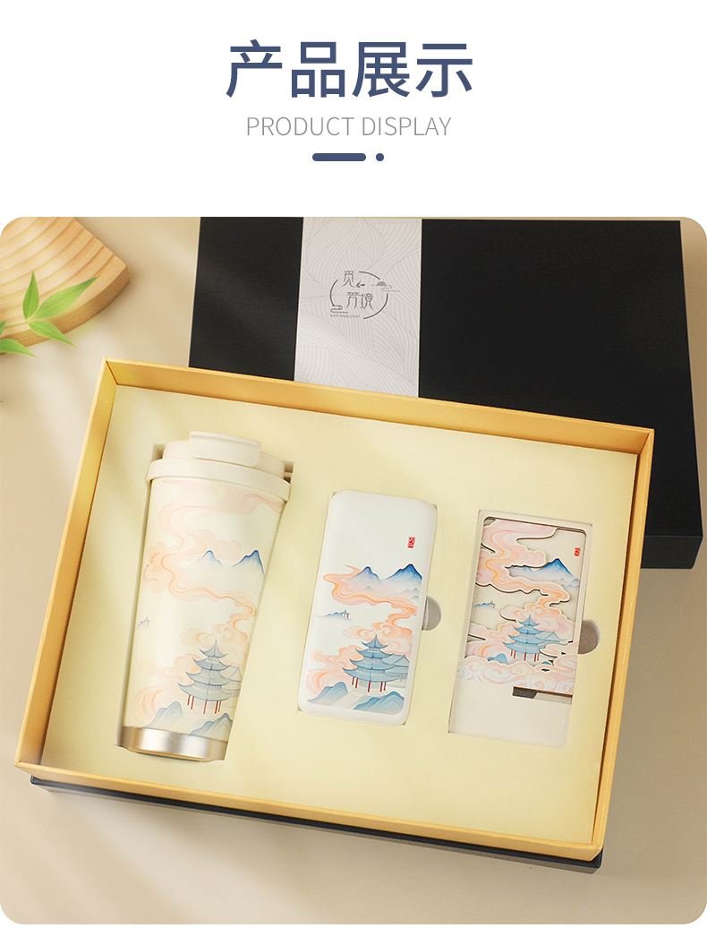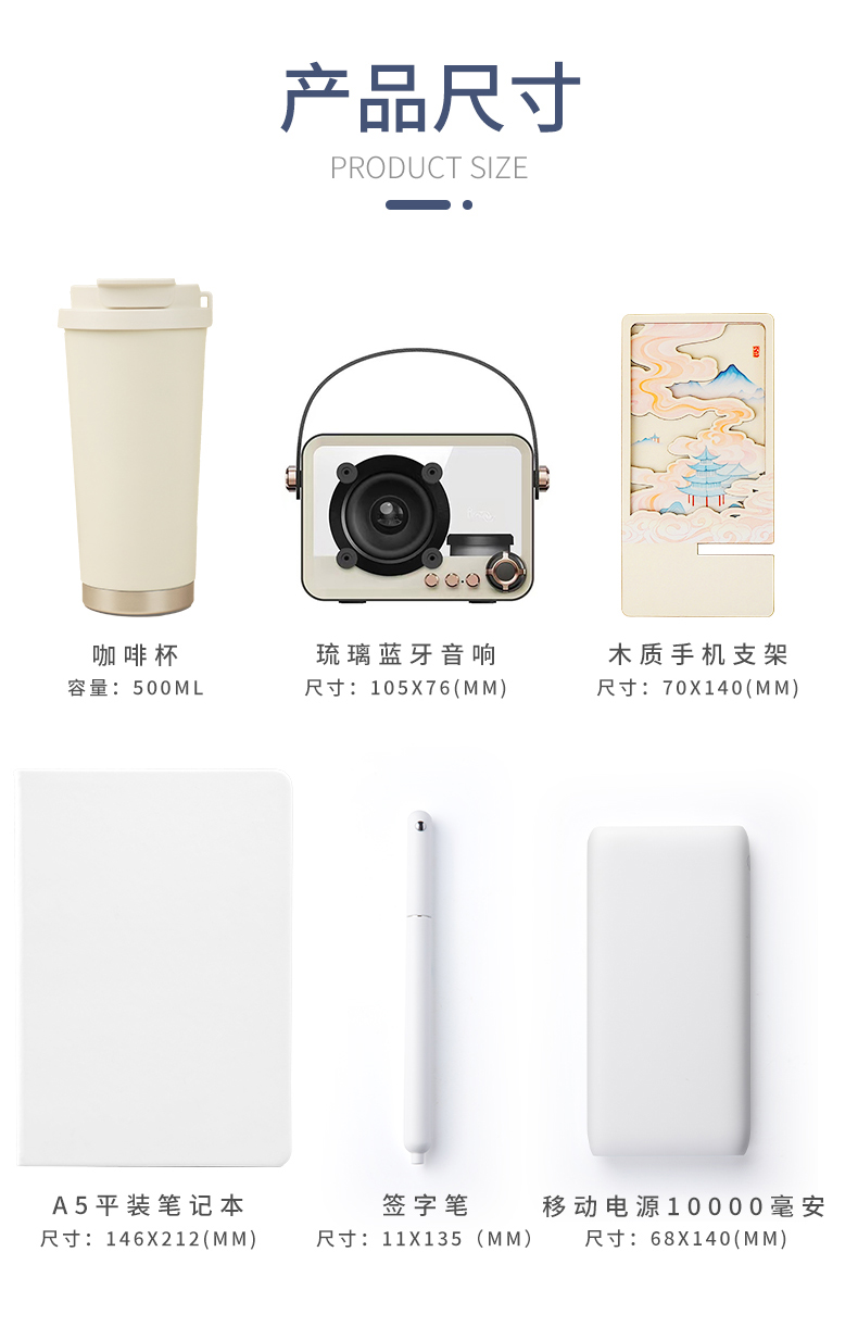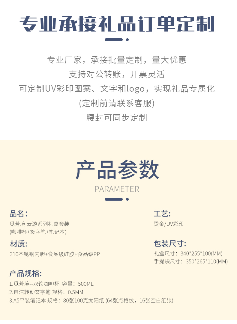 1.觅芳境--双饮咖啡杯 容量:500ml 内胆:316 外壳:304 杯盖:食品级PP 吸管:食品级硅胶 吸嘴:食品级PP 密封圈:食品级硅胶 2.自洁转动签字笔 规格:0.5mm 3.A5平装笔记本 规格:80张100克太阳纸 (64张点格纹,16张空白纸张) 礼盒尺寸:34*25.5*10cm 手提袋尺寸:35*26.5*11cm
