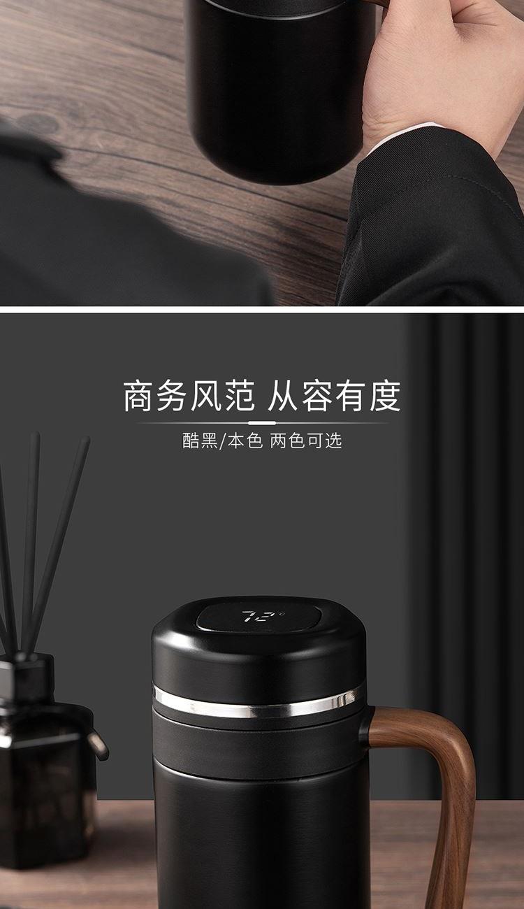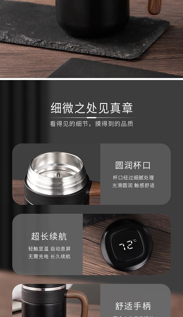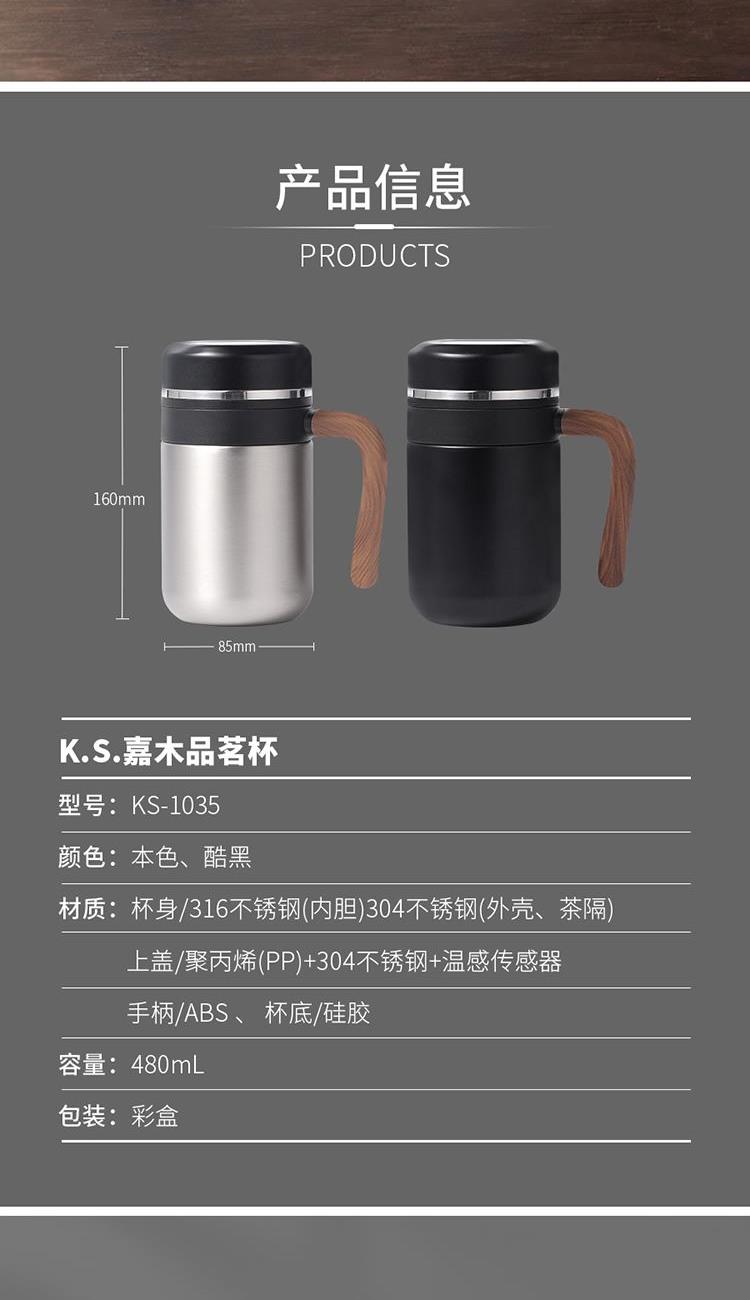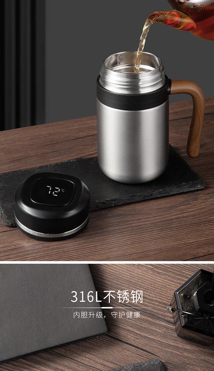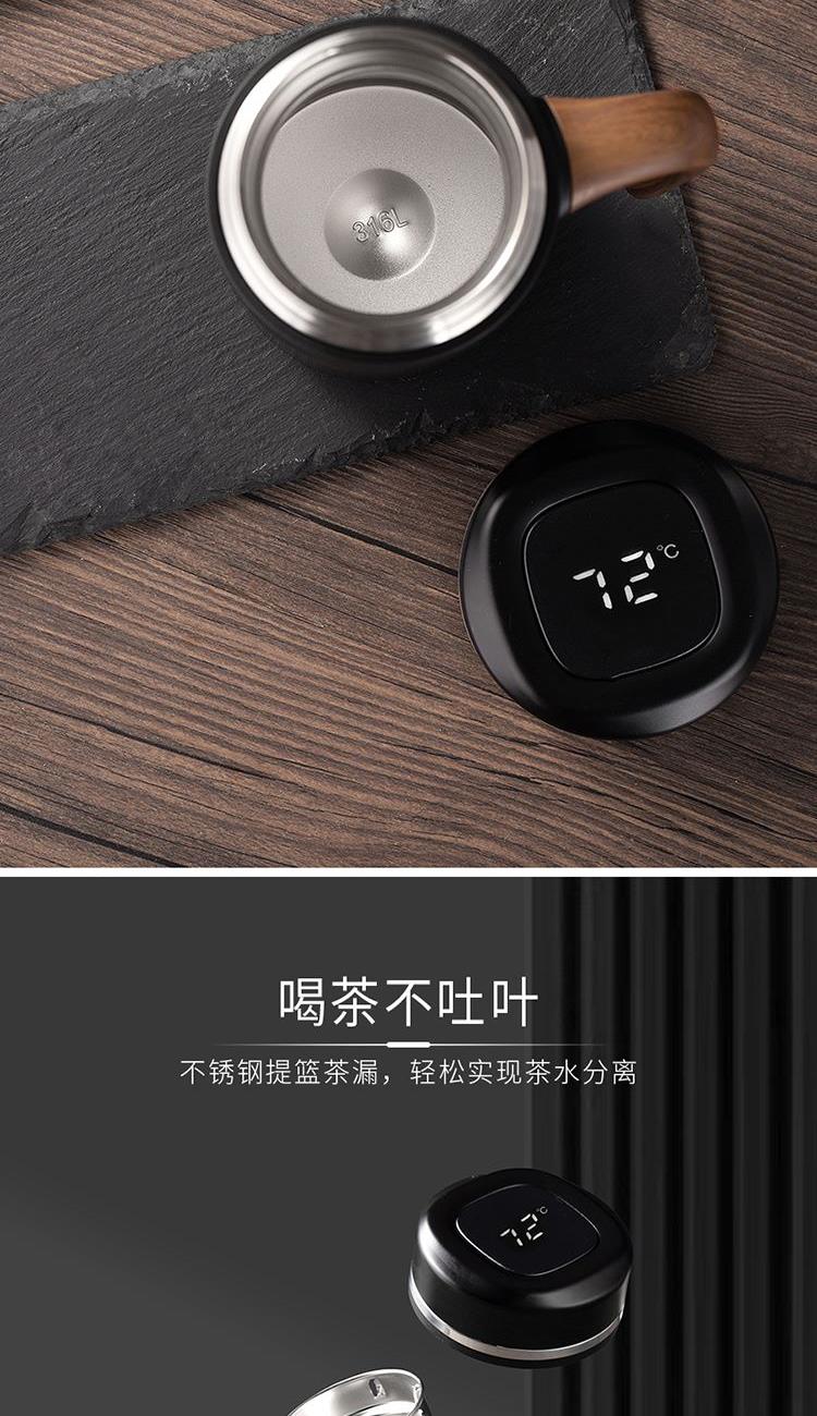•材质:内胆/304不锈钢 外壳/304不锈钢 手柄:手感漆+汽转印 食品级PP盖 •规格:480ML •包装:撕拉彩盒+手提袋 1.480ml大容量,不用频繁接水。 2.磨砂液晶显温屏,质感;温度一触即显,避免开水烫伤。 3.316不锈钢内胆,安全有保障。独立提篮茶隔,喝茶不吐渣。 4.仿木纹把手设计,特殊工艺触感漆喷涂,符合人体工程学,居家办公全场景通用。 5.礼盒包装,双色可选。