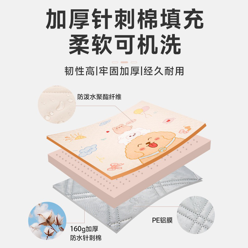 材质 春亚纺+160g针刺棉+抓绒双层铝膜 颜色 萌宠婴肤白 尺寸 200*200cm 重量 1.27kg 春亚纺环保面料、亲肤材质无异味 5层加厚超声波工艺、抗拉耐扯加厚更耐磨 抗污不粘草拍拍 抖抖就干净 方便清洗、可机洗 升级加厚160g针刺棉 防水防潮耐磨抓绒加厚PE铝膜底