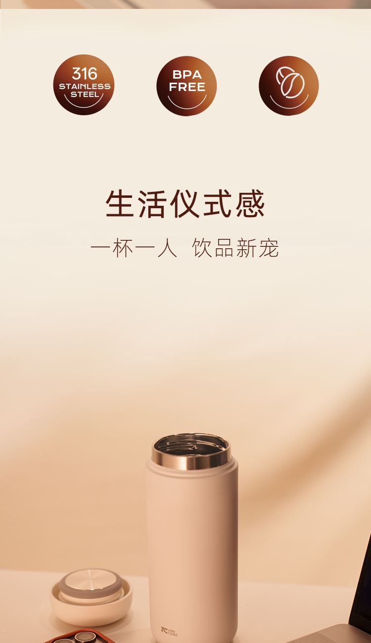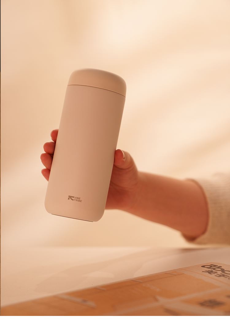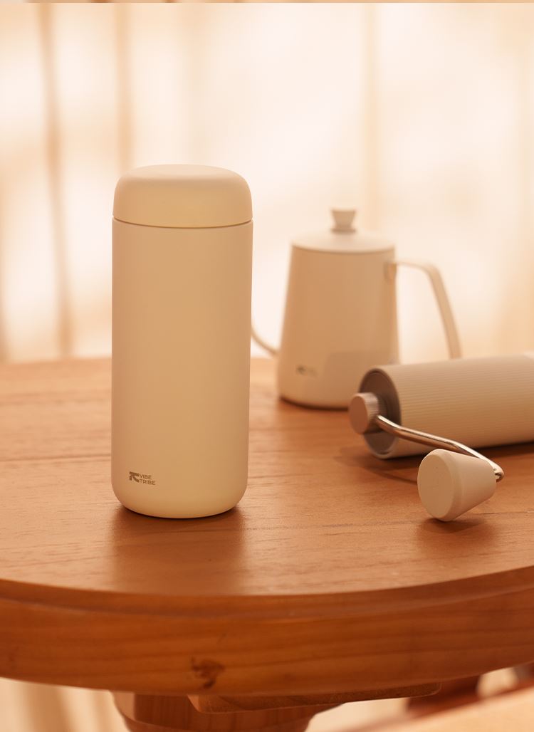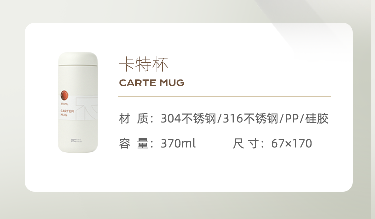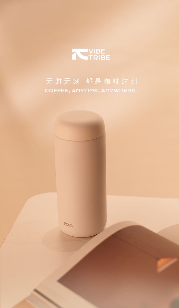 产品:VIBE-TRIBE卡特杯 产品尺寸:67*170 mm 彩盒尺寸:70*70*175 mm 产品材质:304不锈钢、316不锈钢、PP、硅胶 核心卖点: 1. 双层316不锈钢内胆,抗腐蚀不串味,保留咖啡 / 茶的原始风味;双层真空隔热,握感舒适不烫手;符合人体工学修长杯身,贴合虎口握姿;防滑硅胶垫,美观实用; 2. 月光白哑光漆面低调耐用,从户外到办公桌,全场景可用