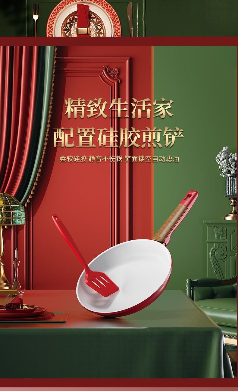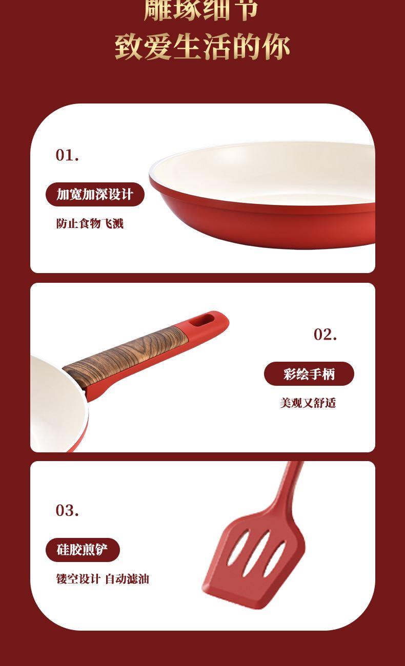 规 格:煎锅24cm 、煎铲 材 质:煎锅:优质精铁、煎铲:硅胶 颜 色:红色 彩 盒 尺 寸:29.5x7.3x46.3CM 外 箱 尺 寸:L68*W61*H47.8CM 1、采用加厚优质精铁打造锅身,耐高温陶晶不粘涂层。油烟少,不粘效果强。 2、煎牛排、煎蛋、煎鱼;煎炒两用,功能强大。 3、彩绘手柄设计,配置食品级硅胶煎铲,彰显高贵。 4、龙腾盛世主题彩盒包装,寓意国强民富,福运到来。