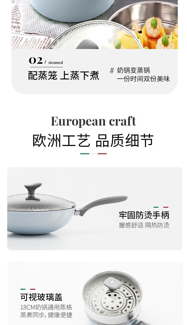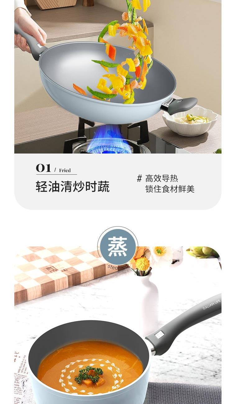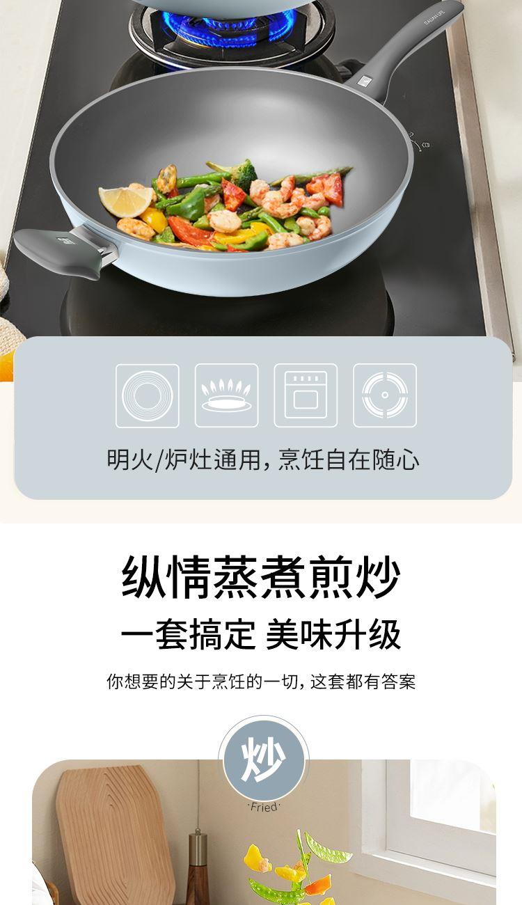 规格:32cm炒锅+18cm奶锅+18cm蒸格 材质:铝合金+陶瓷 单个尺寸:650*400*172 1、无铆钉,全锅无死角不藏污 2、配蒸笼上蒸下煮,一份时间双份美味 3、厚底薄壁,有效减少70%油烟 4、陶瓷外壁,久烧不易变色 5、不含PFAS PTEE,烹饪0担忧