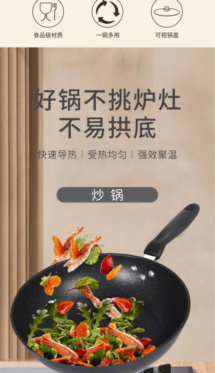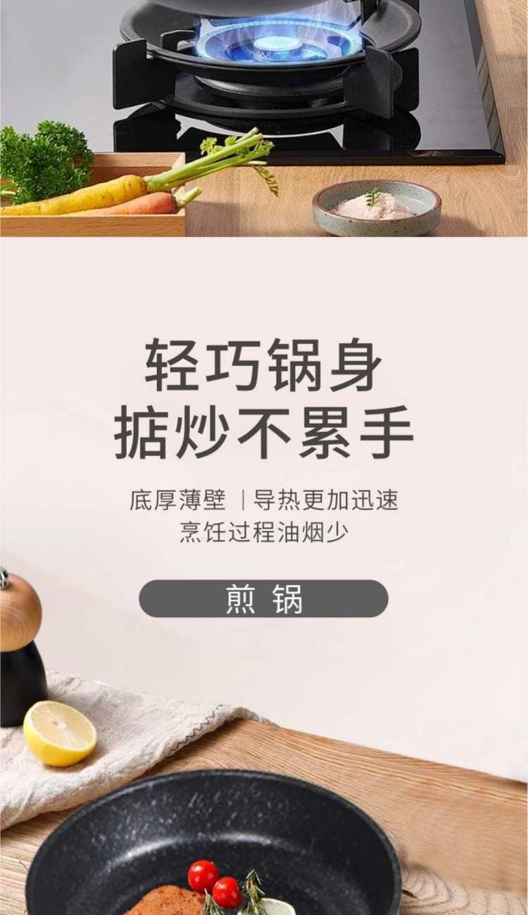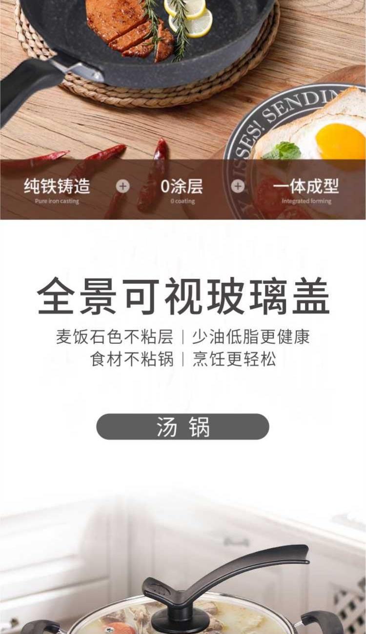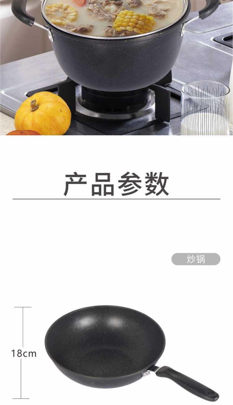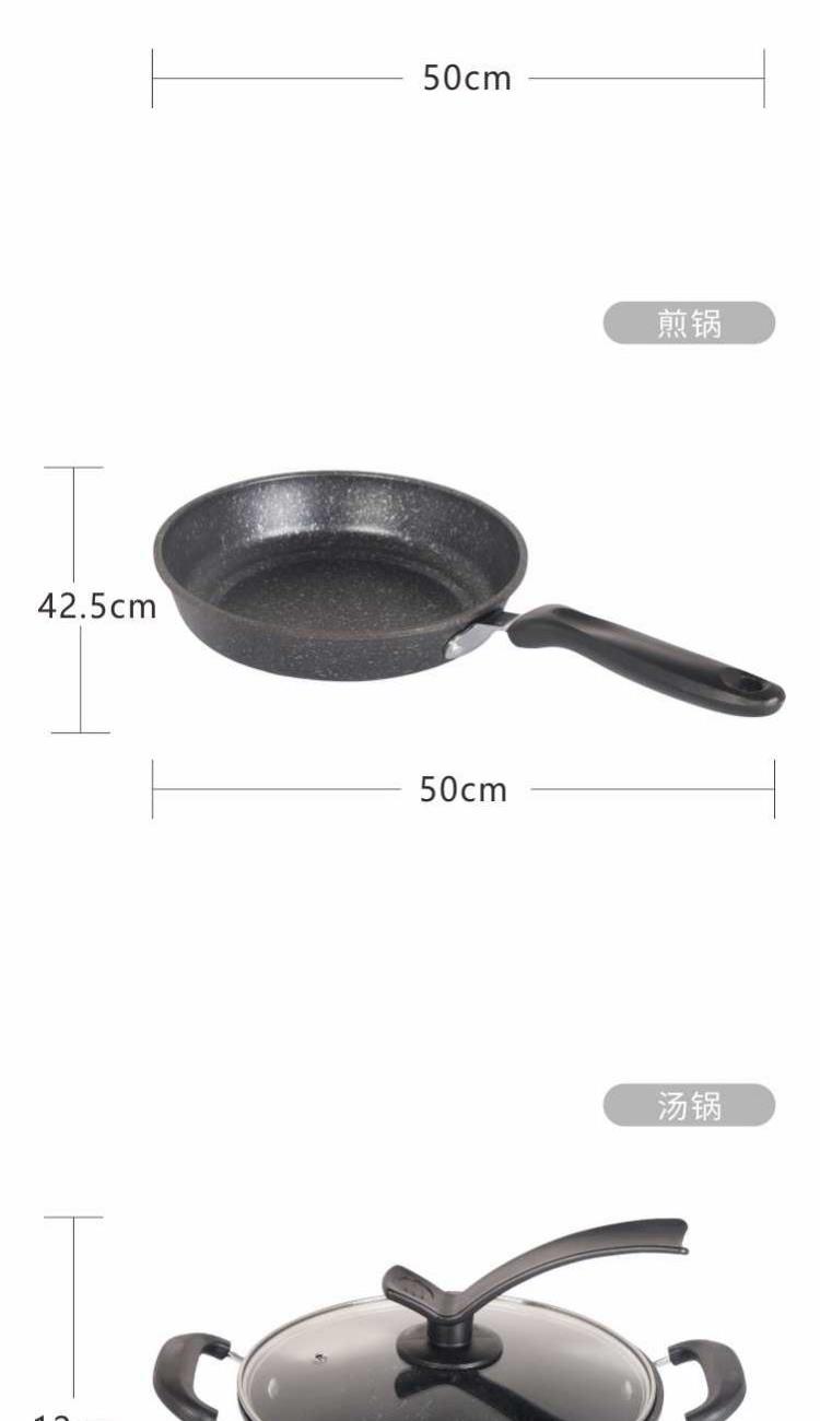 口径:炒锅 30cm、汤锅 22cm、煎锅 22cm 产品净重:2.8kg 产品毛重:3.0kg 整箱毛重:13.5kg 产品尺寸:炒锅 500 ⅹ 310 ⅹ 90mm 汤锅 420 ⅹ 230 ⅹ 120mm 煎锅 425 ⅹ 230 ⅹ 50mm 彩盒尺寸:475 ⅹ 165 ⅹ 320mm 外箱尺寸:670 ⅹ 475 ⅹ 335mm 材质:精铁 1、中式爆炒西式煎烤,精致生活有一套; 2、麦饭石色不粘层,少油低脂更健康,食材不粘锅,烹饪更轻松; 3、轻巧锅身,掂炒不累手,底厚薄壁,导热更加迅速,烹饪过程油烟少; 4、不挑炉灶不易拱底,快速导热,受热均匀,强效聚温; 5、好锅不挑灶,适用于明灶、电磁炉。