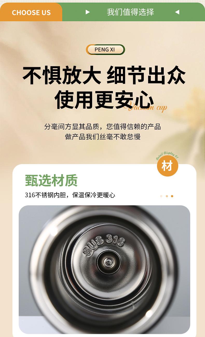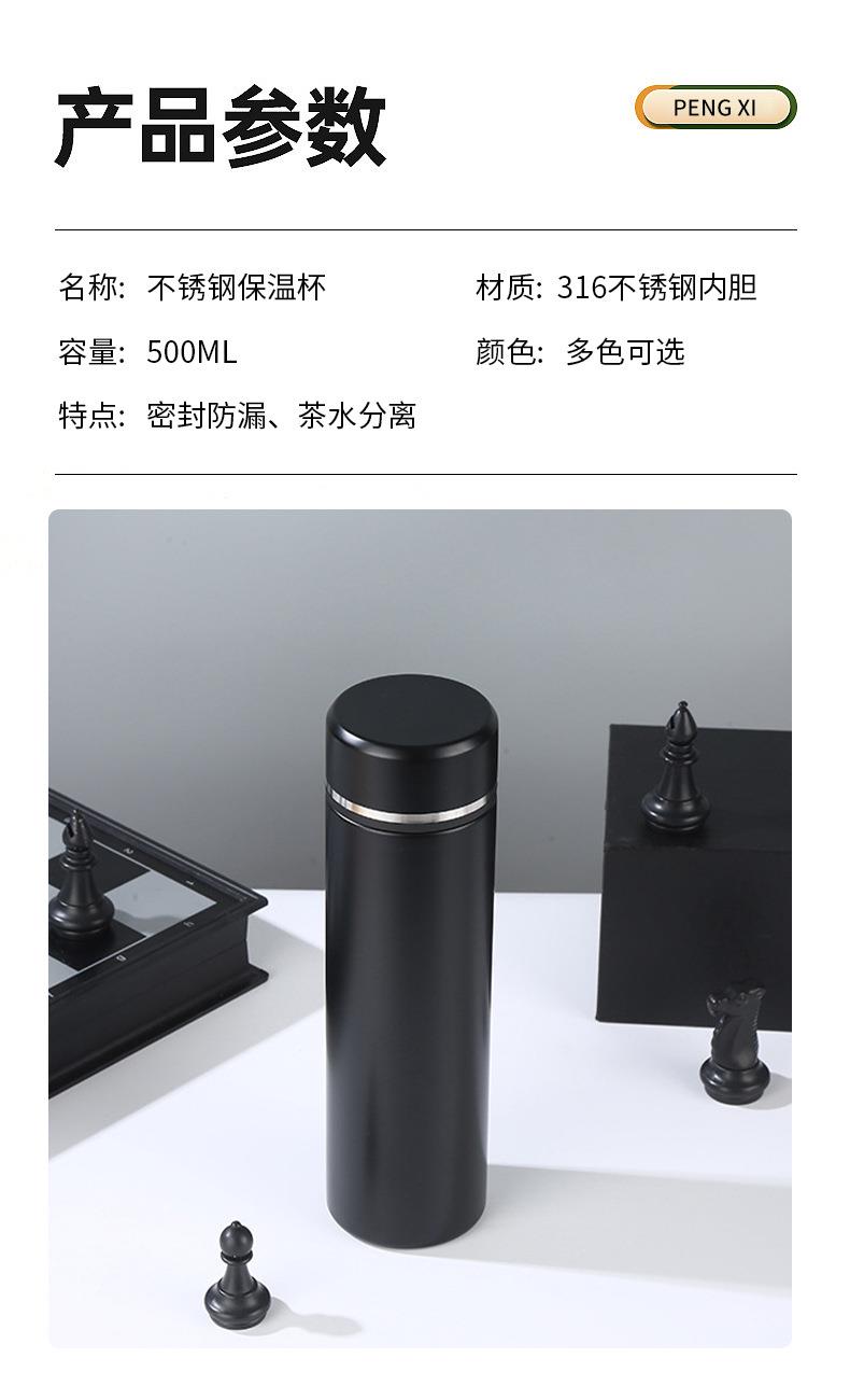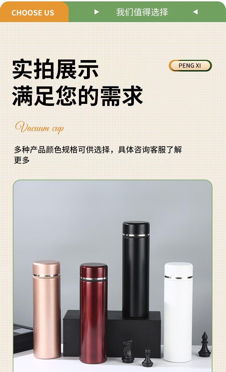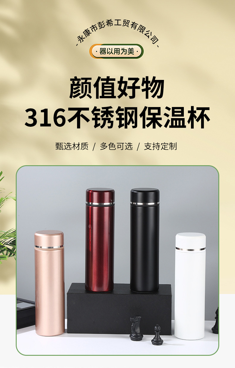 保温杯容量:500ml 材质:优质316不锈钢 颜色: 玫瑰金、金、酒红、本、蓝、黑、白 包装:彩盒 品质:精品杯 •选用优质316不锈钢,高温考漆工艺,无尾真空技术处理。 •杯口圆润光滑,精工细作,食品级PP塑料盖安全无异味。 •亮光漆面,简约又不失简单。雾面质感思腻尔温润 •未成年人请在大人指导下或告知后使用。