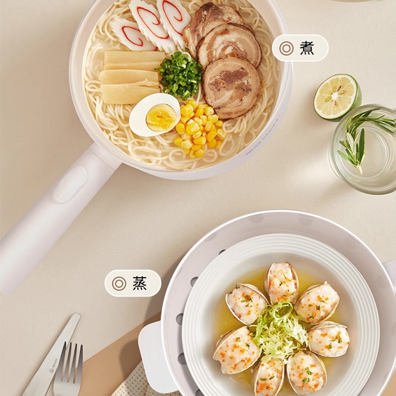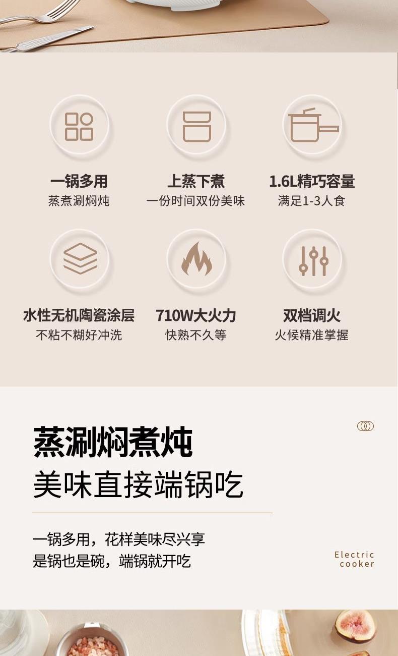 一锅多用,蒸煮涮焖炖,上蒸下煮,花样美味尽兴享 1.6L精巧容量,一人尝鲜不浪费, 两人分食吃过瘾,多种场景轻松拿捏 可视可直立锅盖,可当手机支架 加厚大蒸笼耐用不变形, 厚实放心蒸 陶瓷釉内胆, 不粘不糊好冲洗, 15.8cm加长手柄设计,拿握舒适 710W大火力, 双档推拉控火候,过热/干烧自动断电 产品容量:1.6L 产品材质:PP+陶瓷涂层 额定功率:710W 彩盒尺寸:42.3*13.8*22.5cm 外箱尺寸:69.5*44.5*59cm