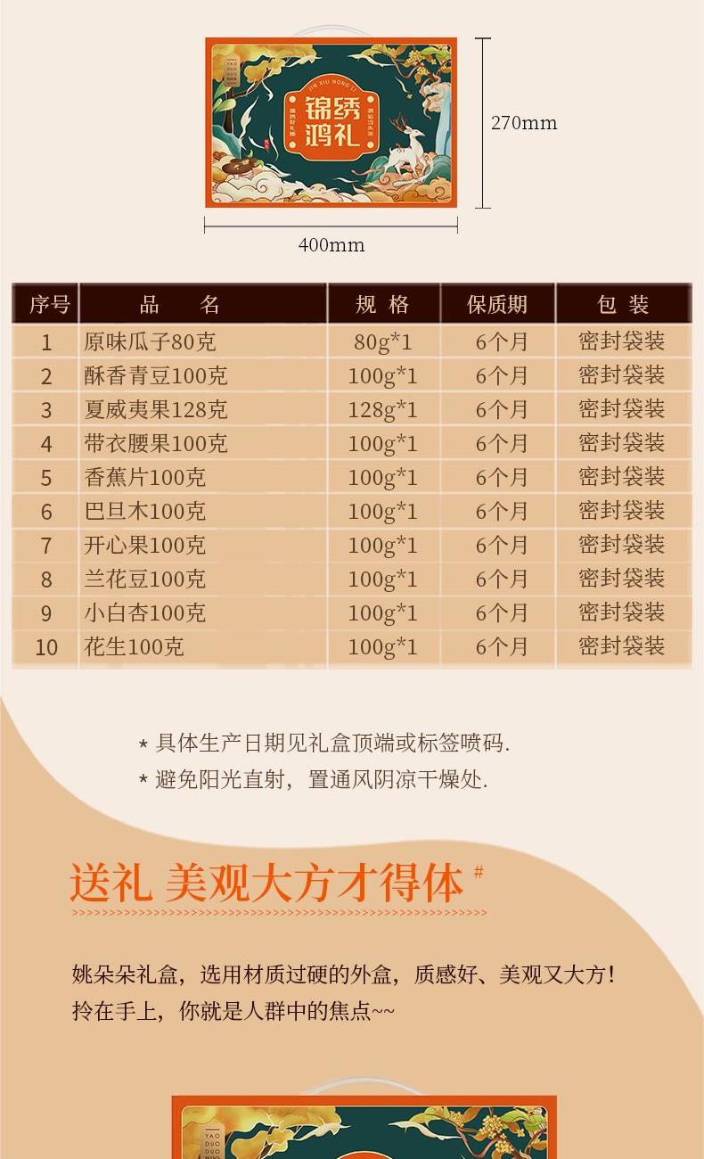原味瓜子80克 巴旦木100克 开心果100克 兰花豆100克 酥香青豆100克 带衣腰果100克 小白杏100克 夏威夷果128克 花生100克 香蕉片100克 锦绣鸿礼礼盒