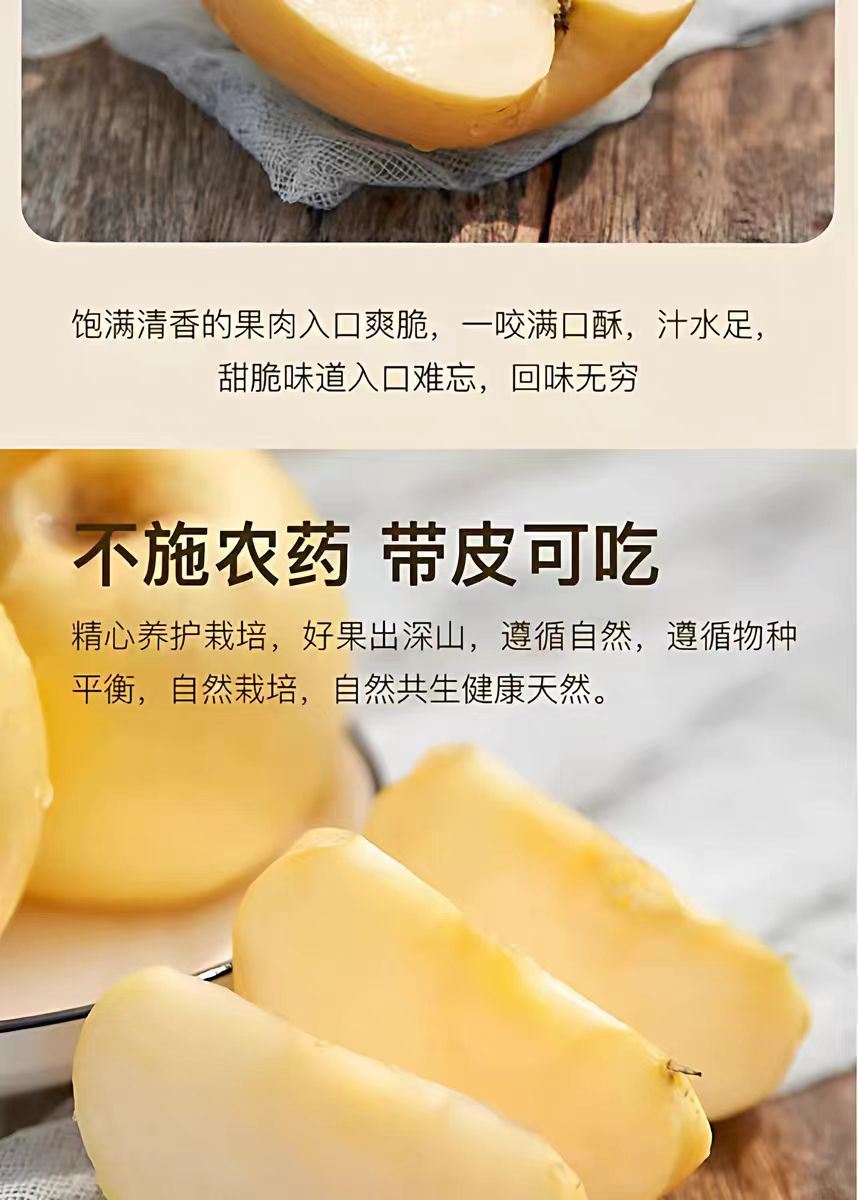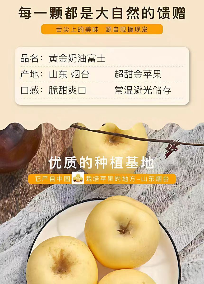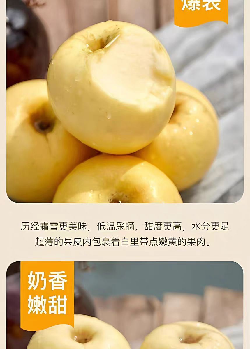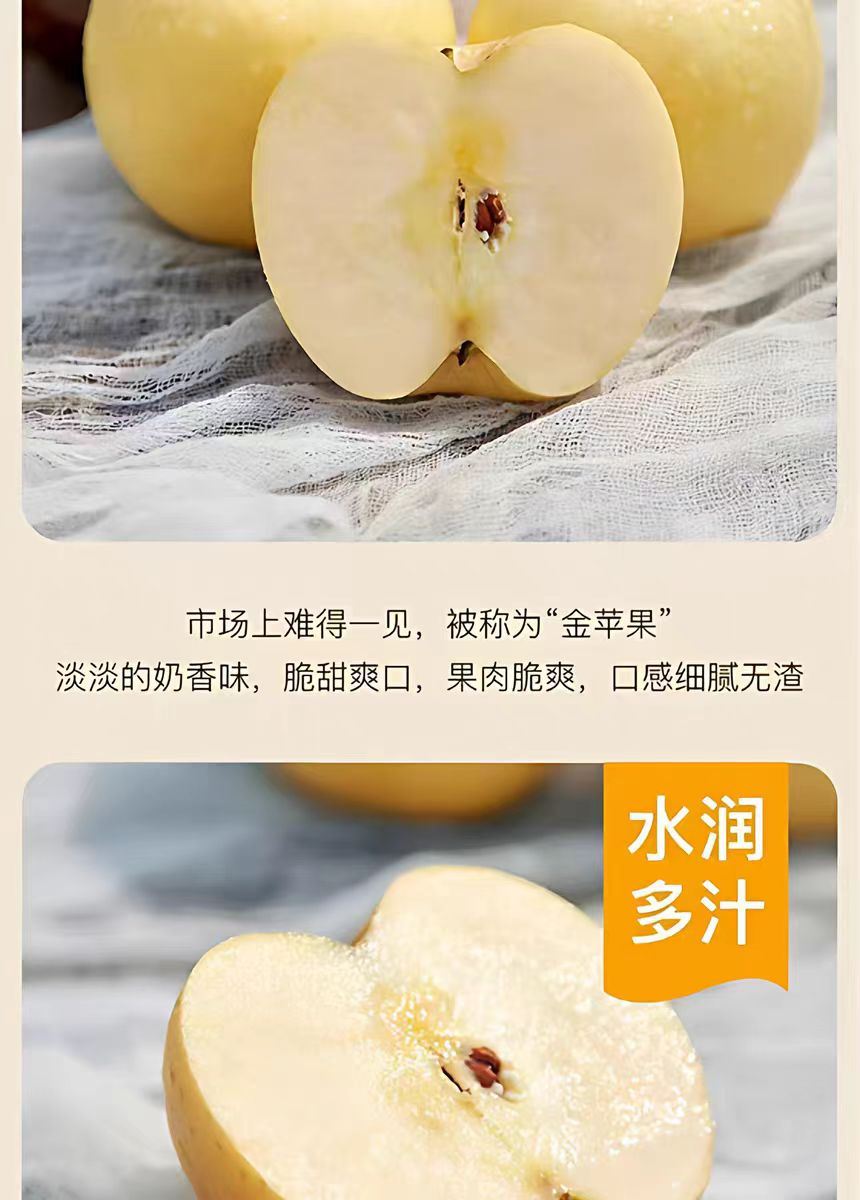 产地:⼭东 规格:8⽄ 上市时间:10⽉ 特点:果⽪呈奶⻩⾊,果⾁奶⽩⾊ 营养:富含维⽣素、矿物质 储存:冷藏