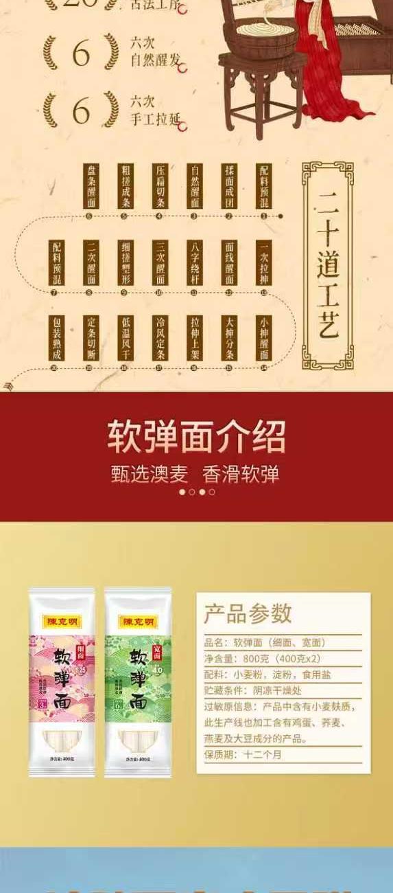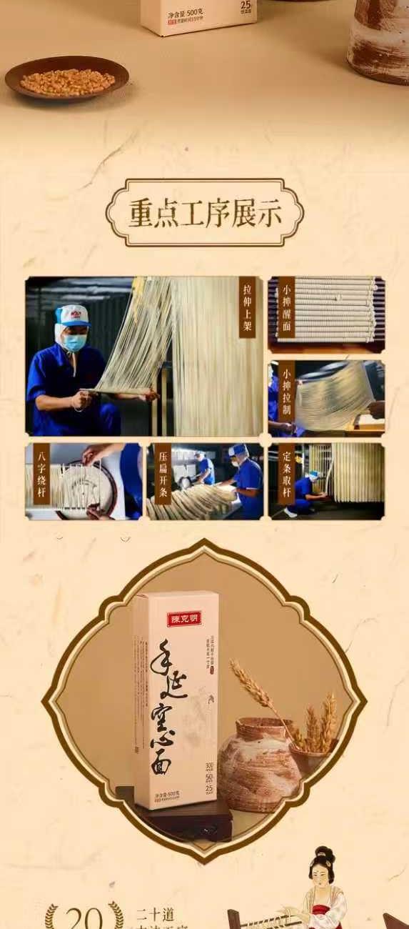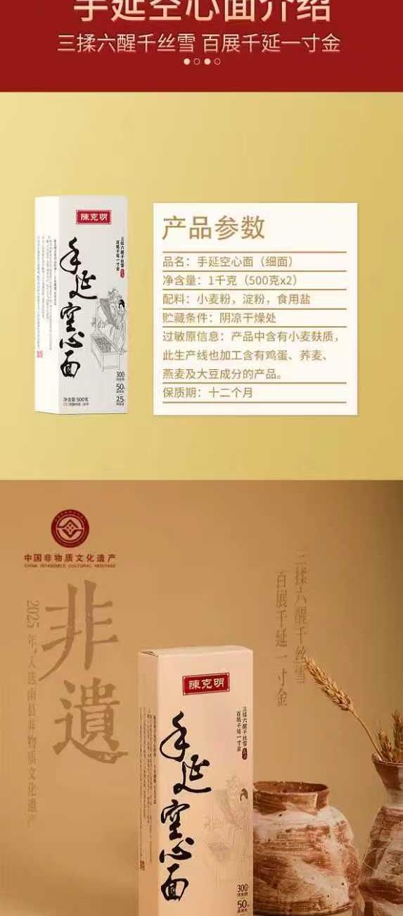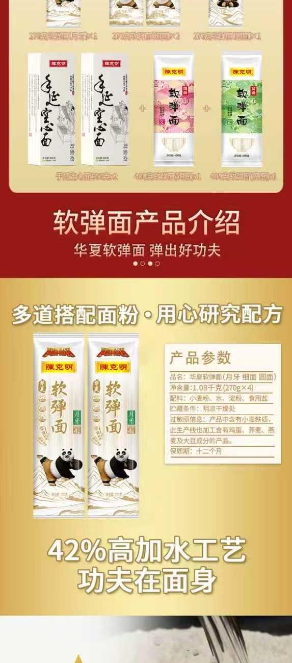 产品规格:净重2.88KG 纸盒陈克明手延空心面500g(龙须1.0)*2 陈克明软弹面(细面2.0)270g*2 陈克明软弹面(圆面1.25)270g*1 陈克明软弹面(月牙3.0)270g*1 陈克明华夏软弹面(细面)400g*1 陈克明华夏软弹面(宽面)400g*1 1、多种陈克明热销品组合 2、多熟成慢发酵,口感弹韧,丝滑如稠 3、科学加持传统工艺,严格质控,精美礼盒 送礼佳品