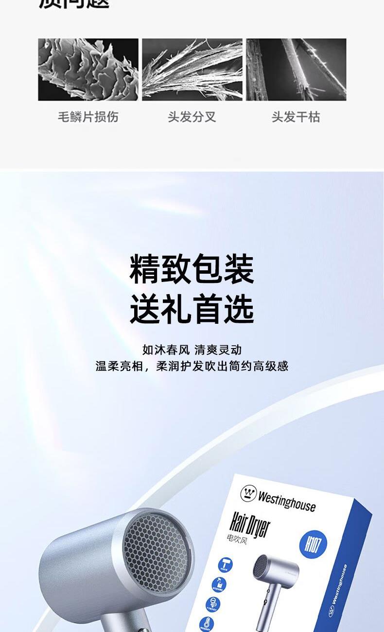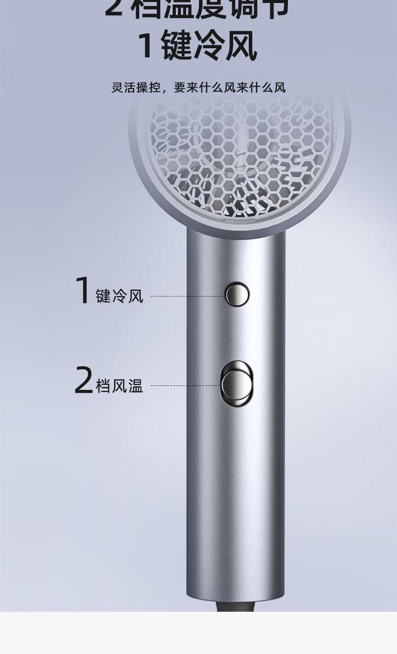 产品材质:阻燃PP 额定电压:220V~50Hz 额定功率:1800W 负离子:2千万 档位:三档 产品重量:500g 产品尺寸:273x206x87mm 商品条形码:6970539872468 创新无刷电机,1800W大功率; 20000转/分钟,气流强劲,速干无需久等; 释放高浓度2千万级负离子,远离静电,养发护发; 2档温度调节,1键冷风,灵活操控; 内置智能恒温温控器,实时监测风温,有效避免过热烫伤; 360°可旋转造型风嘴,多种造型轻松驾驭。