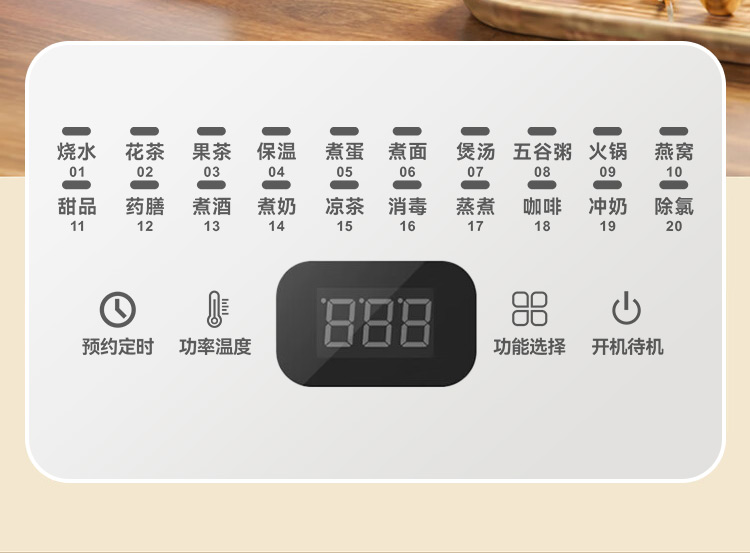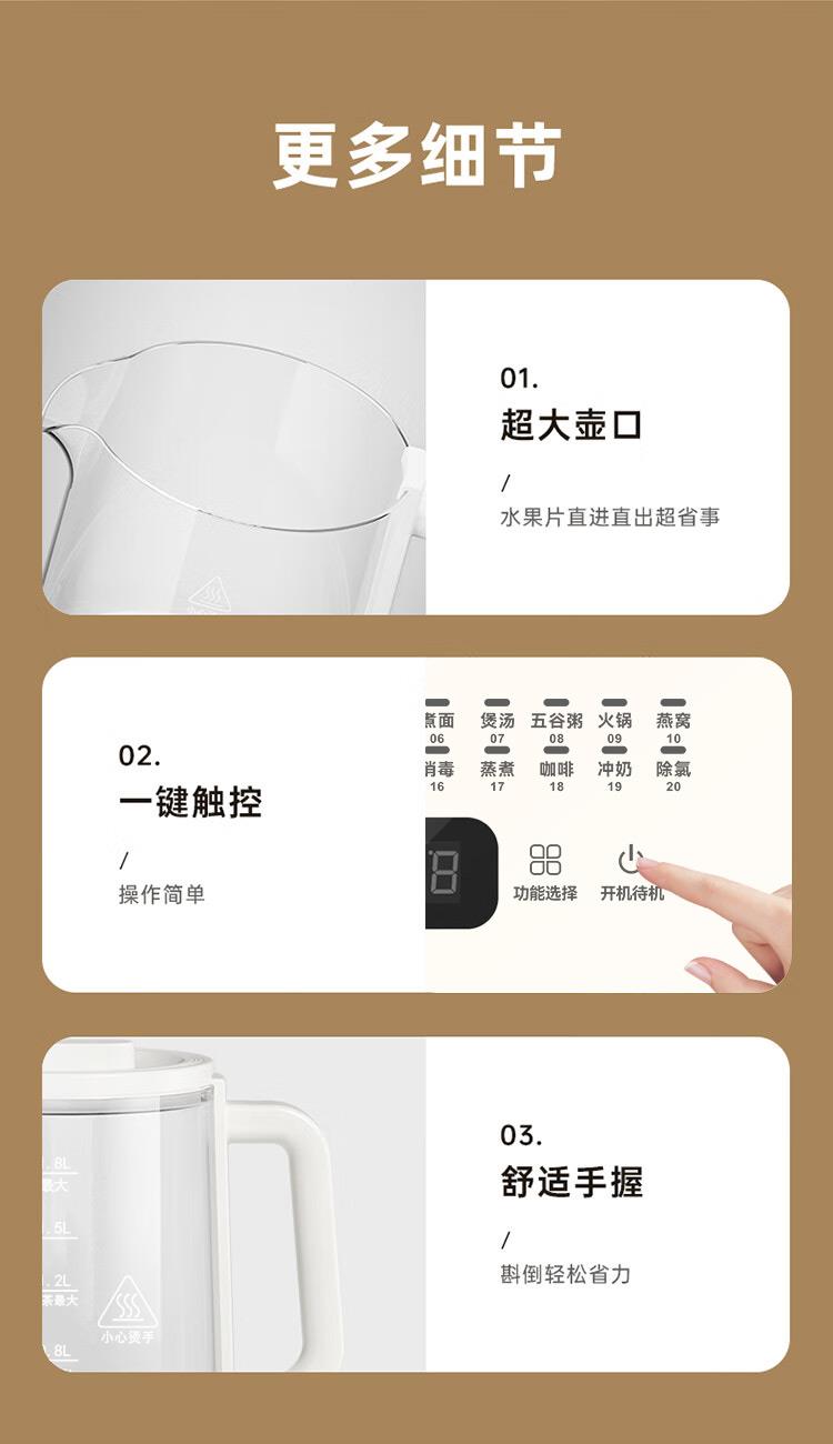额定电压:220V~ 额定频率:50Hz 额定功率:800W 产品容量:1.8L 重 量:1.3kg 颜 色:米白色 包装尺寸:259*246*242mm 包装清单:壶体、底座、说明书 主要材质:高硼硅玻璃 1.24小时智能预约+保温 2.1.8L大容量,独享畅饮 3.20项功能菜单,美味不重样 4.800W大功率,煮食只需片刻 5.高硼硅玻璃耐高温,冷热交替不易裂