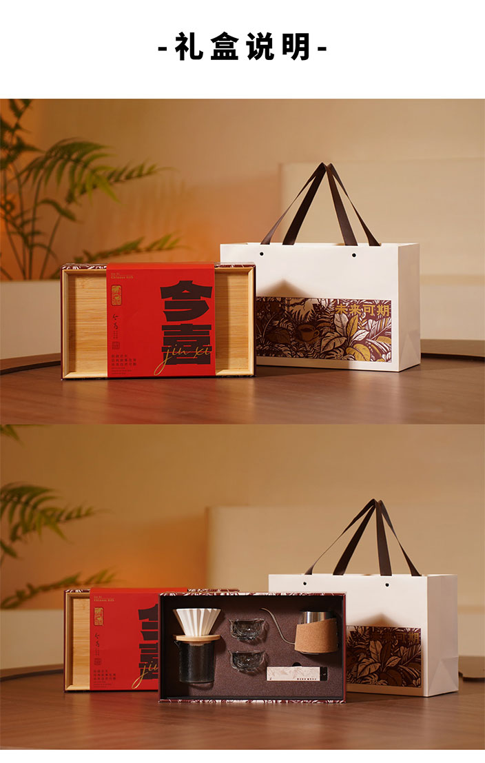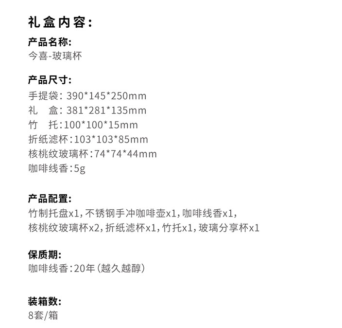 产品尺寸: 手提袋: 390*145*250mm 礼盒: 381*281*135mm 竹托:100*100*15mm 折纸滤杯:103*103*85mm 核桃纹玻璃杯:74*74*44mm 咖啡线香:5g 产品配置: 竹制托盘x1,不锈钢手冲咖啡壶x1, 咖啡线香x1,核桃纹玻璃杯x2, 折纸滤杯x1,竹托x1,玻璃分享杯x1