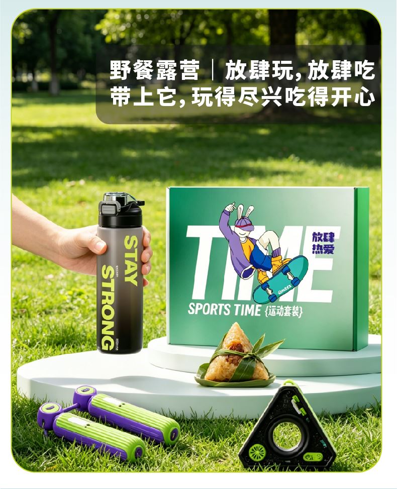 礼盒配置:渐变运动水杯* 1、荃盛粽子*2 计数握力器* 1 南湖牌高邮咸鸭蛋* 2、礼盒* 1