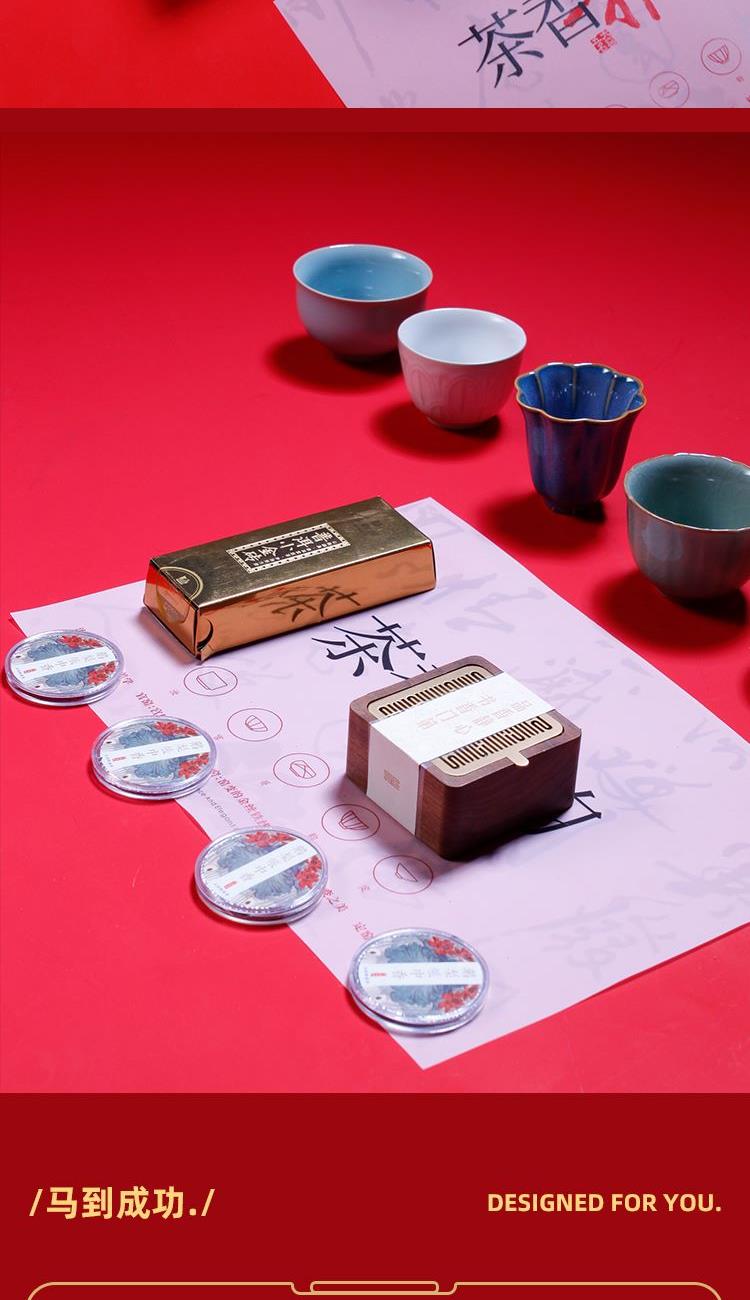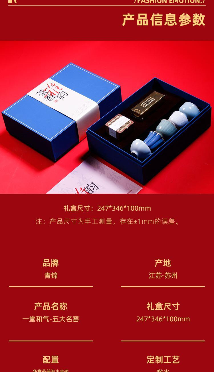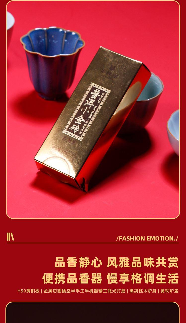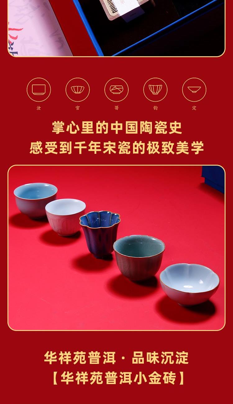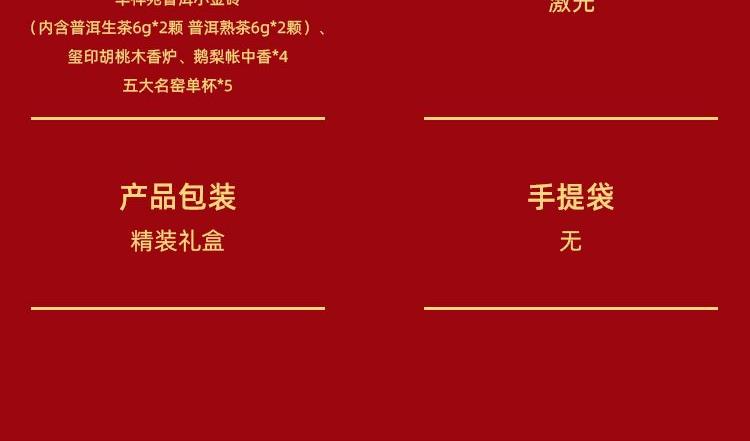 华祥苑普洱小金砖x1 (内含普洱生茶6g*2颗 普洱熟茶6g*2颗) 玺印胡桃木香炉*1 鹅梨帐中香*4 五大名窑单杯*5 礼盒*1 手提袋*1 五大名窑历史文化感拉满 祝福与创意的结合 胡桃木玺印香炉原创设计精致典雅 华祥苑普洱小金砖放心好喝精装艺术纸礼盒可以定制
