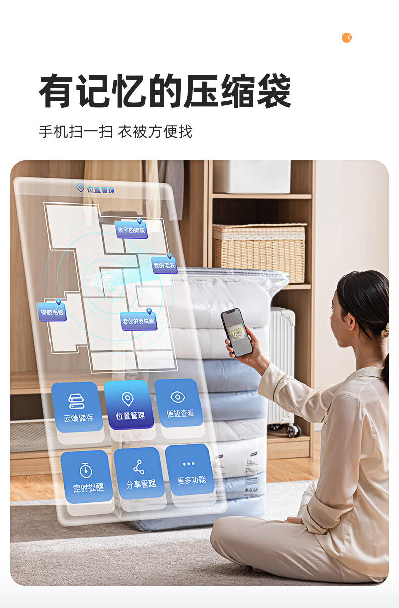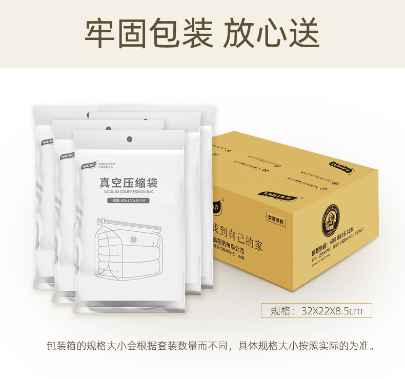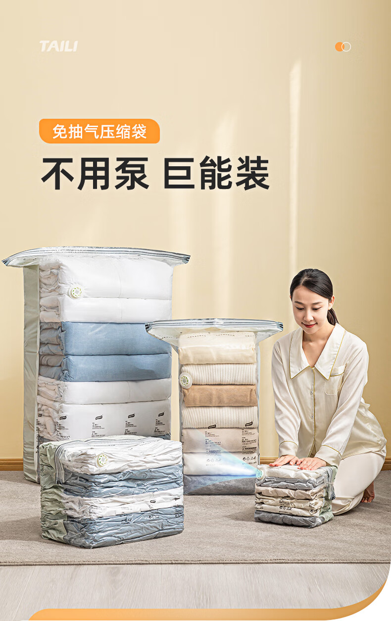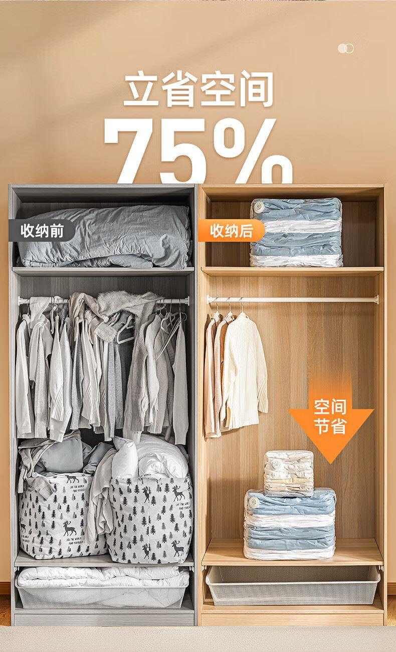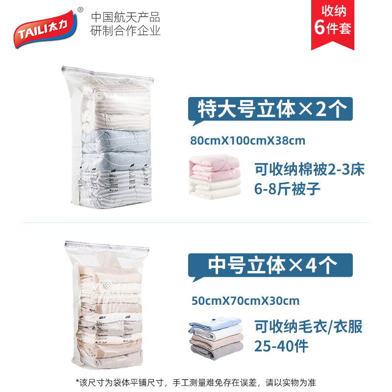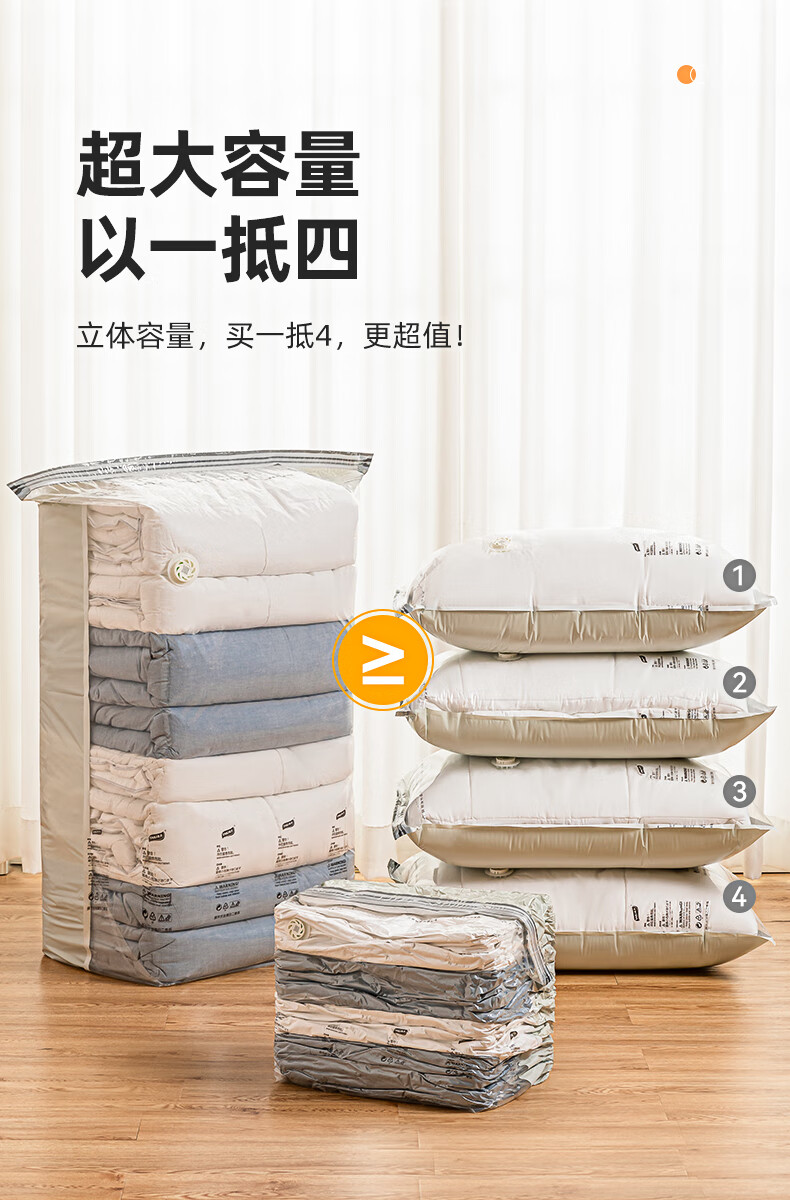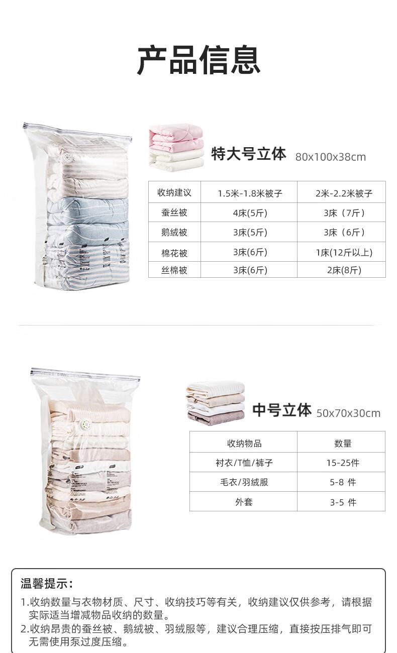 产品尺寸:80*100*38cm(2) 50*70*30cm(4) 厚度:7丝 材质:PE+PA 适用对象:被子,衣服,玩具 类别:压缩袋 适用场景:卧室,旅行 产品描述:无需电泵;自研气阀,3S排气;密封升级,持久防漏;升级材质,更耐用;双层密封条,抗压更防漏;权威认证,健康无味;手机扫一扫,衣服方便找;