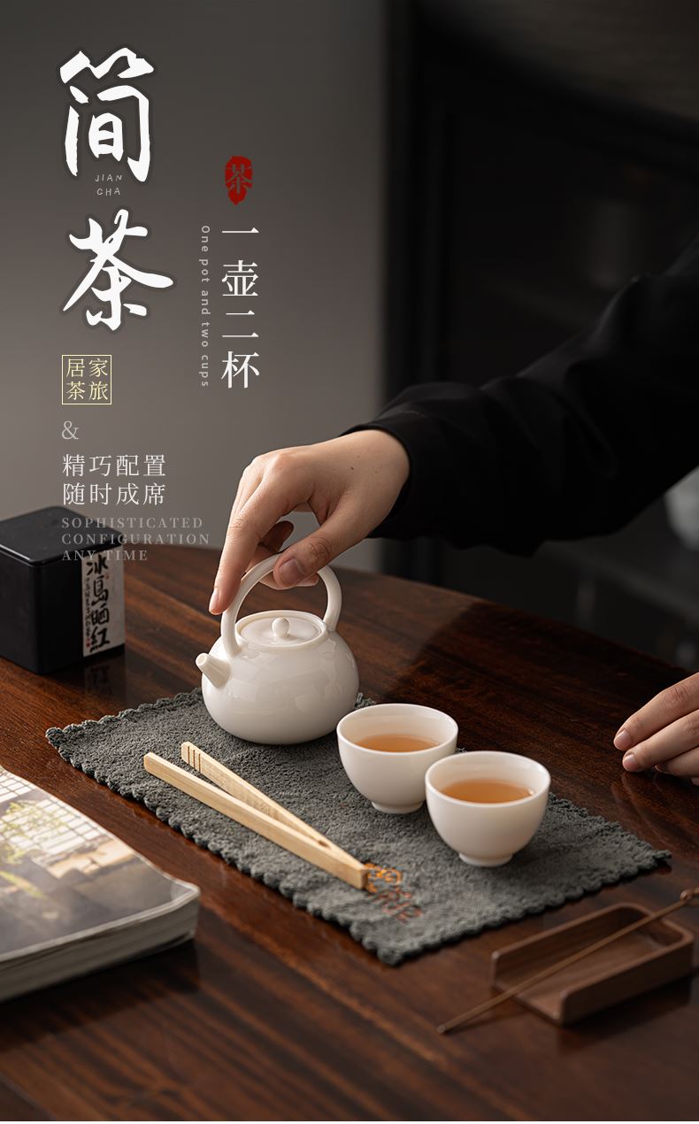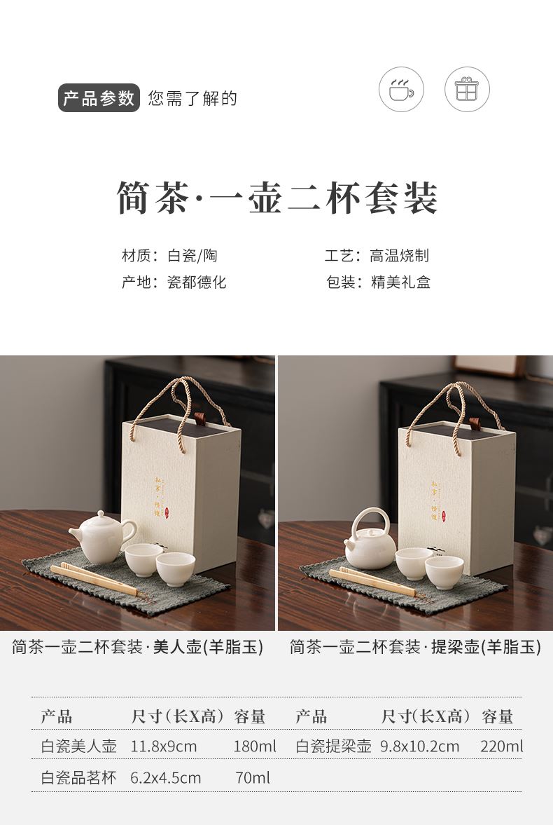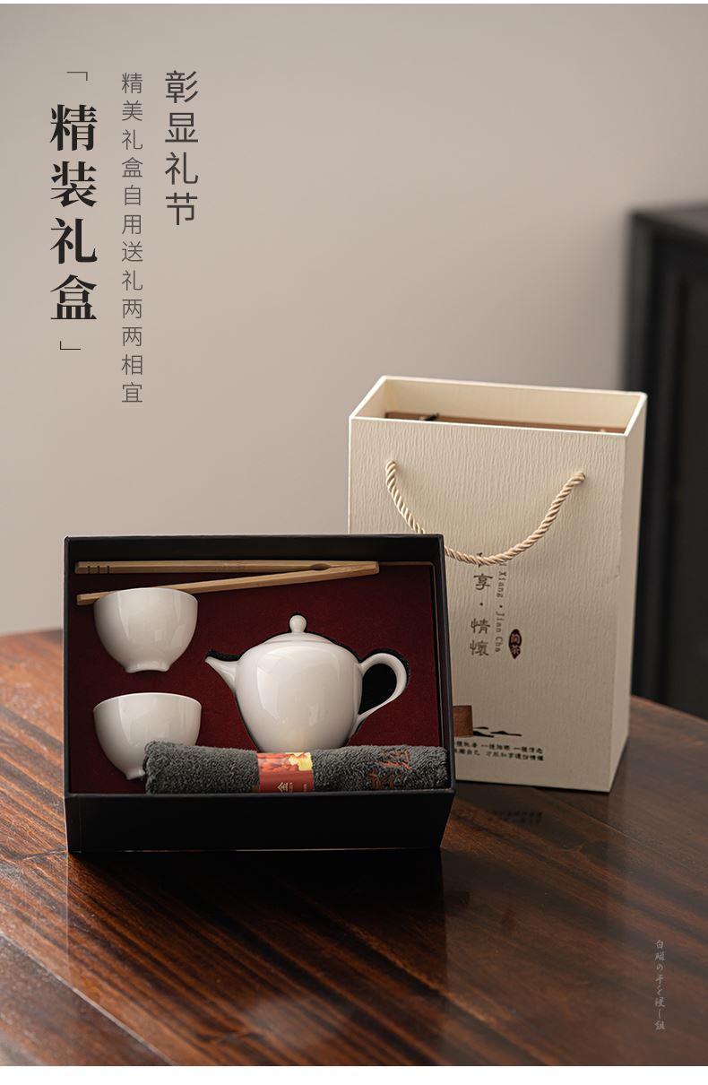 《简茶》 以纯棉材质的茶巾为配件,可以当茶席,又可以当做茶巾使用!非常实用的小套组,适合居家,办公旅行使用。 材质/工艺:羊脂玉瓷/粗陶 配置:茶壶*1+茶杯*2+茶巾+茶夹+礼盒+手提袋 礼盒尺寸:22.1*16.8*11.3cm