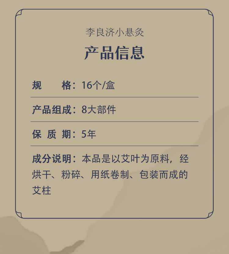 产品:小悬灸 规格:16个/盒 贮藏方法:阴凉干燥通风处存放 随身携带,随用随灸 精选三年陈艾,安全防烫 礼盒包装,送礼佳选