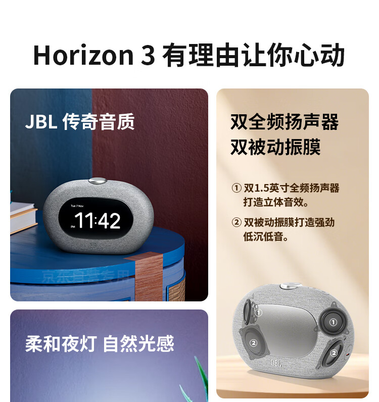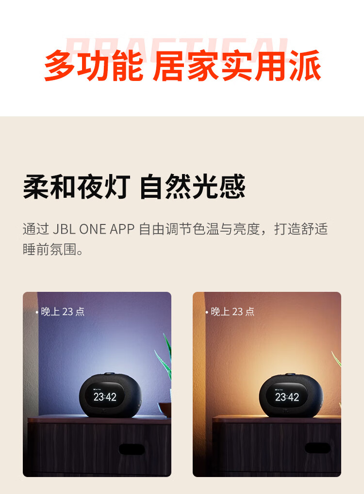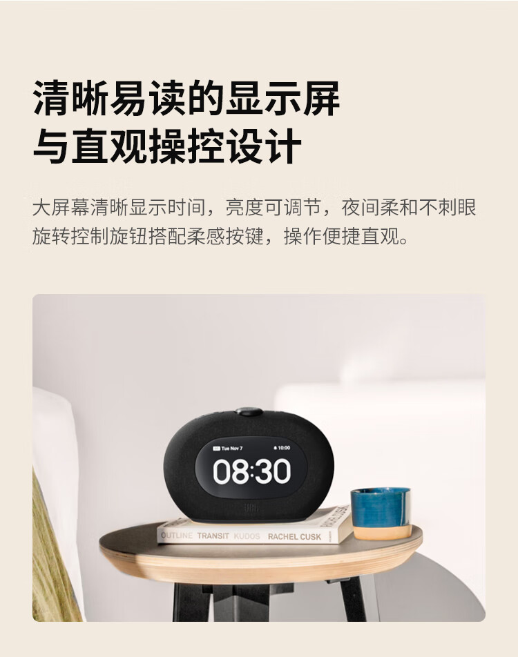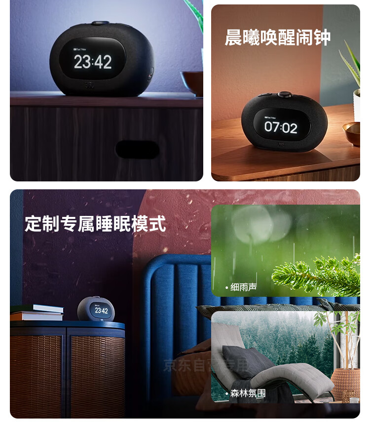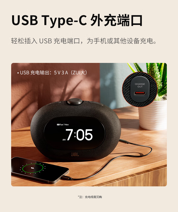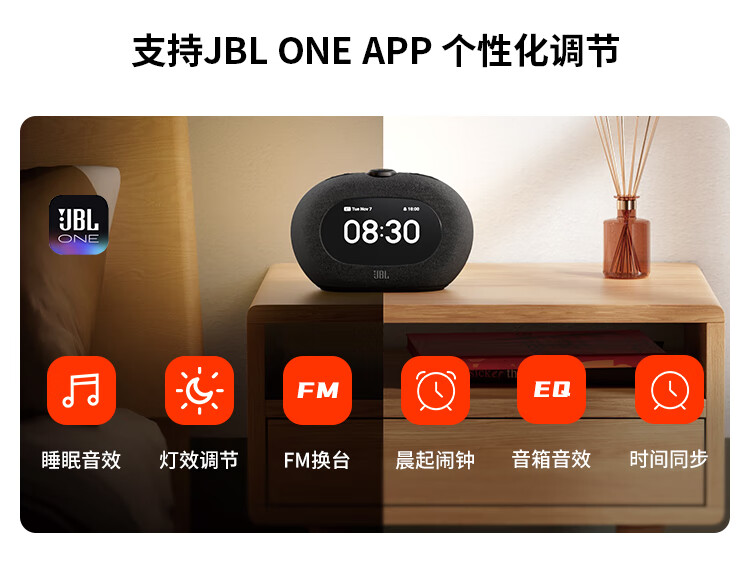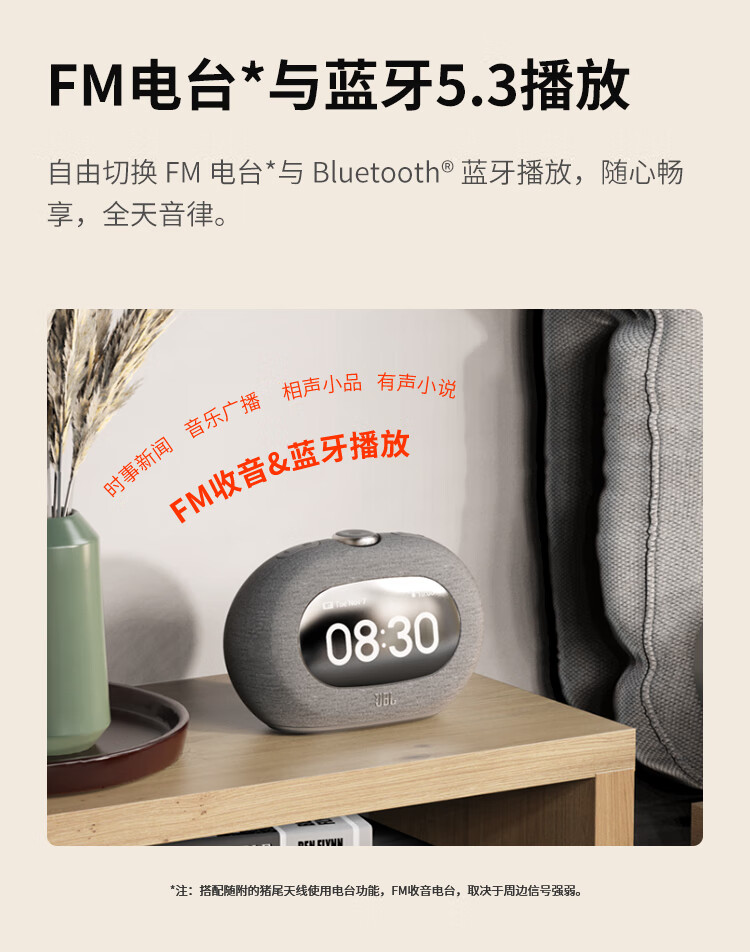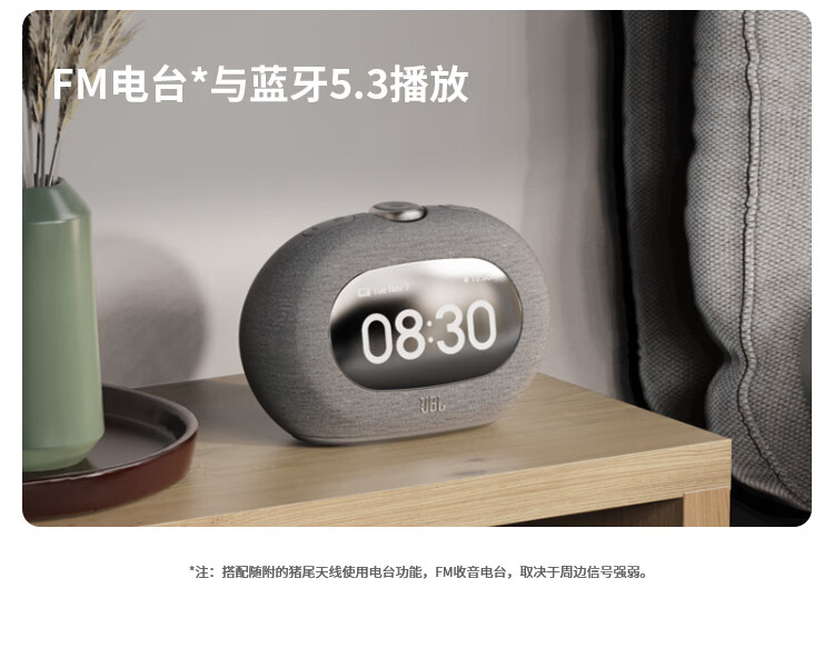 牙闹钟音箱 家用卧室音响 环境夜灯 FM调频收音 双全频扬声器双被动振膜 柔和夜灯 自然光感 晨曦唤醒闹钟 FM电台*蓝牙5.3播放 支持JBL ONE APP个性化定制
