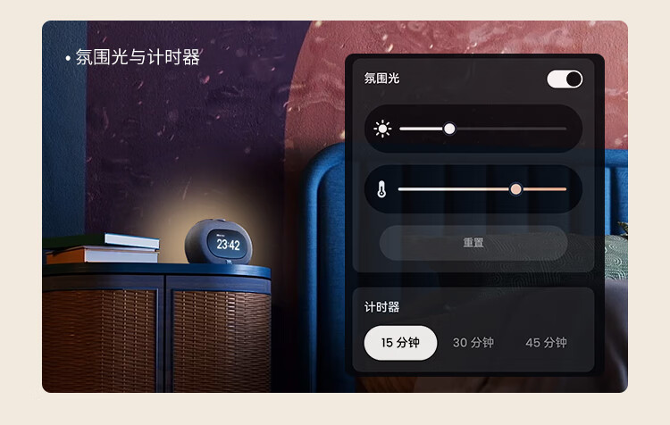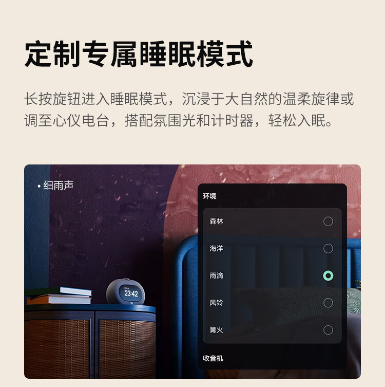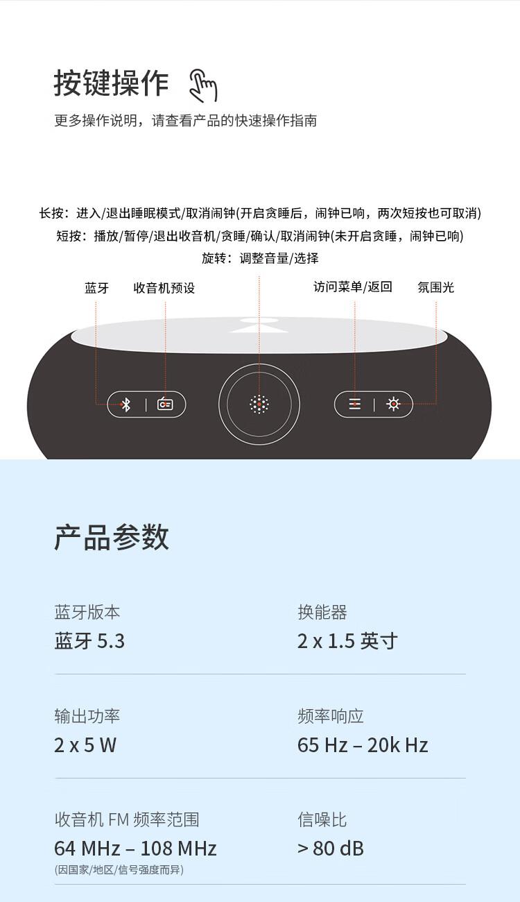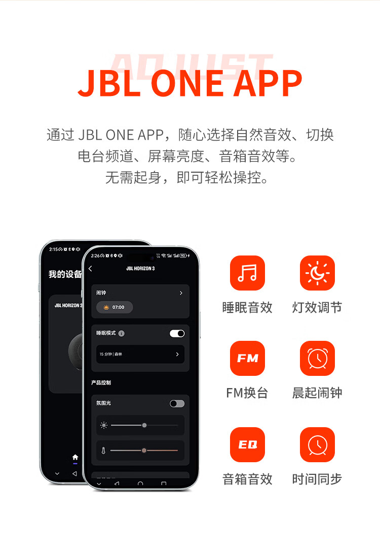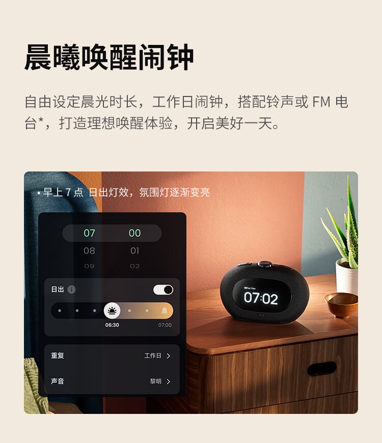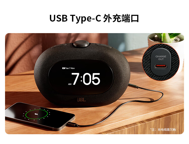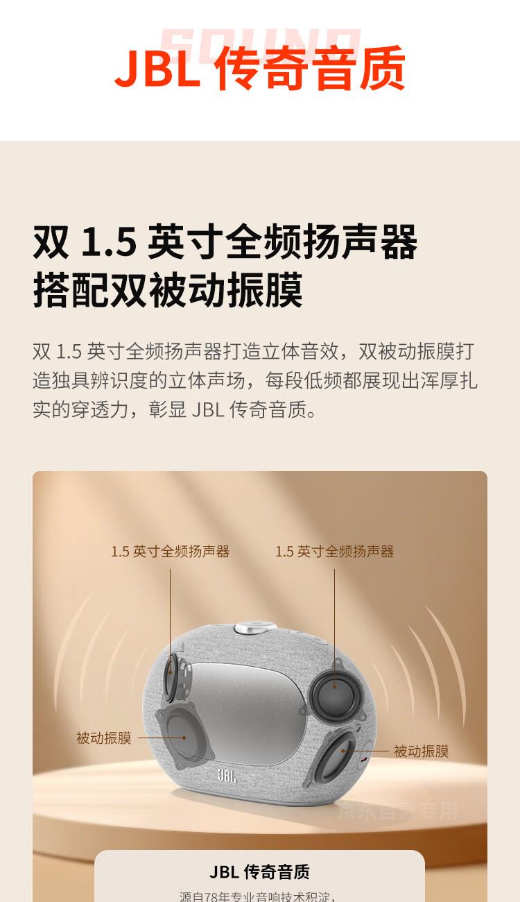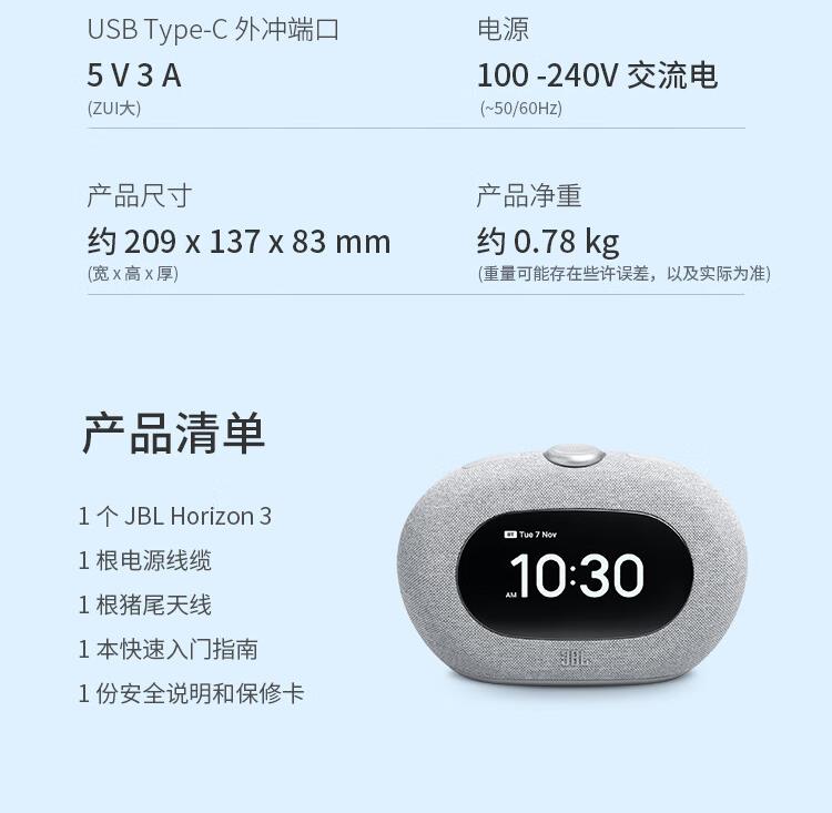 牙闹钟音箱 家用卧室音响 环境夜灯 FM调频收音 双全频扬声器双被动振膜 柔和夜灯 自然光感 晨曦唤醒闹钟 FM电台*蓝牙5.3播放 支持JBL ONE APP个性化定制