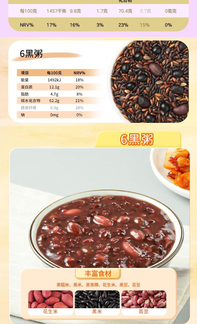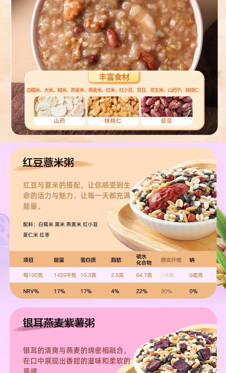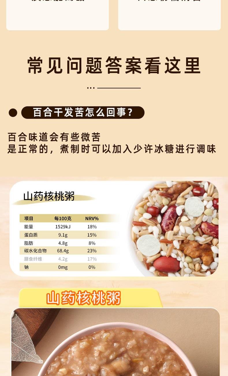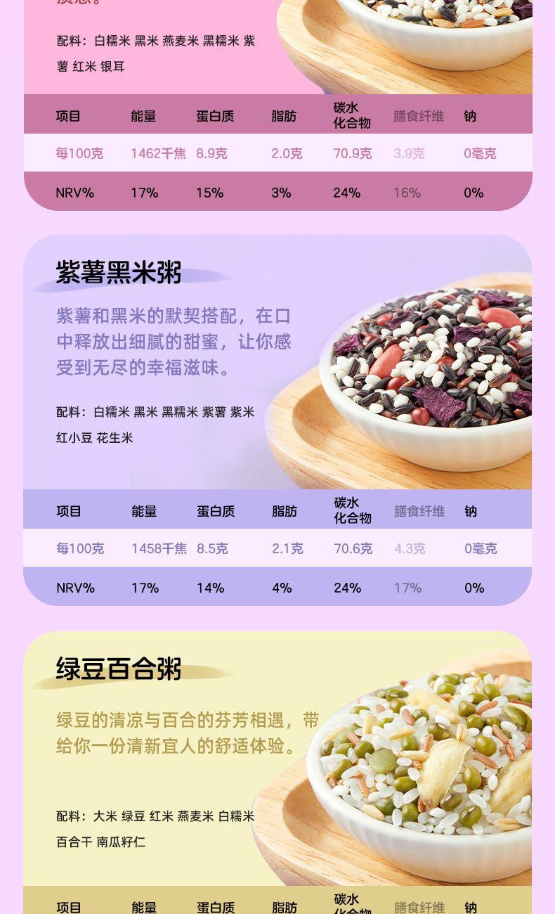 产品信息: ①规格:1.55kg ②内配:莲子250g,绿豆500g,银耳100g,百合干100g,山药核桃粥料100g,红豆薏米粥料100g,银耳燕麦紫薯粥料100g,6黑粥料100g,紫薯黑米粥料100g,绿豆百合粥料100g ③贮存条件:避免阳光直射,置于阴凉通风干燥处 ④特点:种类丰富一次备齐、相互搭配,简单易做、洗净加水放入电饭煲,一键轻松搞定