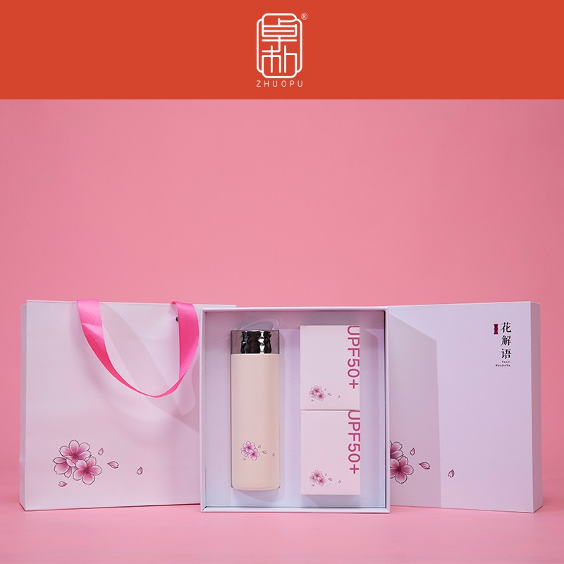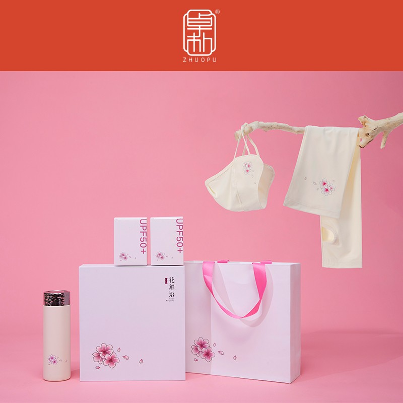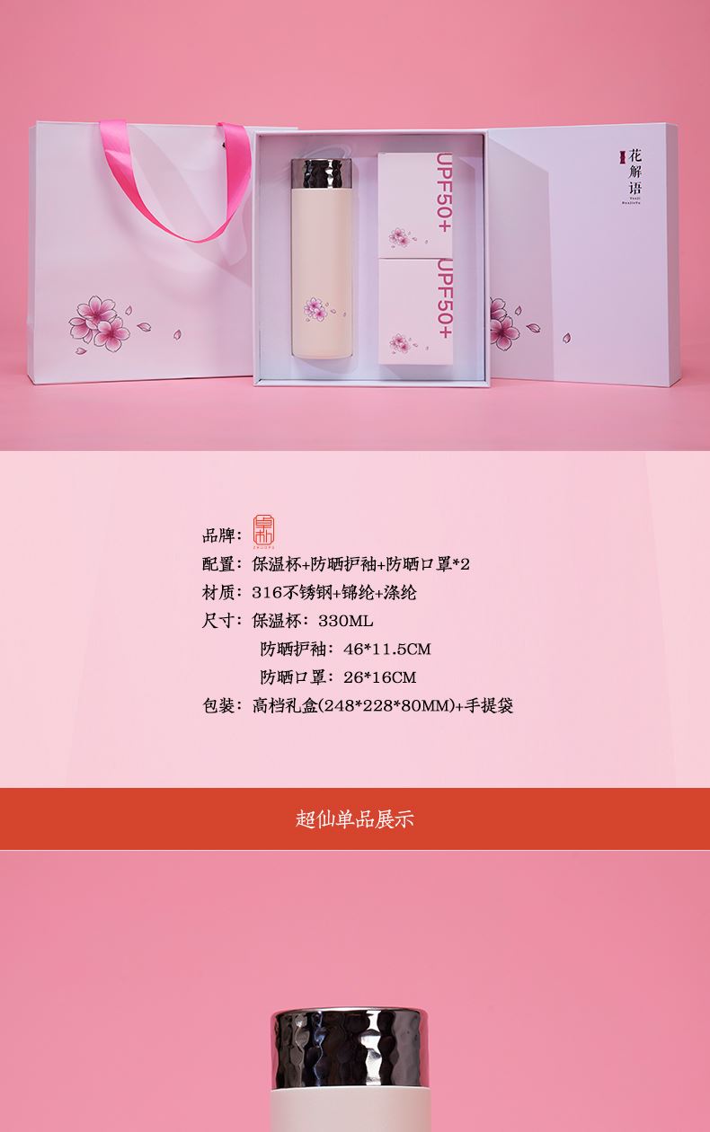 配置:保温杯+防晒护袖+防晒口罩*2 材质:316不锈钢+锦纶+涤纶 尺寸:保温杯:330ml 防晒护袖:46*11.5cm 防晒口罩:26*16cm 包装:礼盒(248*228*80mm)+手提袋