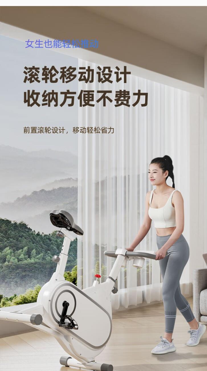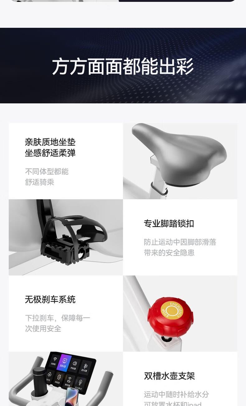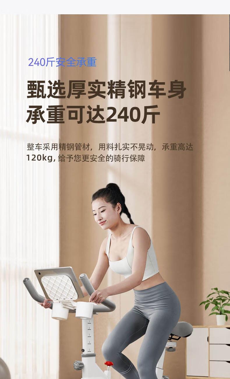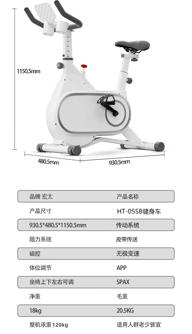 产品:HT-O5SB健身车 传动系统:皮带传送 阻力系统:无级变速 体位调节:坐椅上下左右可调 APP:SPAX 净重:18kg 毛重:20.5KG 整机承重:120KG 产品尺寸:930.5*480.5*1150.5mm 适用人群:老少皆宜 颜色:白色 足不出户尽享运动欢益,转速顺畅稳定,增加您的乐趣体验,无极阻力调节,紧急快速按压刹车变速阻力调节,6KG电镀实心大车轮,飞轮越重骑起来越稳,负荷更稳定,多档位调节坐垫,满足不同身高调节,智能多功能显示屏,电子表盘简约设计,聪明的车身设计,是畅快骑行的根本,结实能承才是硬道理,120KG承重,潮流设计解救颜控。