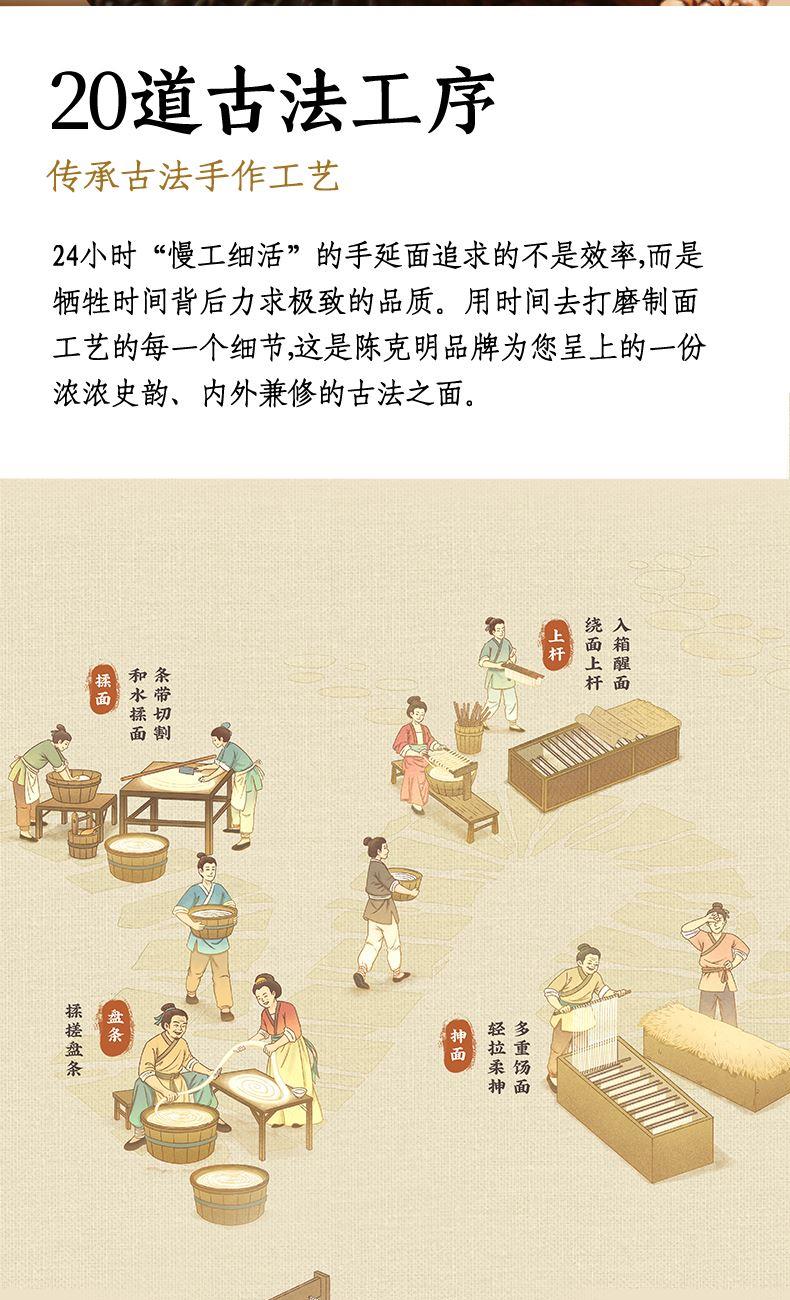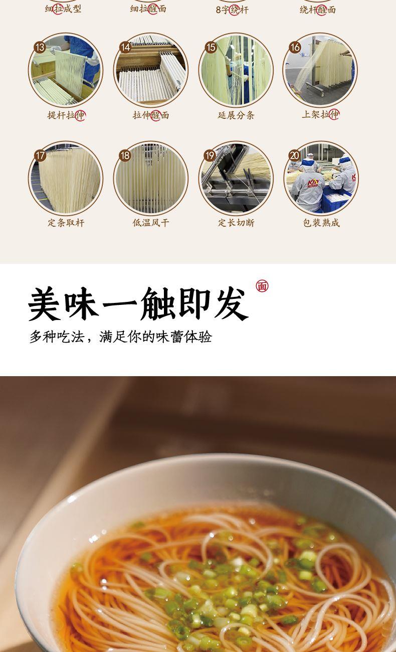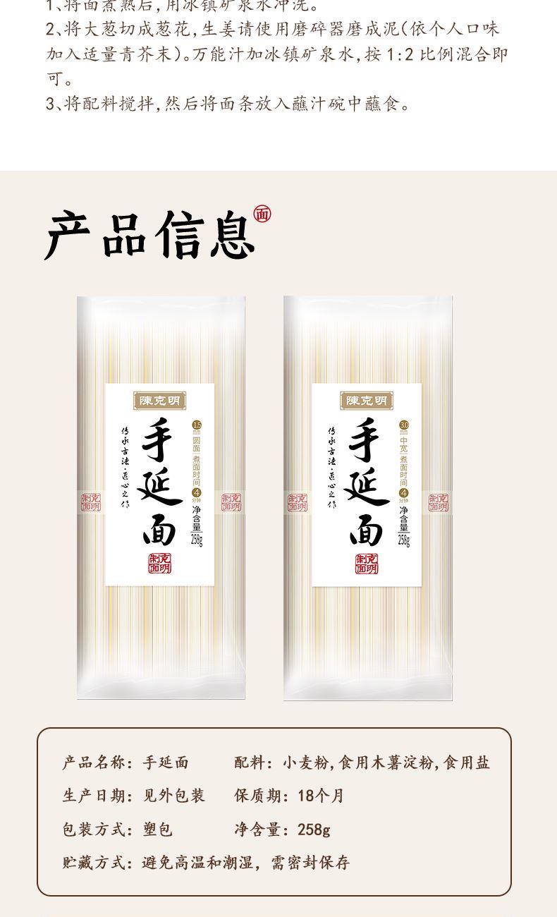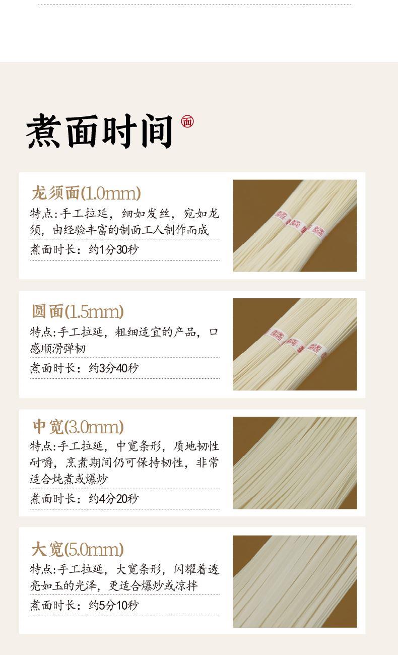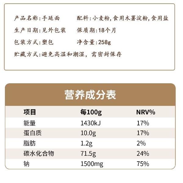 产品规格: 手延面(圆面1.5mm) 258g*3 1、二十道古法,六醒六抻更弹韧; 2、多熟成慢发酵,入味易熟好吸收 3、甄选进口澳麦麦源,口感弹韧,丝滑如稠 4、科学加持传统工艺,严格质控,美味安心享用