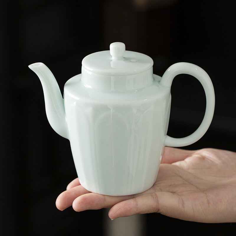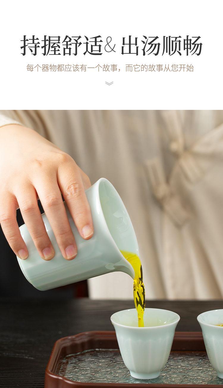 配置:高壶*1 品茗杯*6 茶海*1 玻璃茶盘*1 皮包*1 材质:影青瓷 礼盒尺寸:34.2cm*13.2cm*19.5cm 产品尺寸:品茗杯 60ml 盖碗 200ml 壶 250ml 茶海 230ml