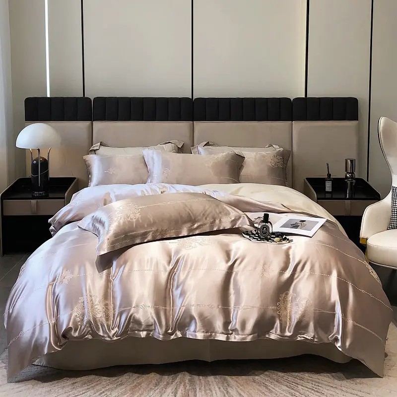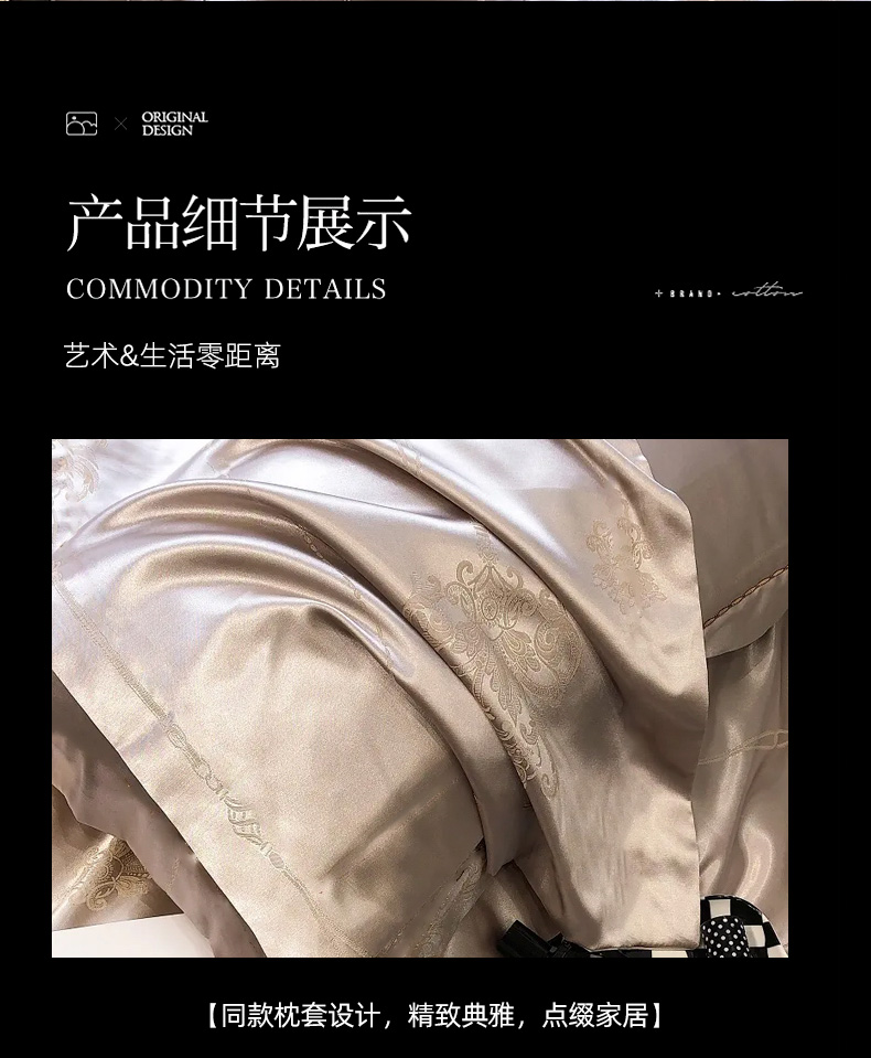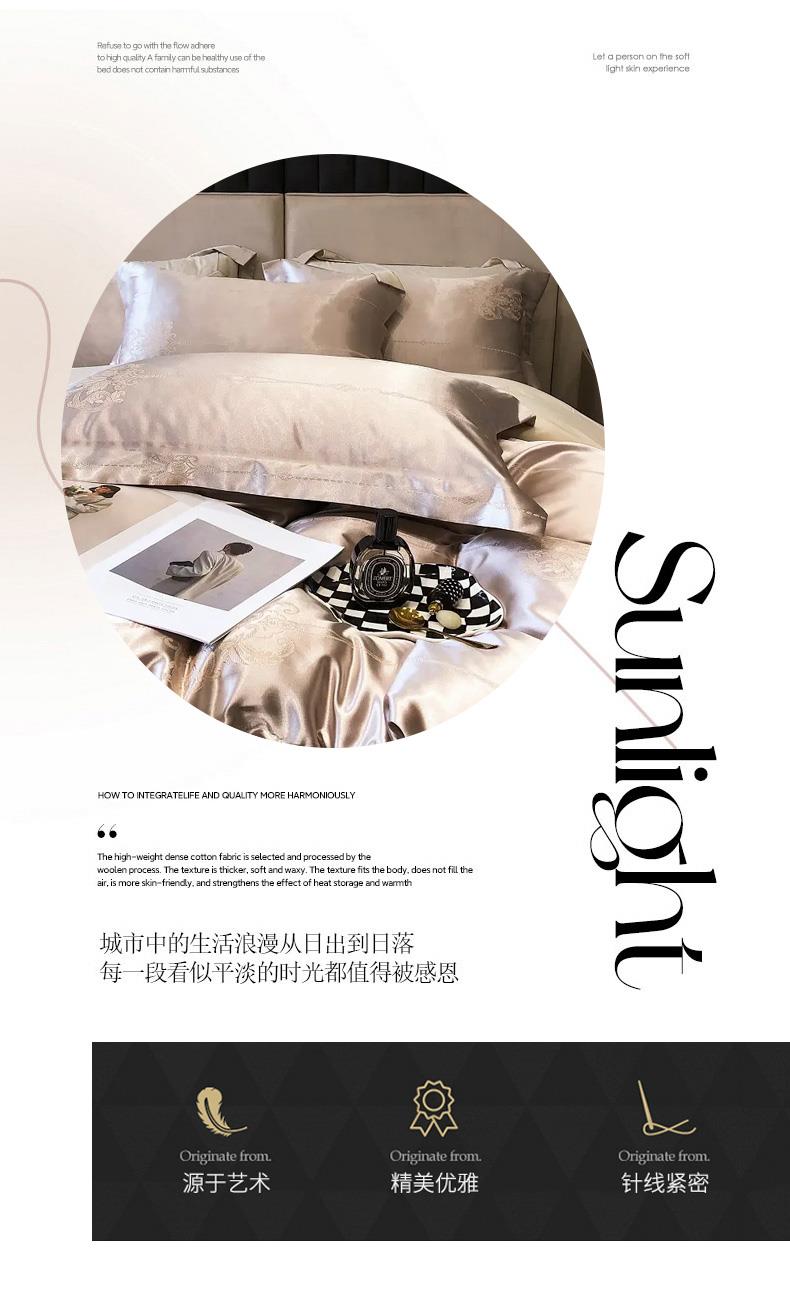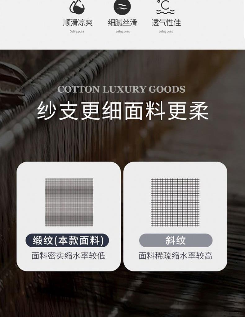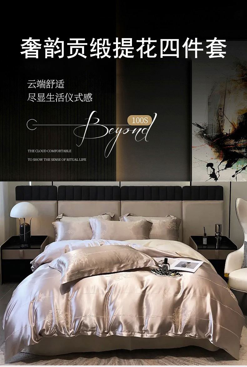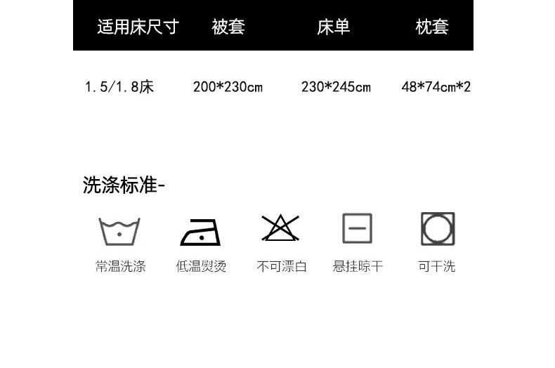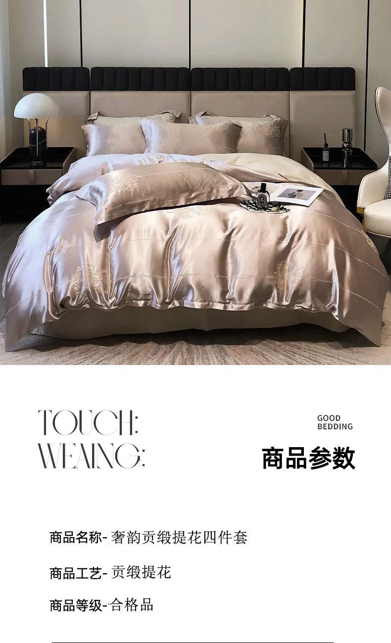 被套:200*230cm 床单:230*245cm 枕套:48*74cm*2 面料:贡缎提花 产品包装:精美礼盒 包装尺寸:42*33*11cm 1.贡缎提花面料优点在于纯色自然,简约时尚。 2.贡缎面料柔软的独特质感,细腻、爽滑、光泽度更好,手感更佳。