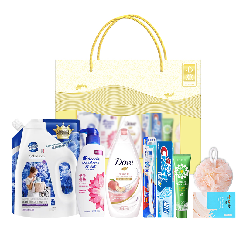 礼盒尺寸:40*13*28cm 包装尺寸:42*80*30cm 产品配置:(香型随机) 海飞丝洗发水300ml 多芬沐浴露300ml 佳洁士牙膏90g 三笑牙刷 洋甘菊护手霜75g 沐浴球 隆力奇香皂95g 蔬果园洗衣液 500g