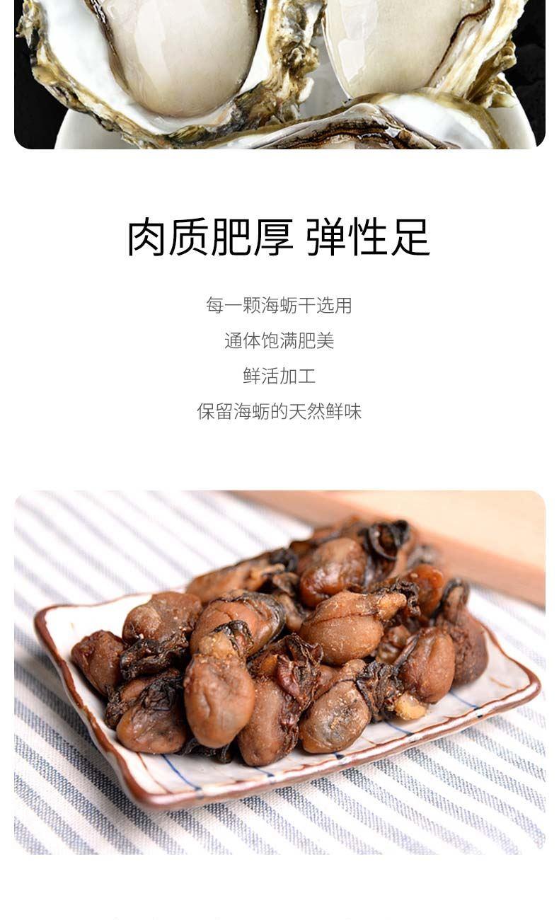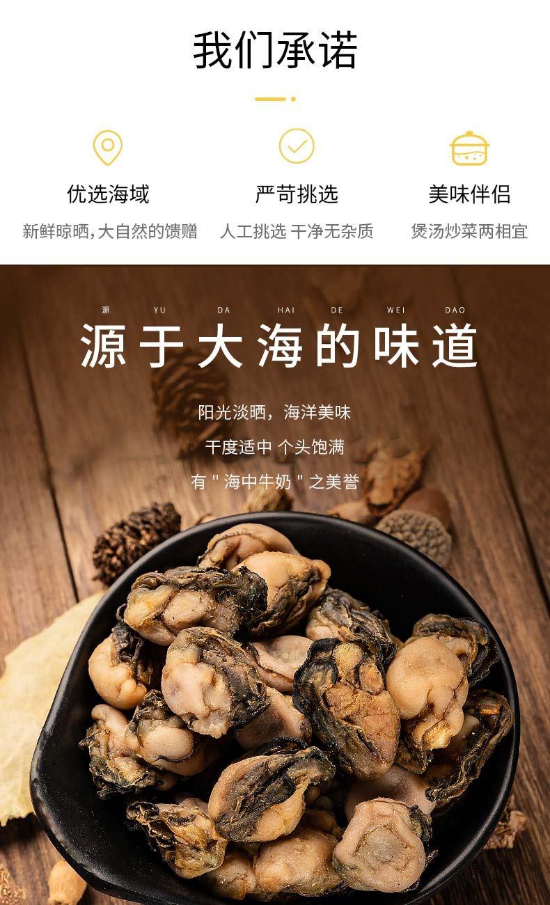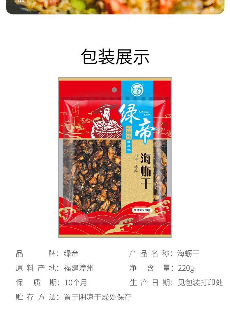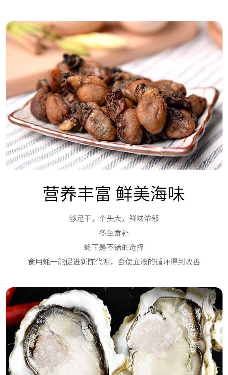 产品:海蛎干 原料产地:福建省漳州市 净含量:220克 保质期:10个月 生产日期:见包装物打印处 食用方法:用清水浸泡回软洗净后,可炖、煮、蒸等,还可为多种菜肴调出美味。 海蛎,学名牡蛎,又称海蛎子。海蛎干品味道鲜美,可烹饪出多种美食。