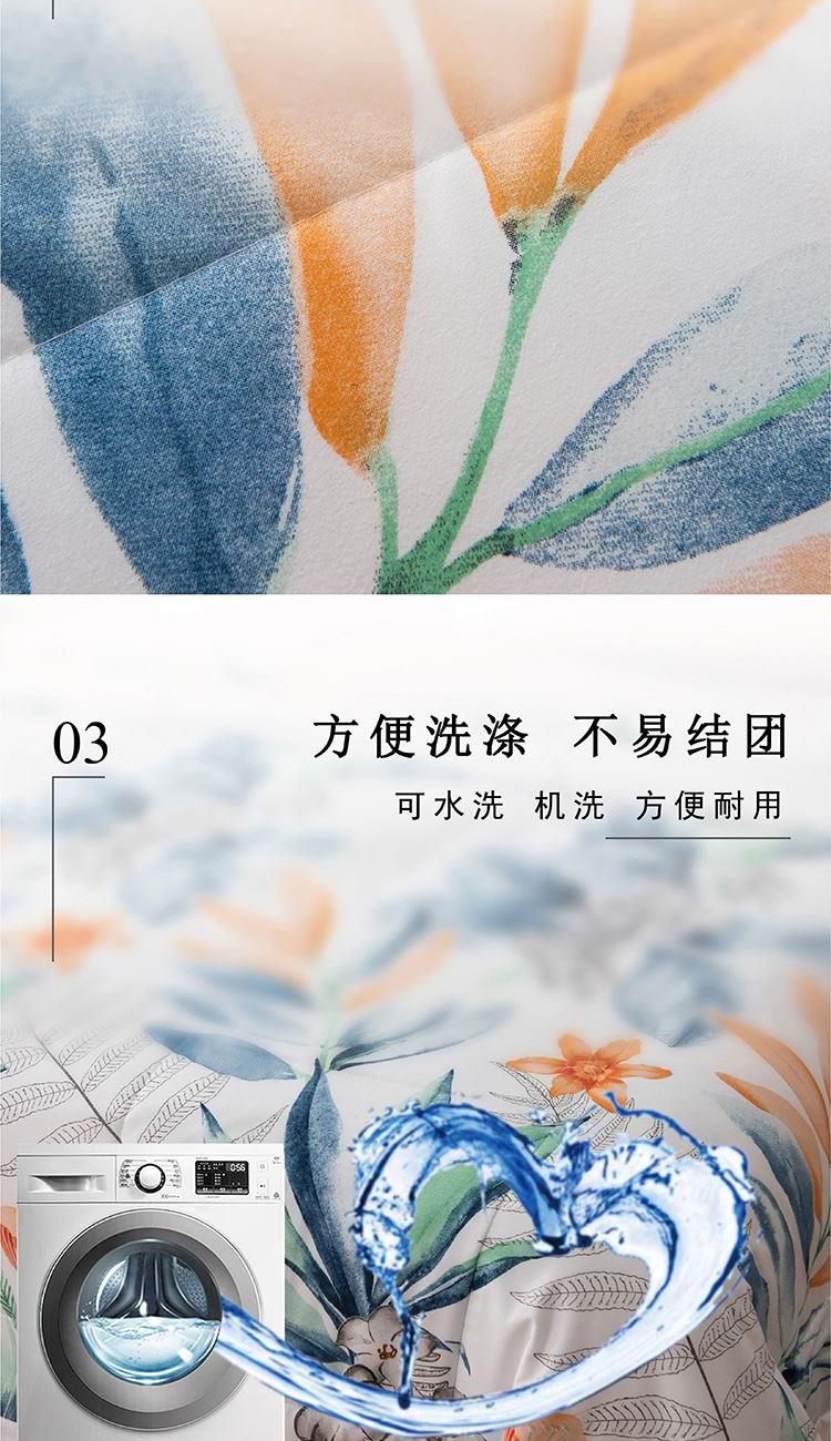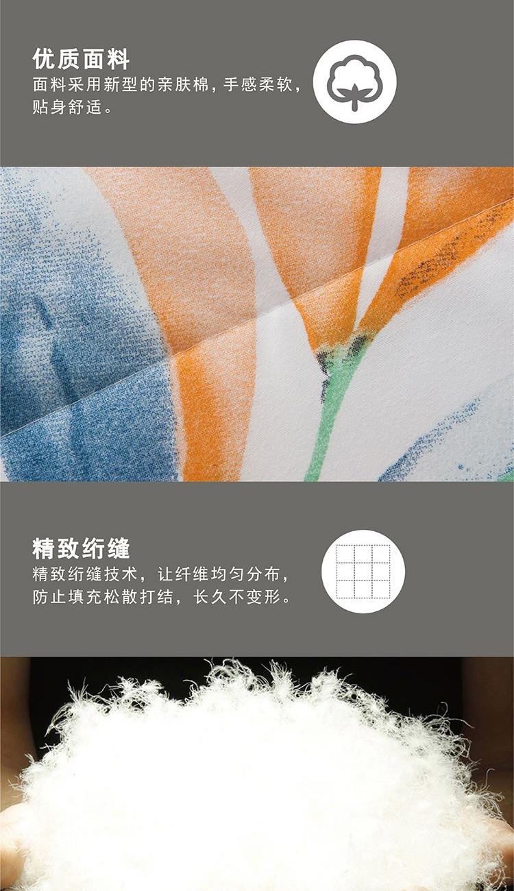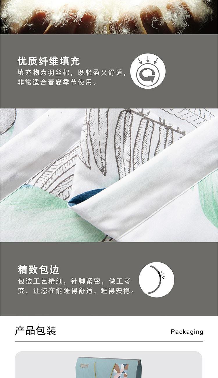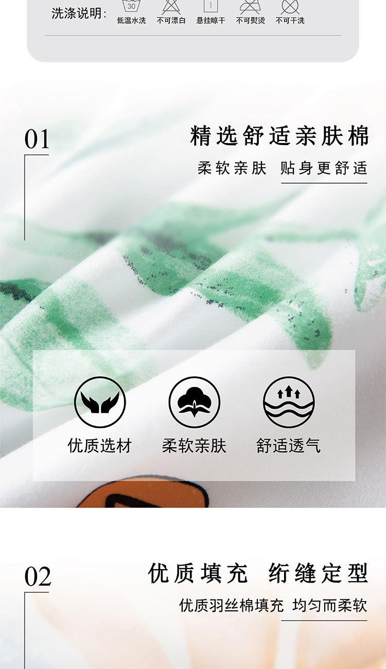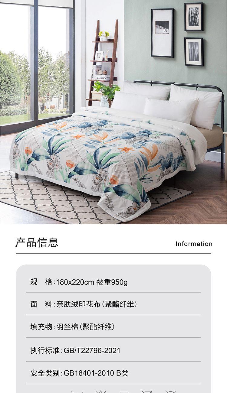 180×220cm 被重 : 950g 【面 料】亲肤绒印花布(聚酯纤维) 【填充物】整张羽丝棉(聚酯纤维) 1.亲肤绒面料,柔软亲肤,舒适贴身; 2.优质羽丝棉整张填充,绗缝定型,均匀柔软; 3.方便洗涤,不易结团,耐用。